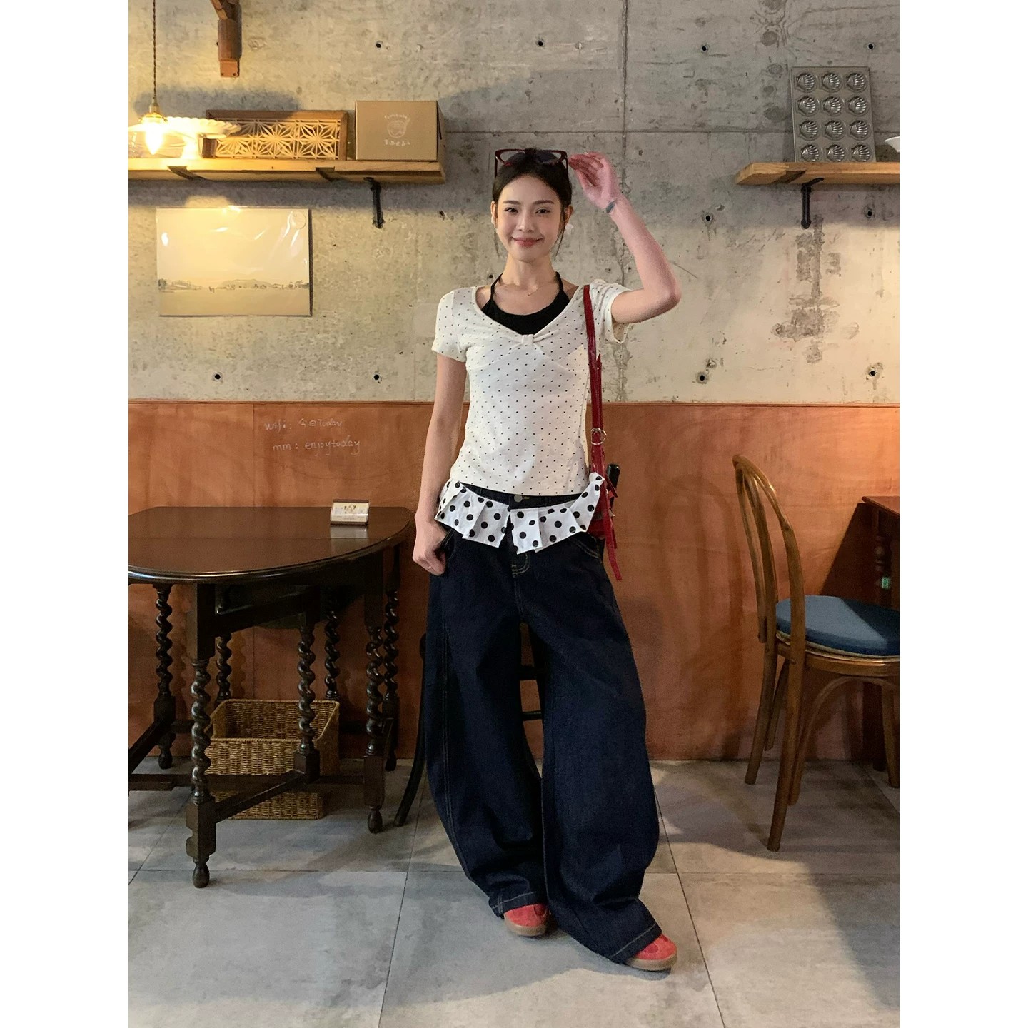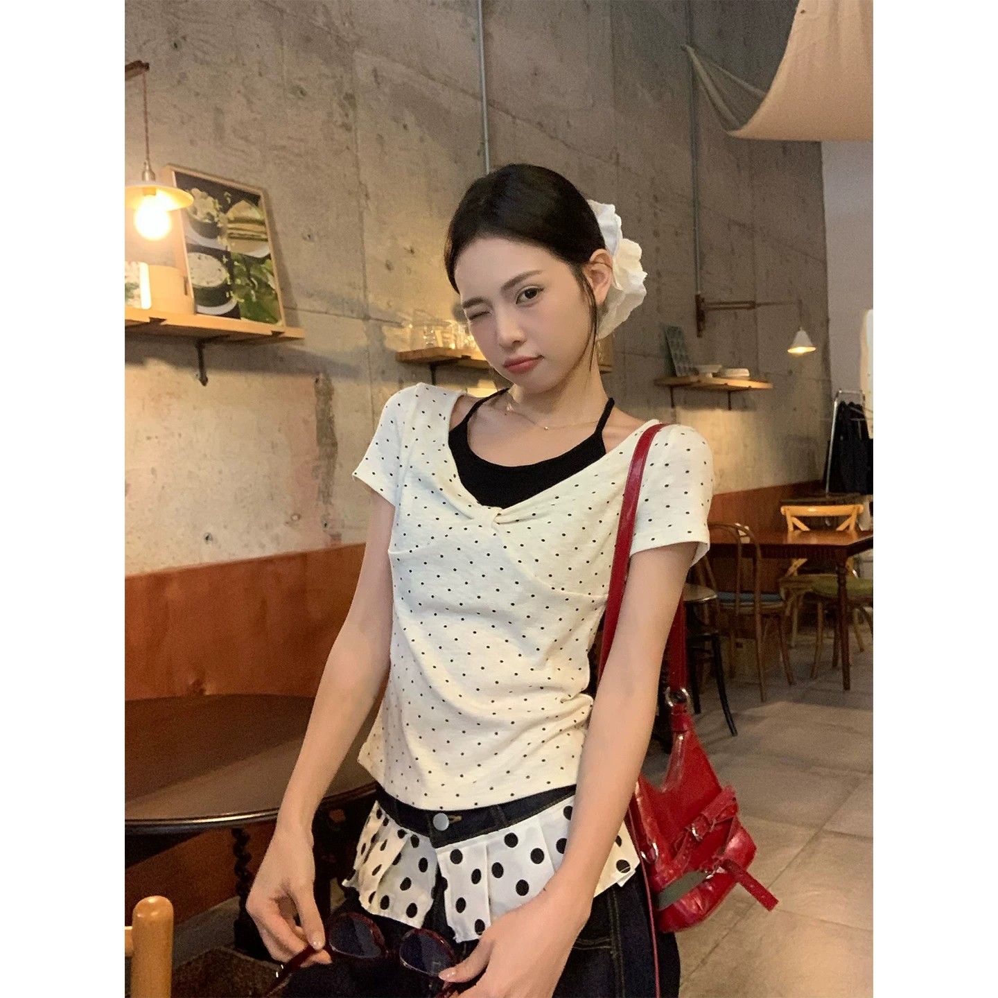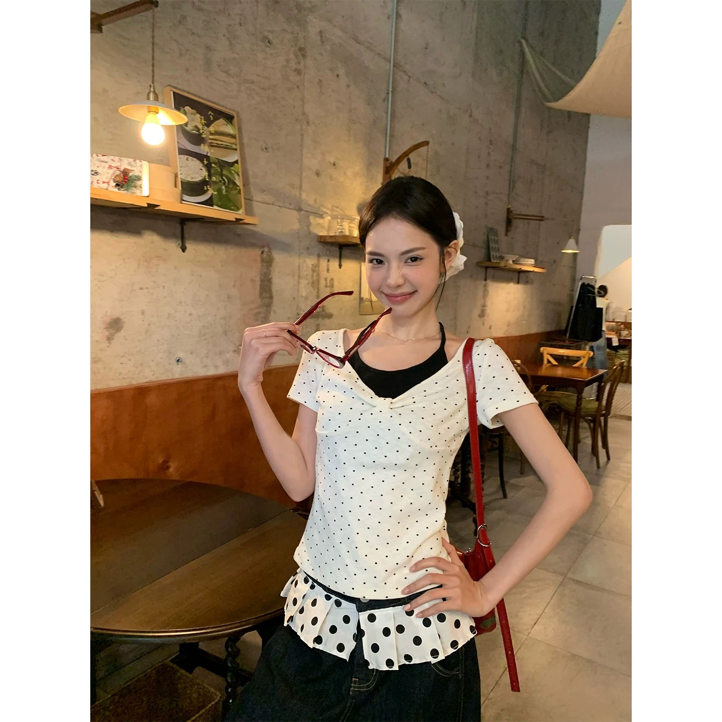 260 그램 사람들 면 2026 여름 검정색 도트 무늬 V넥 티셔츠 달콤함 레트로 디자인 센스 핫걸 바람 캐주얼 맨위
