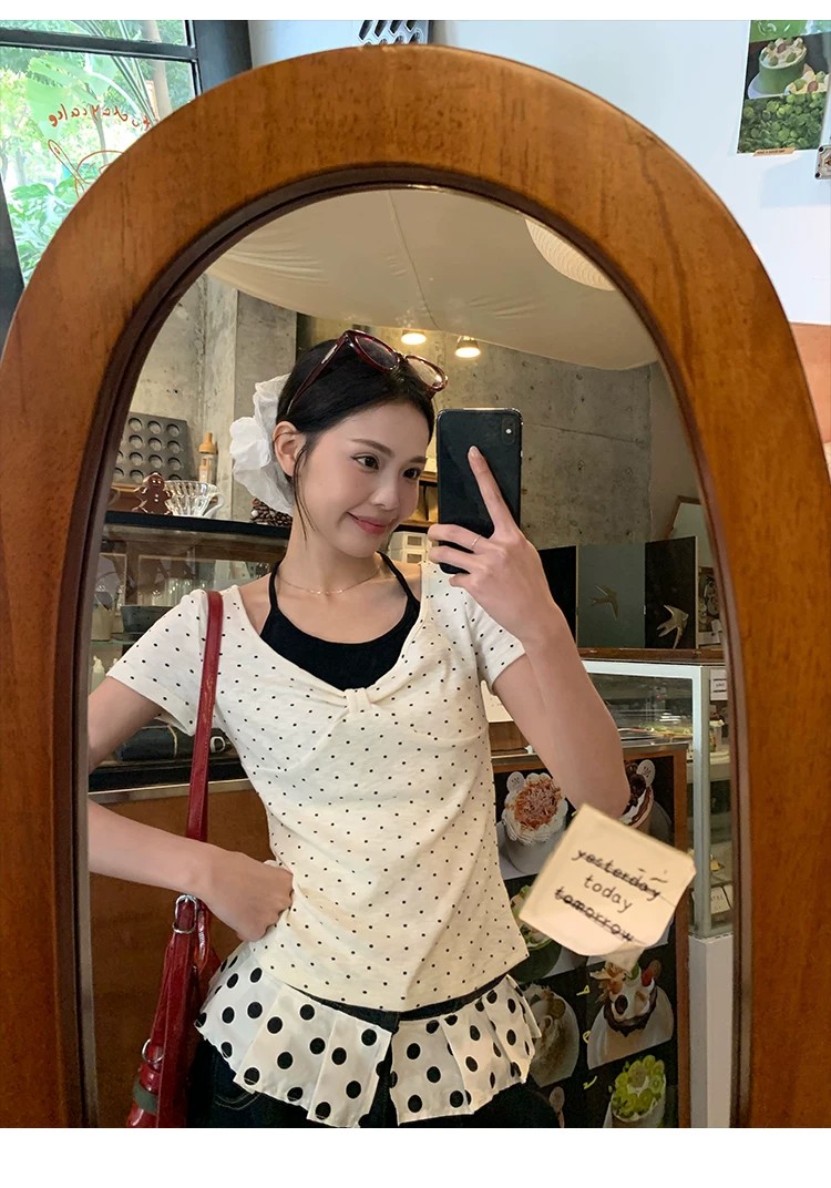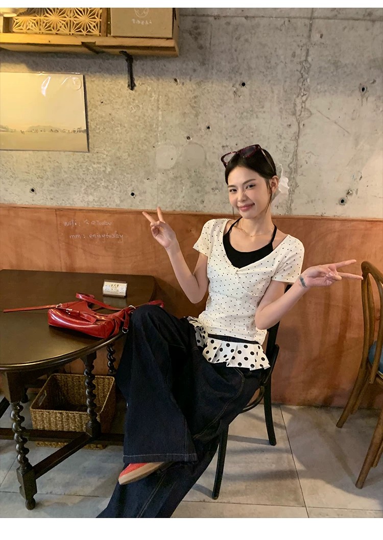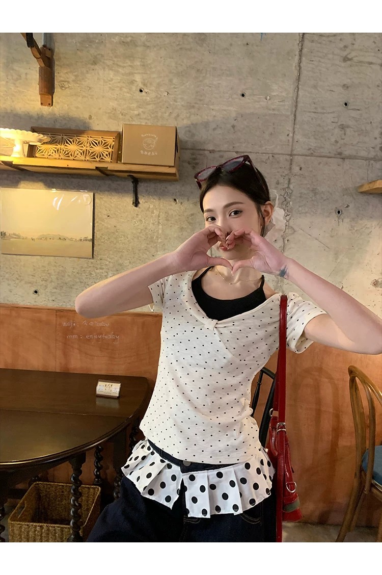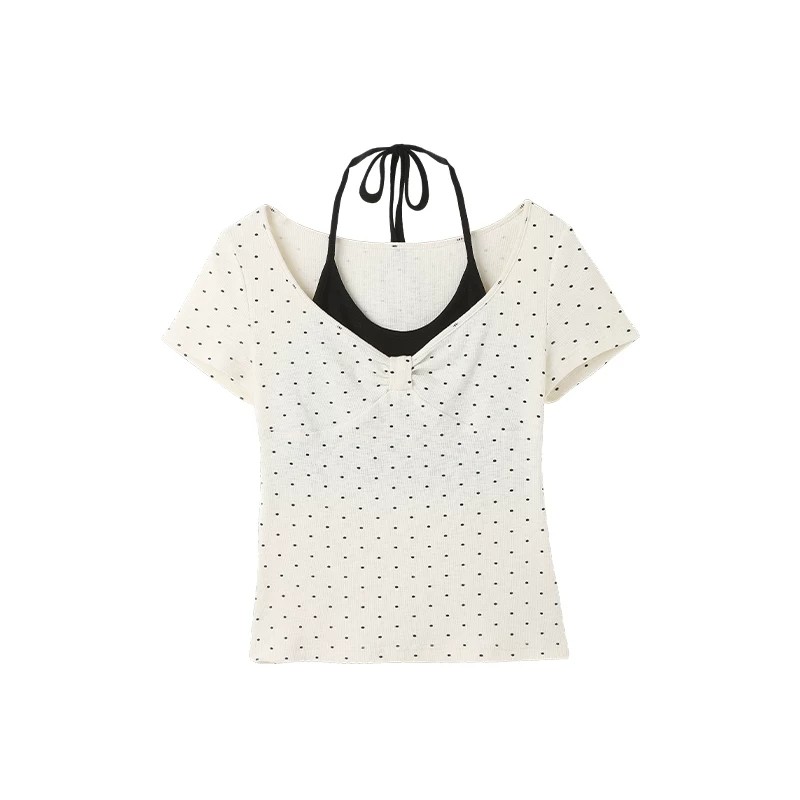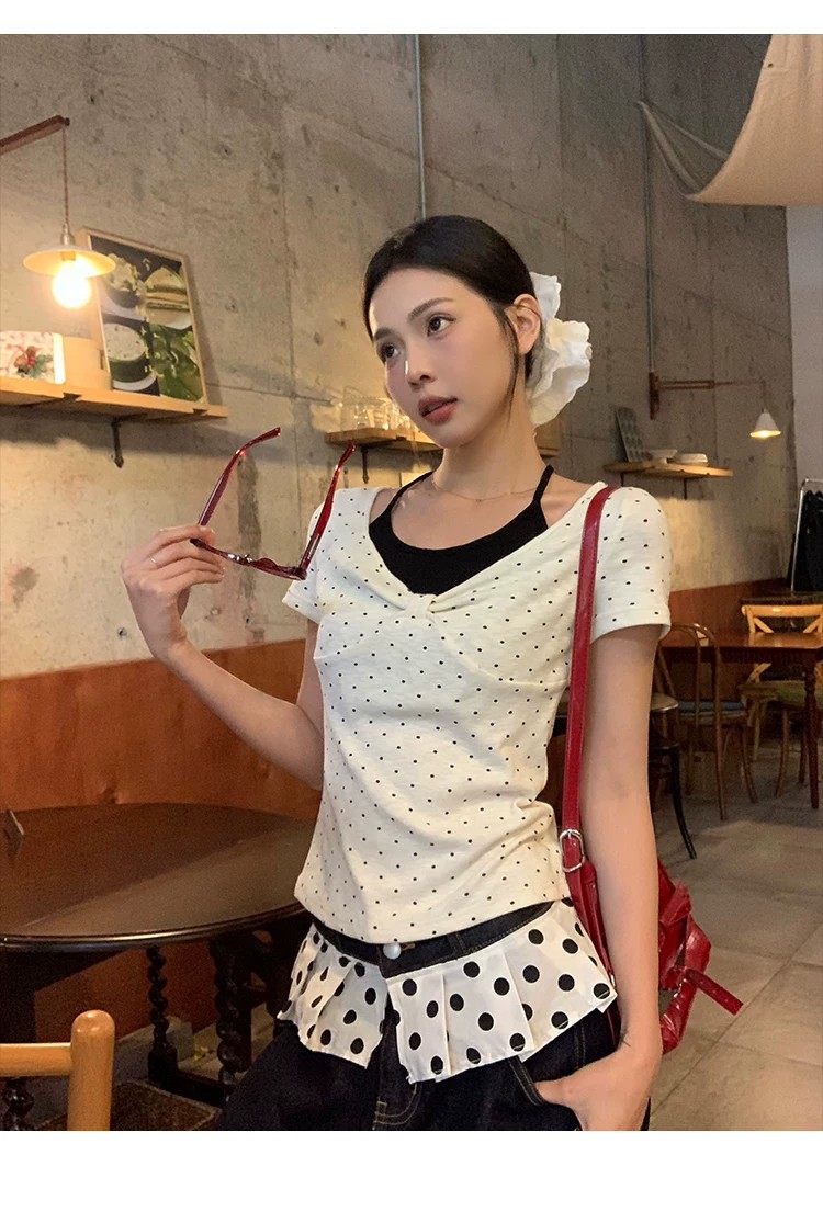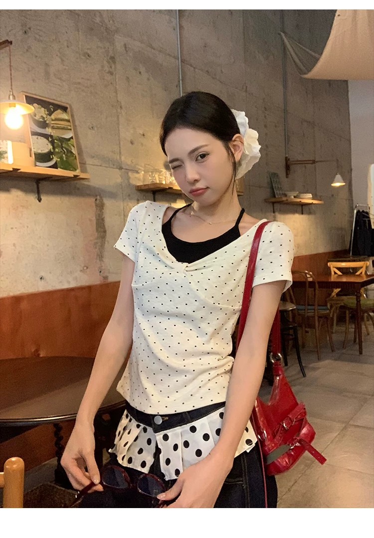 260 그램 사람들 면 화이트 도트 무늬 페이크 레이어드 행침 목 긍정적 인 어깨 반팔 티셔츠 여성 여름 몸매 가꾸기 한 첨부 된 의류
