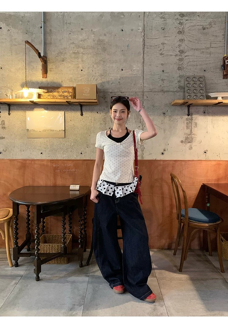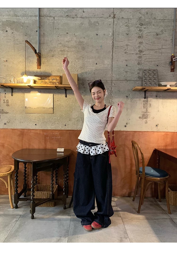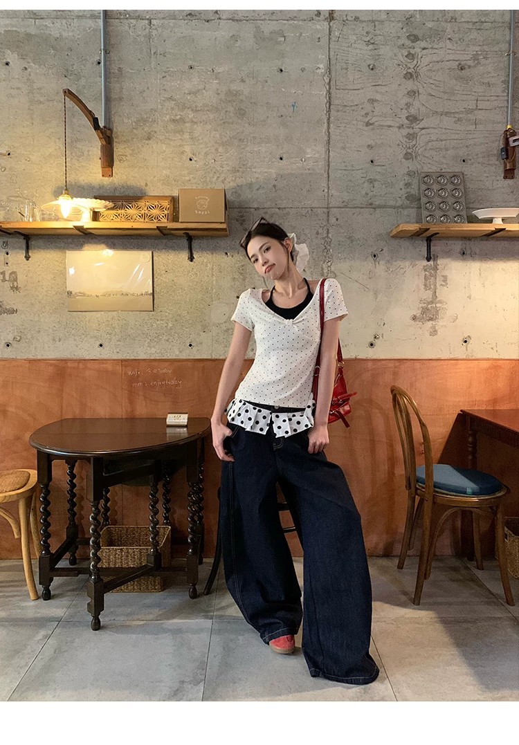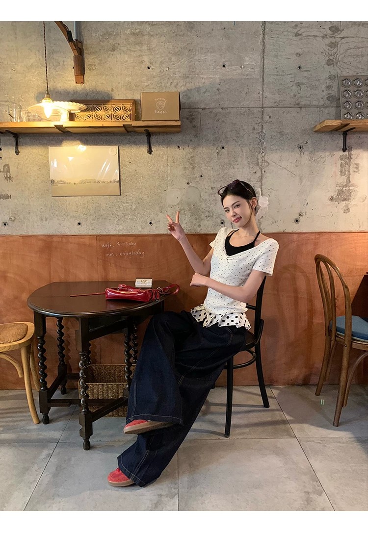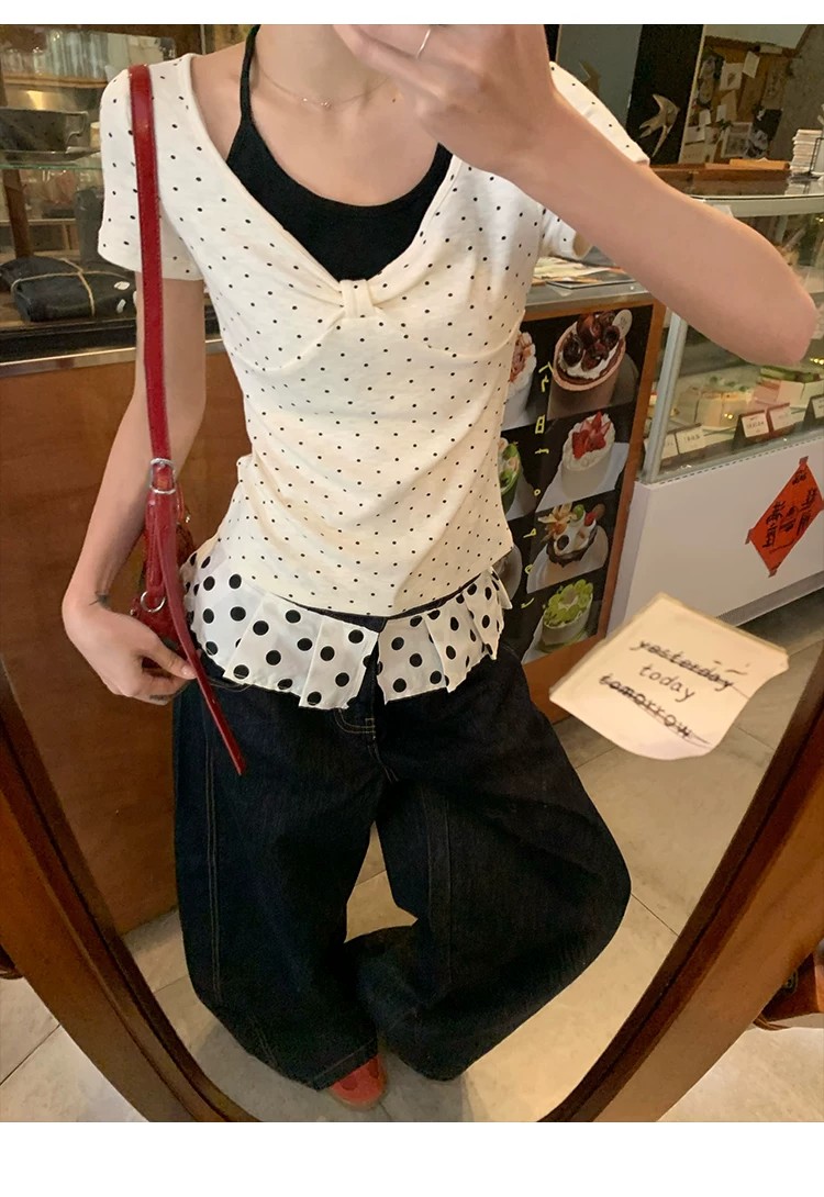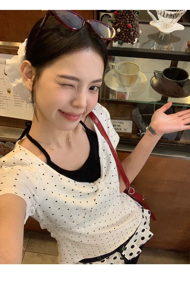 260 그램 사람들 면 화이트 도트 무늬 페이크 레이어드 행침 목 긍정적 인 어깨 반팔 티셔츠 여성 여름 몸매 가꾸기 한 첨부 된 의류