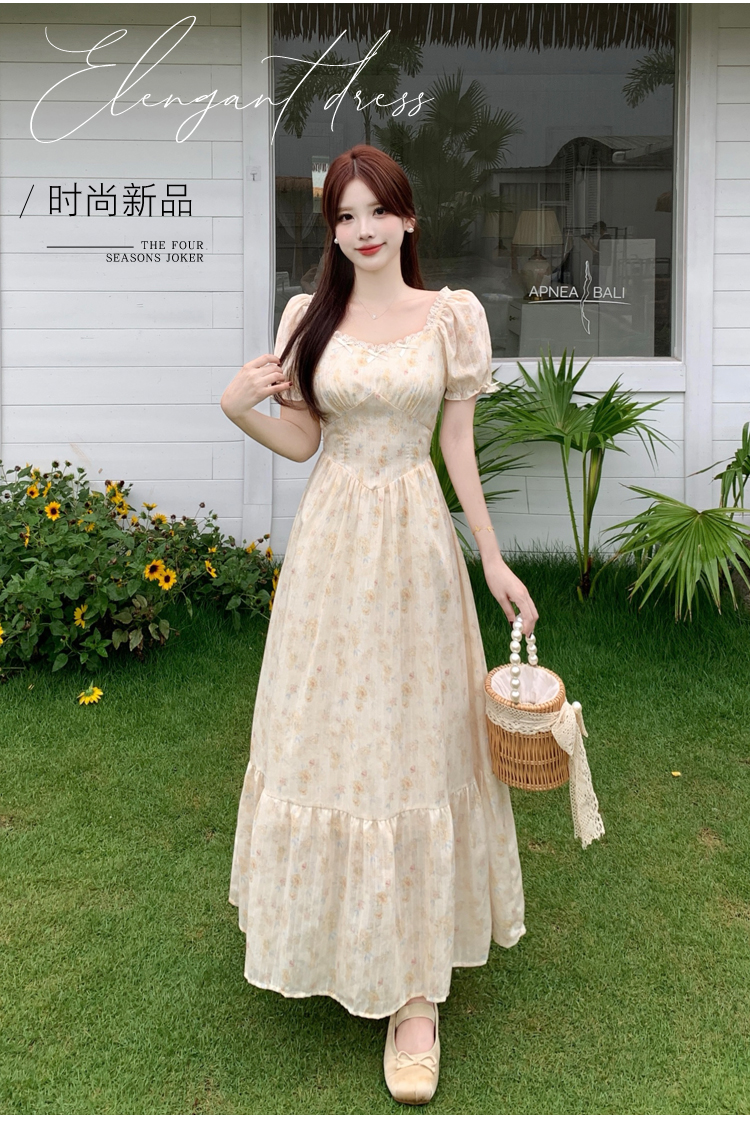 실사 빅 사이즈 여성 의류 이상적인 치마 프랑스식 낭만주의 꽃무늬 드레스 V넥 허리 수축 슬림해 보이는 휴가 바람 치마