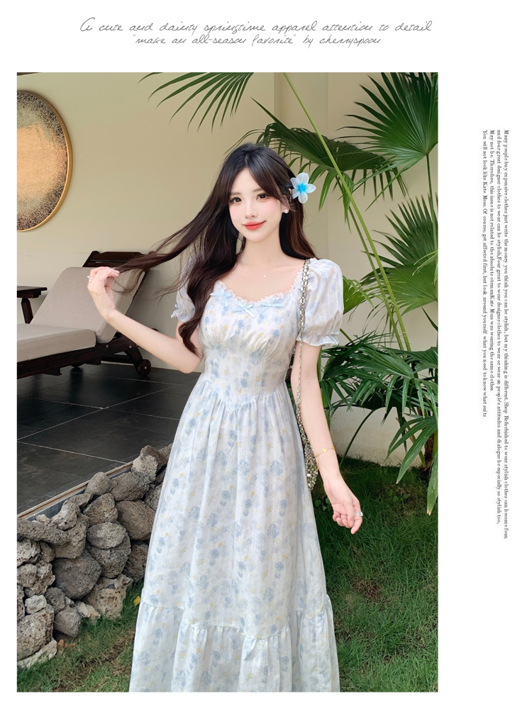 실사 빅 사이즈 여성 의류 프랑스식 부드러운 관대 한 점잖은 아름다운 파란색 꽃무늬 드레스 허리 수축 품격 휴가 치마