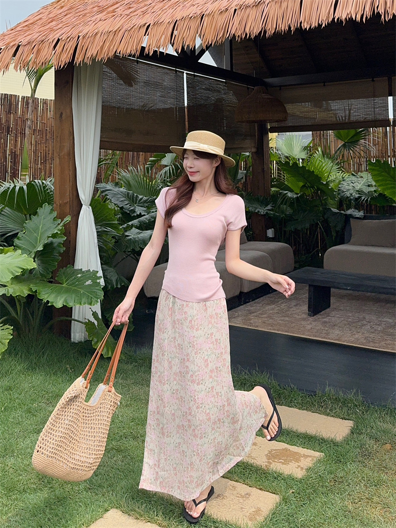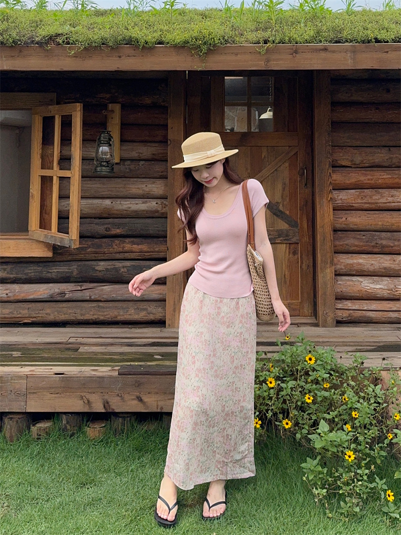 실사 정가 여름 다용도 단색 u 칼라 니트 반팔 맨위 꽃무늬 반신 스커트 투피스 세트