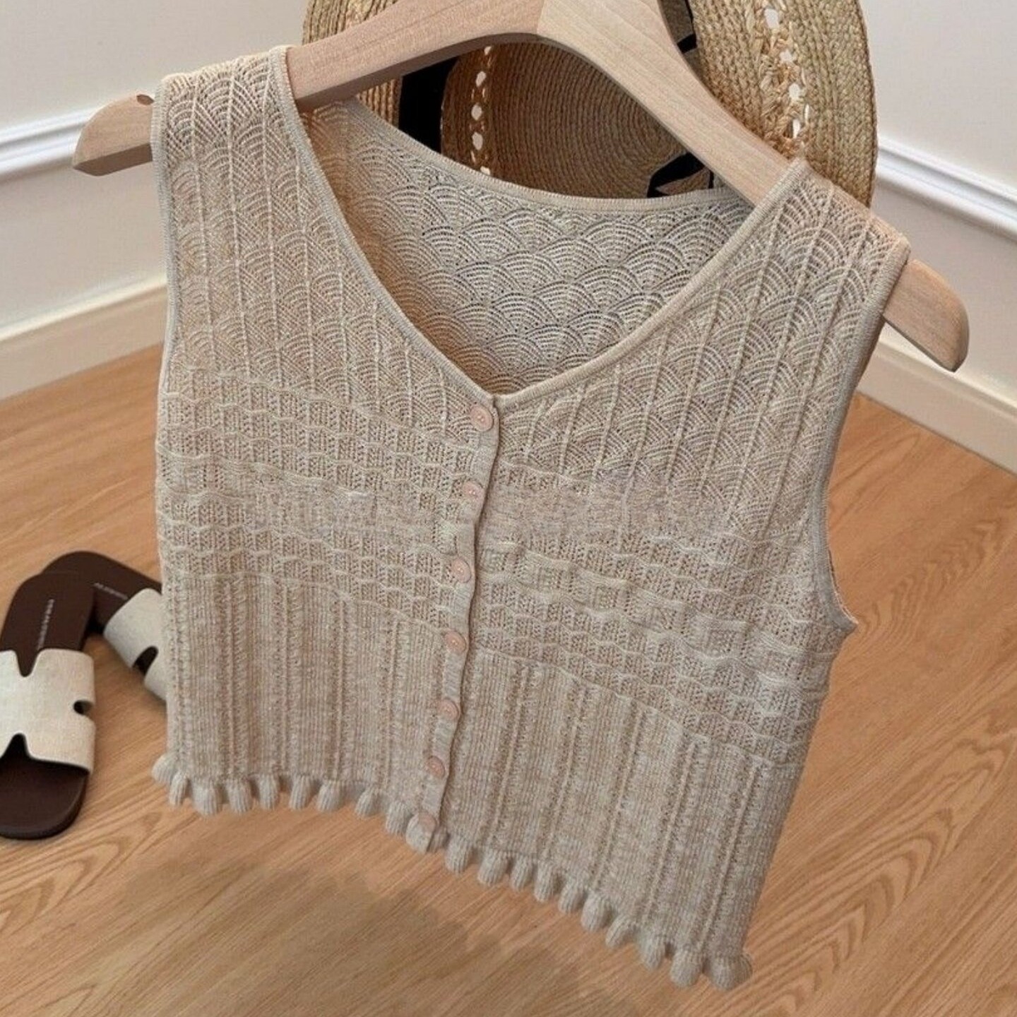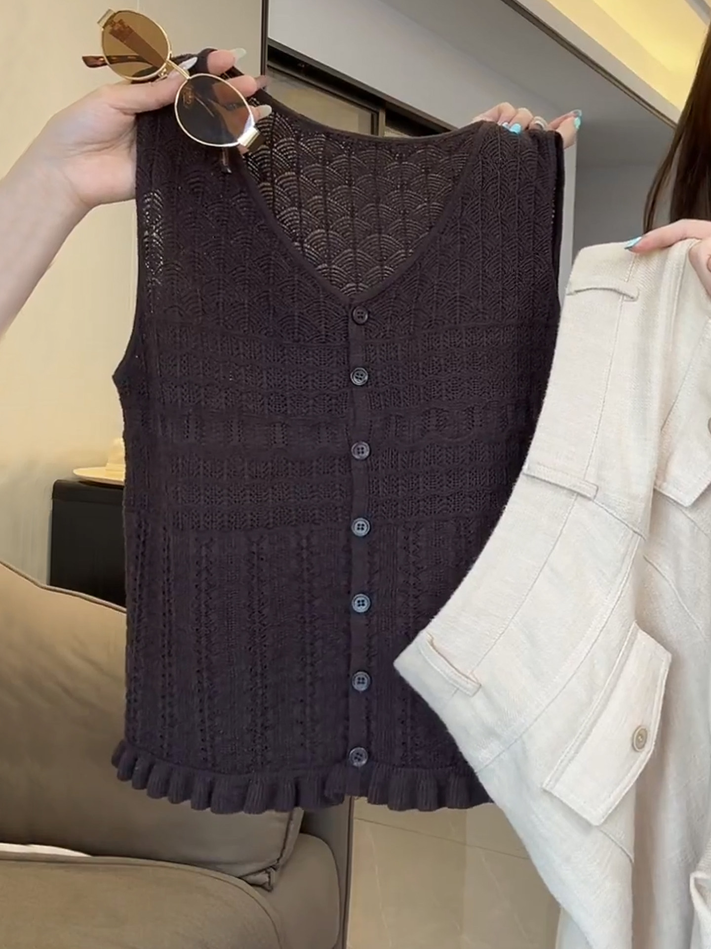 레이스 V넥 홀로우 아웃 민소매 니트 조끼 여성 여름 2026 년 새로운 한 부서 외출용 쇼트 스타일 맨위