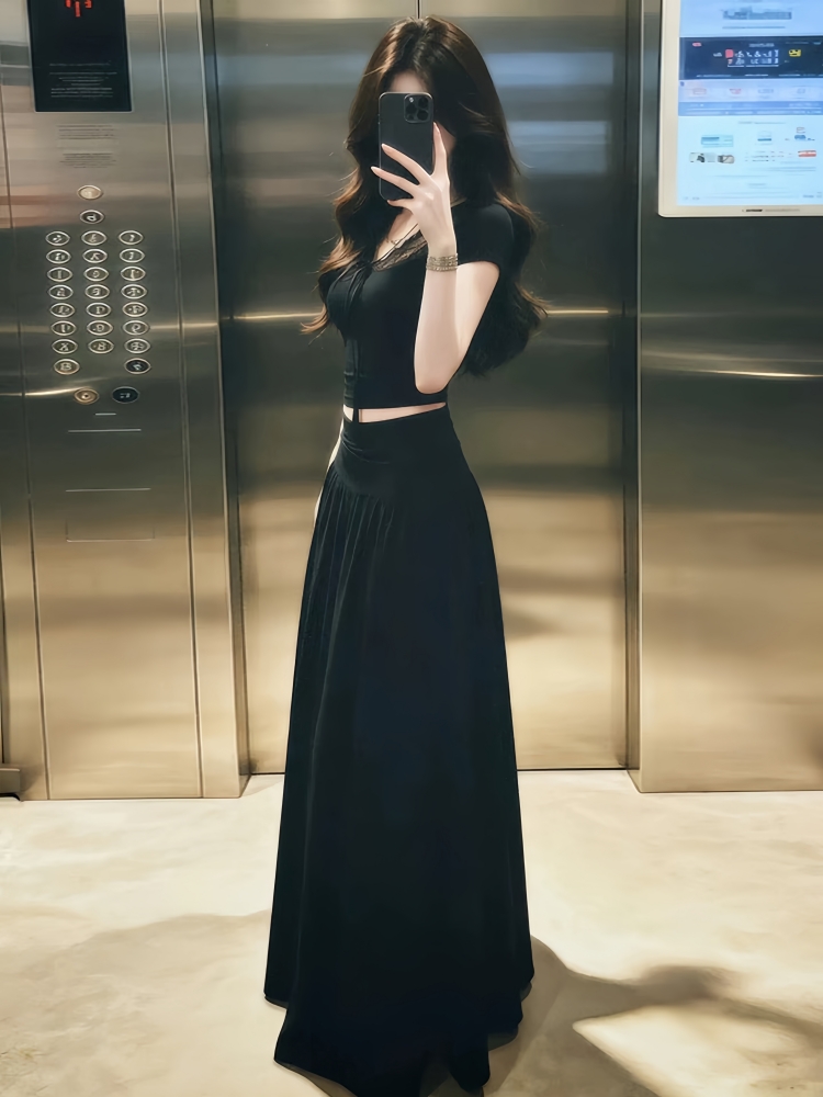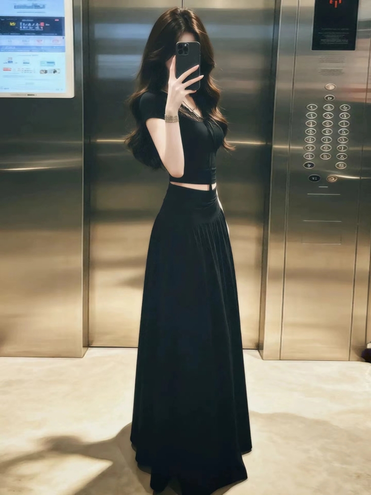 여름 드레스 코디 전체 집합 패션 한 부서 디자인 센스 작은 대중 V넥 반팔 맨위 하프 길이 치마 투피스 세트