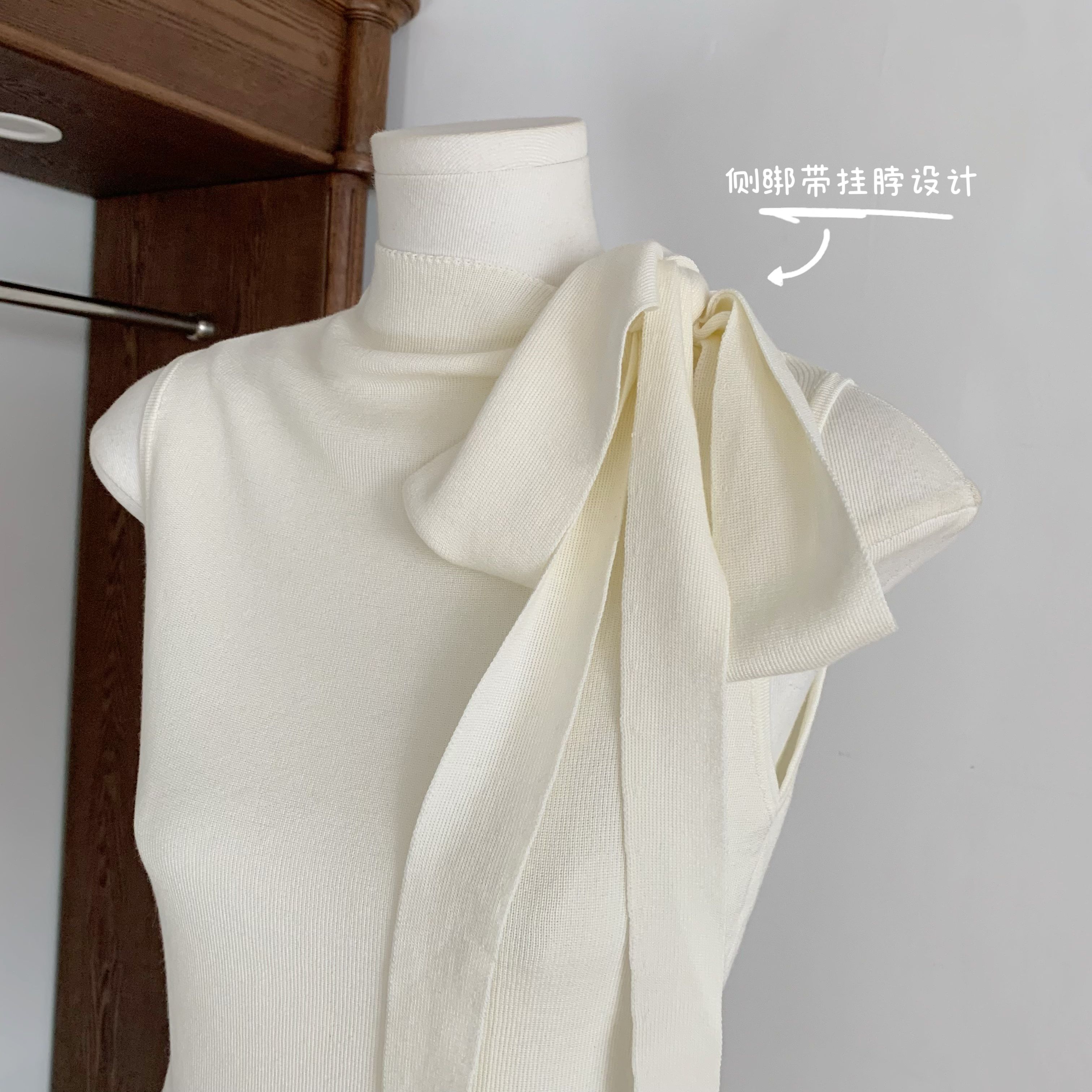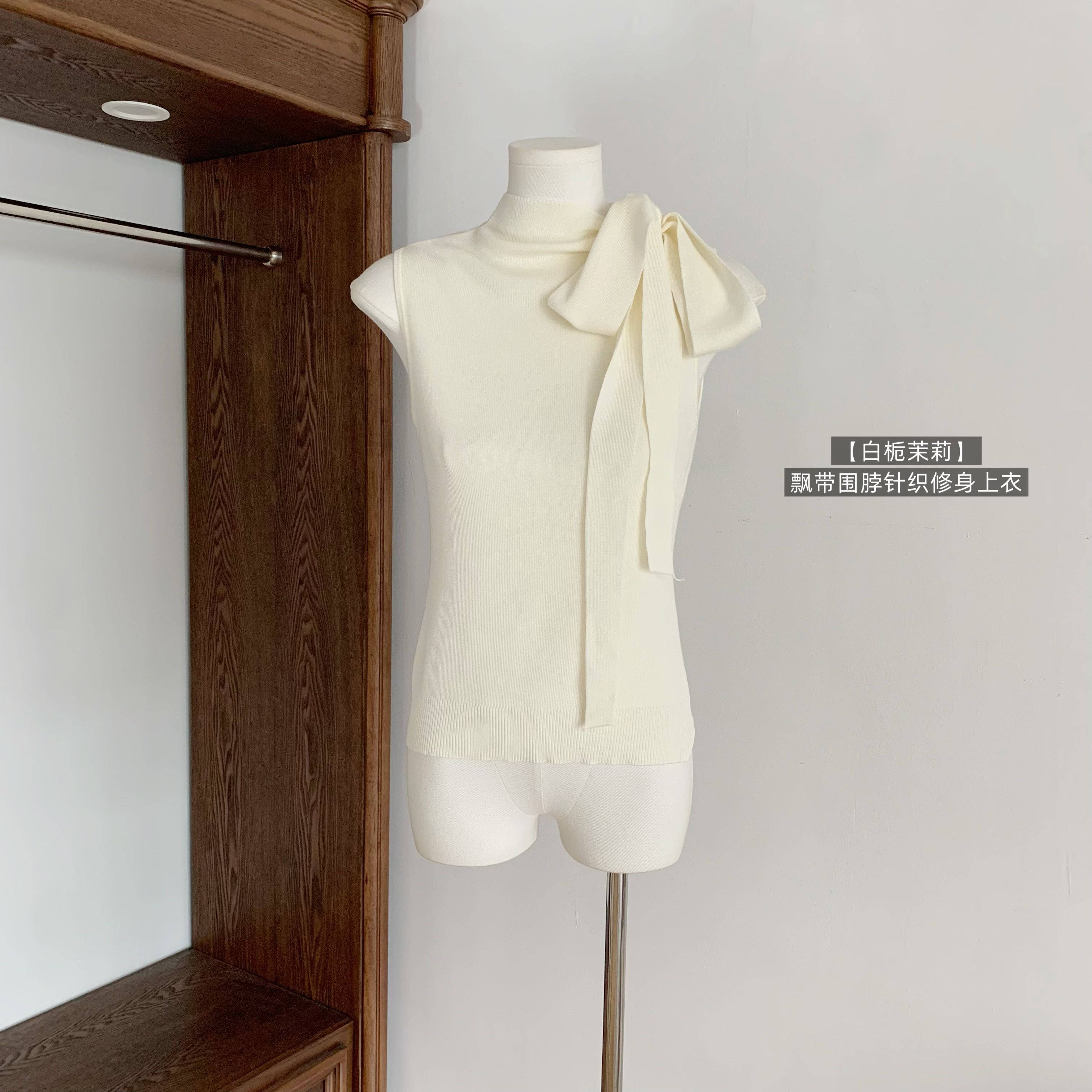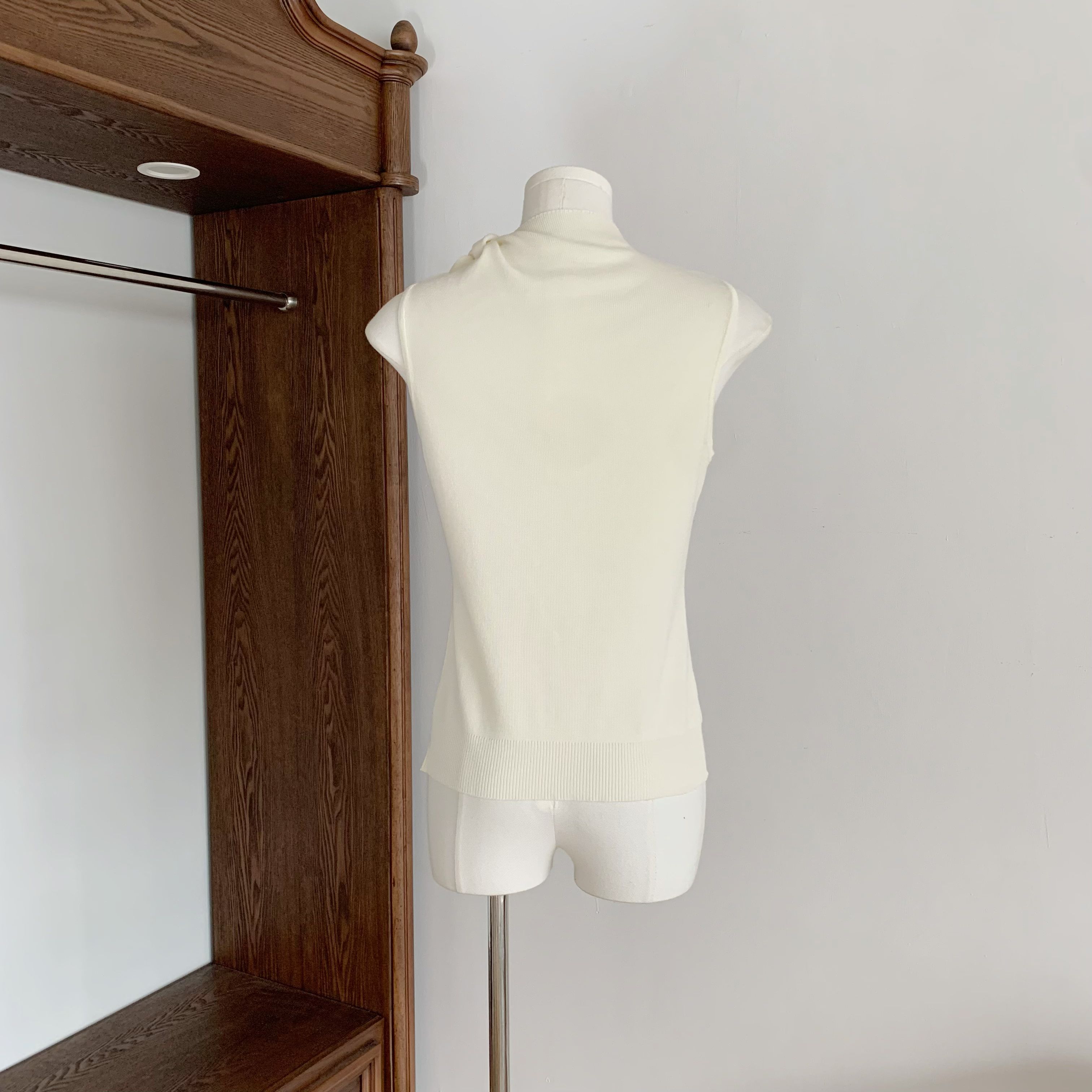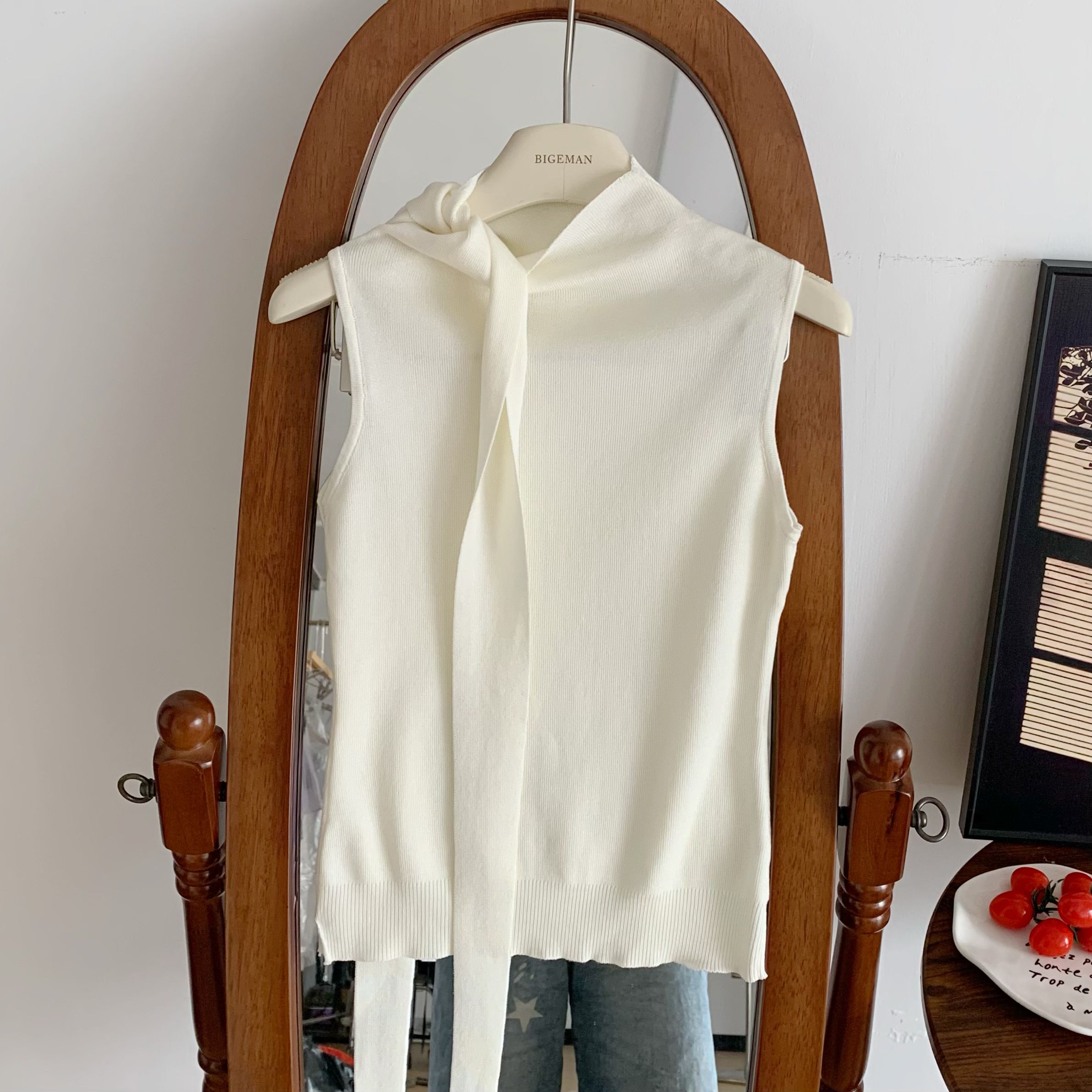 4 27 20 00chill 챠오어 화이트 치자 나무 재스민 리본 목도리 니트 몸매 가꾸기 슬림해 보이는 조끼 맨위