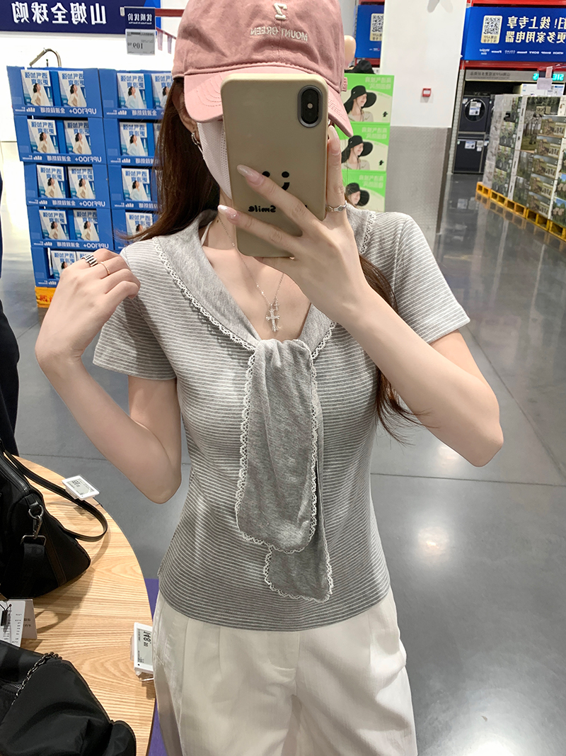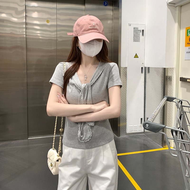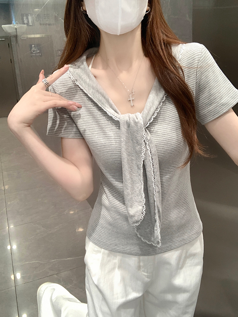 한국 고급 센스 반팔 티셔츠 여성 의류 여름 새로운 리본 나비 매듭 슬림해 보이는 라운드 넥 맨위