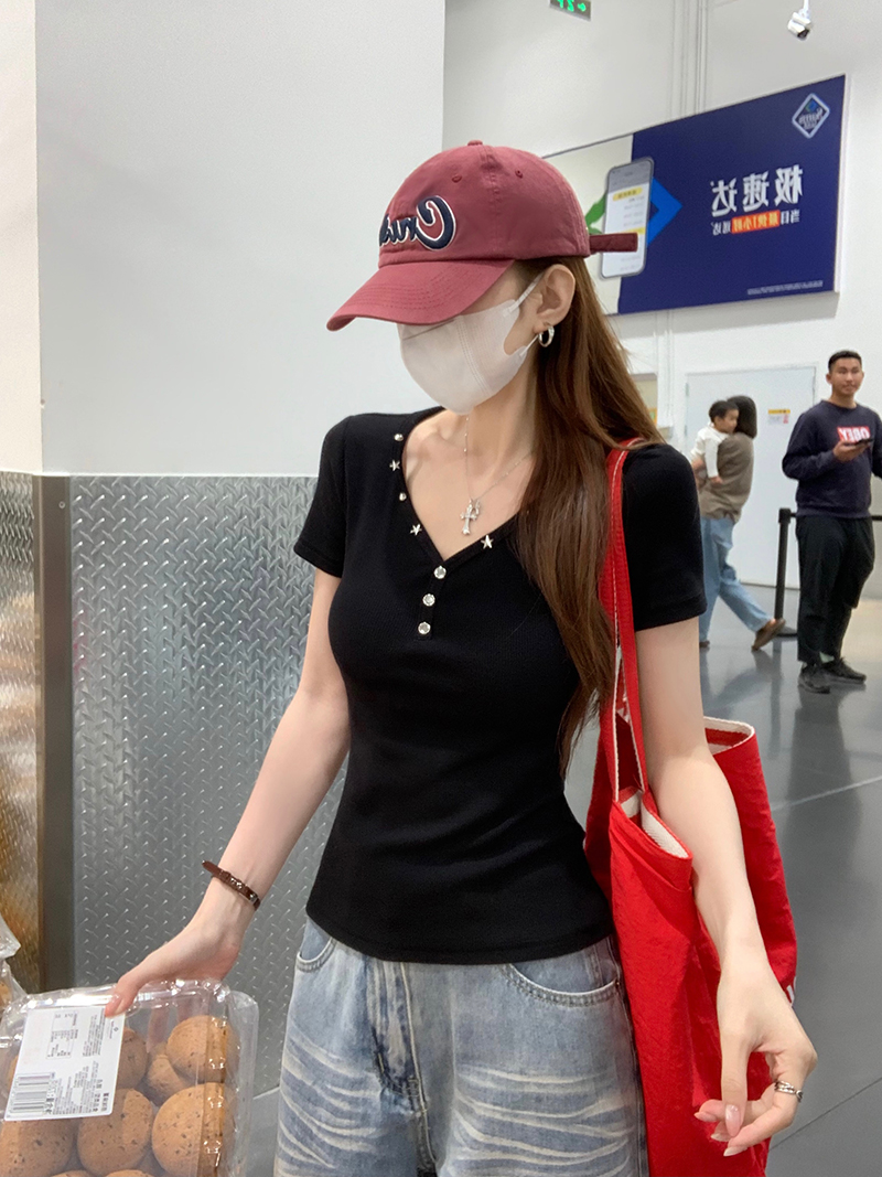 한국 반팔 티셔츠 여성 여름 새로운 디자인 센스 단추 한 부서 긍정적 인 어깨 슬림해 보이는 V넥 맨위