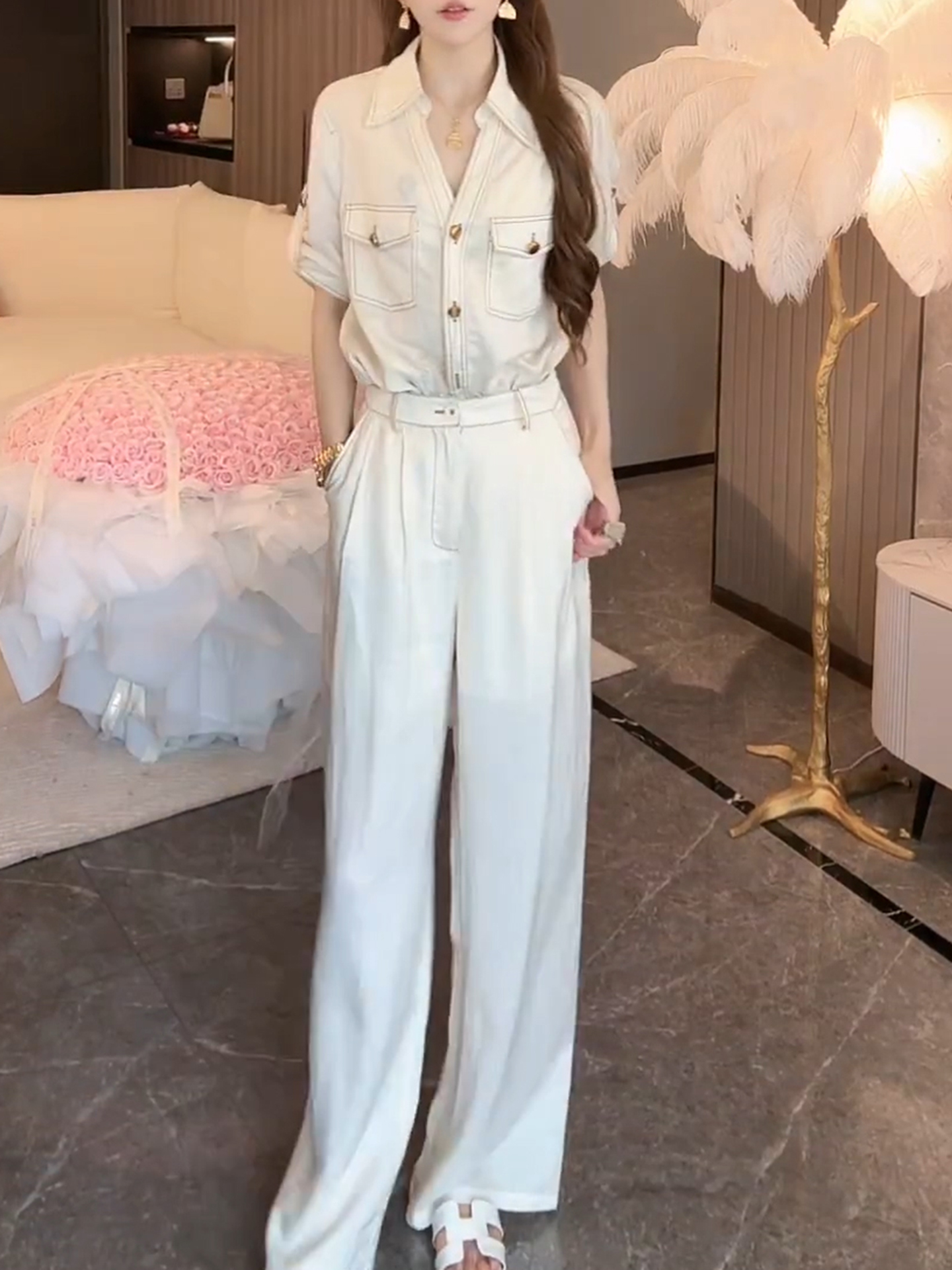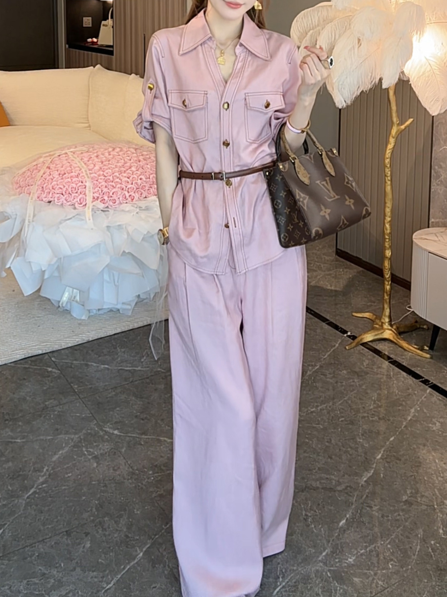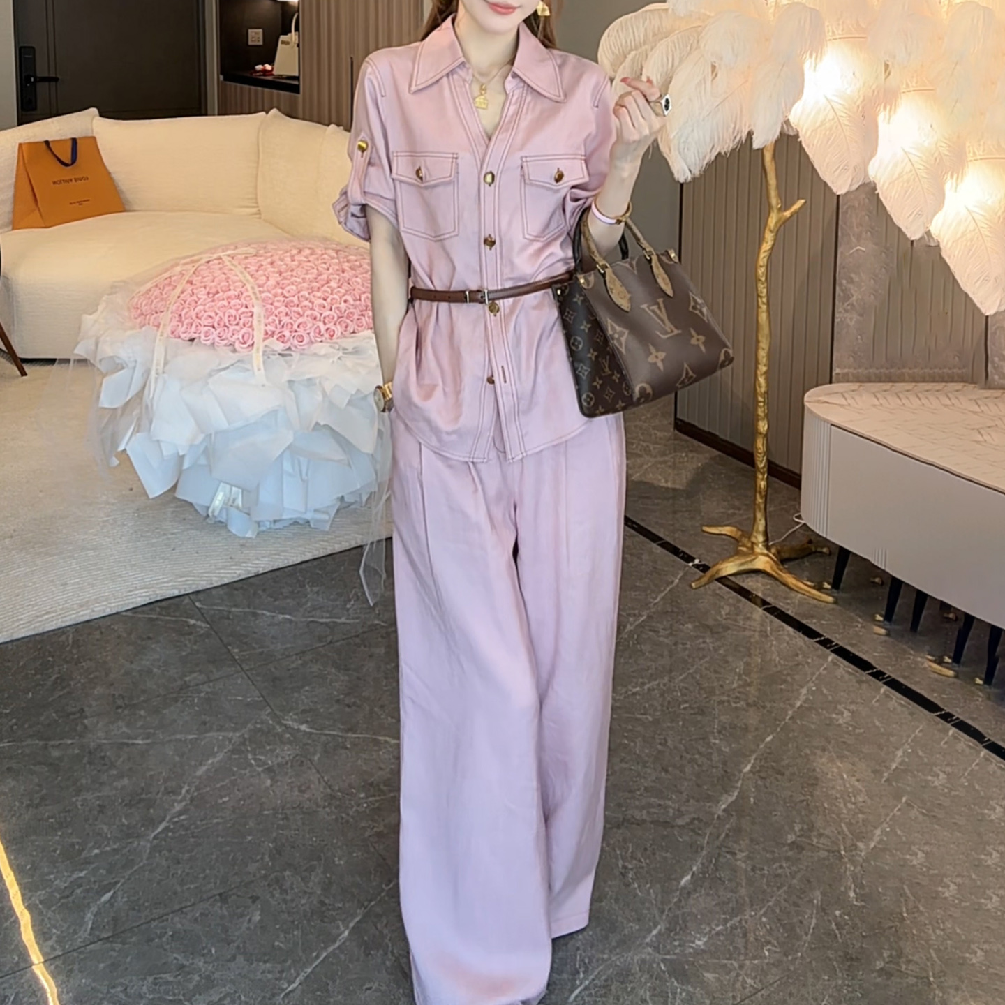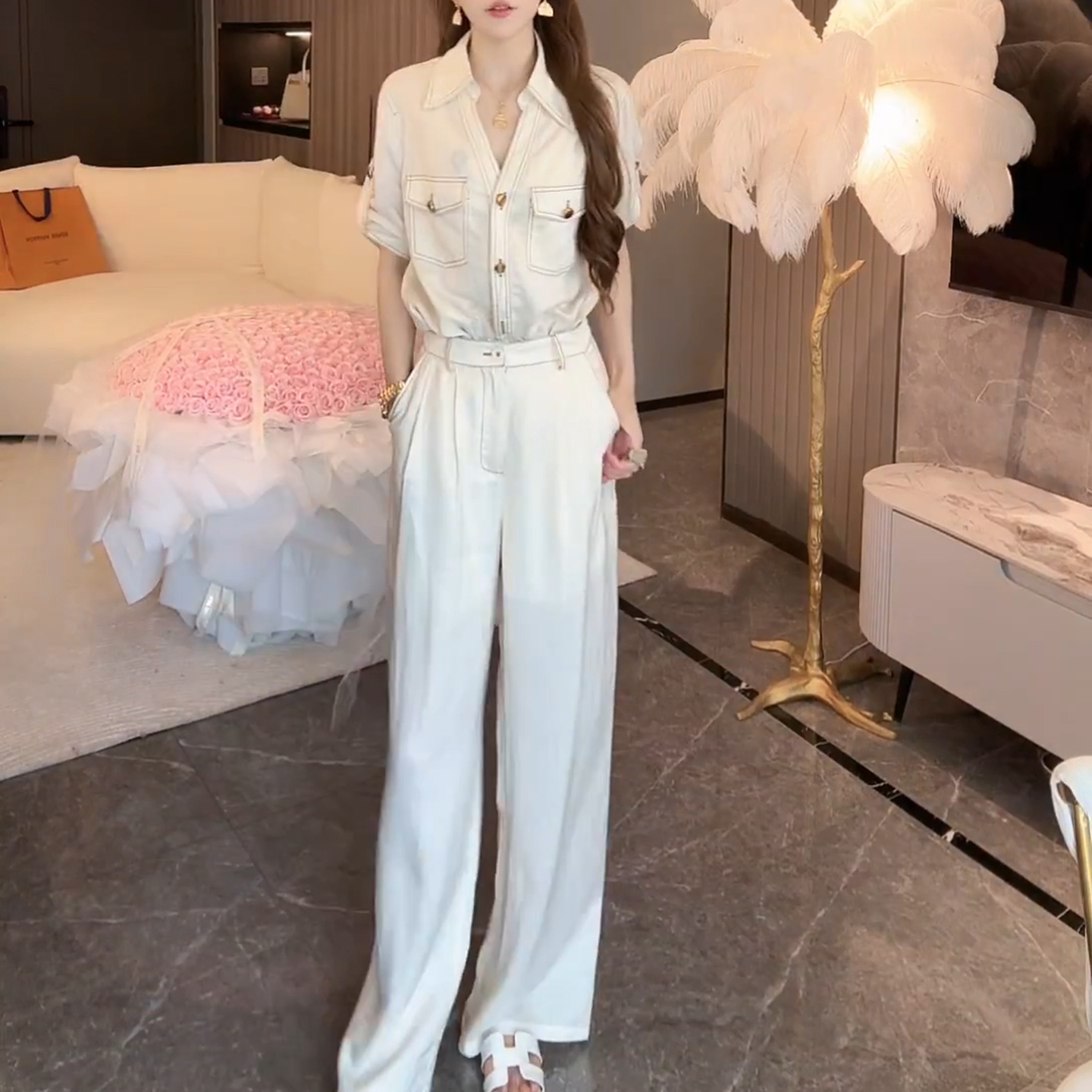 경관 그림 외국 가스 출퇴근 빛 럭셔리 패션 슬림해 보이는 전체 집합 여름 폴로 칼라 셔츠 하이웨이스트 와이드 레그 팬츠 투피스 세트