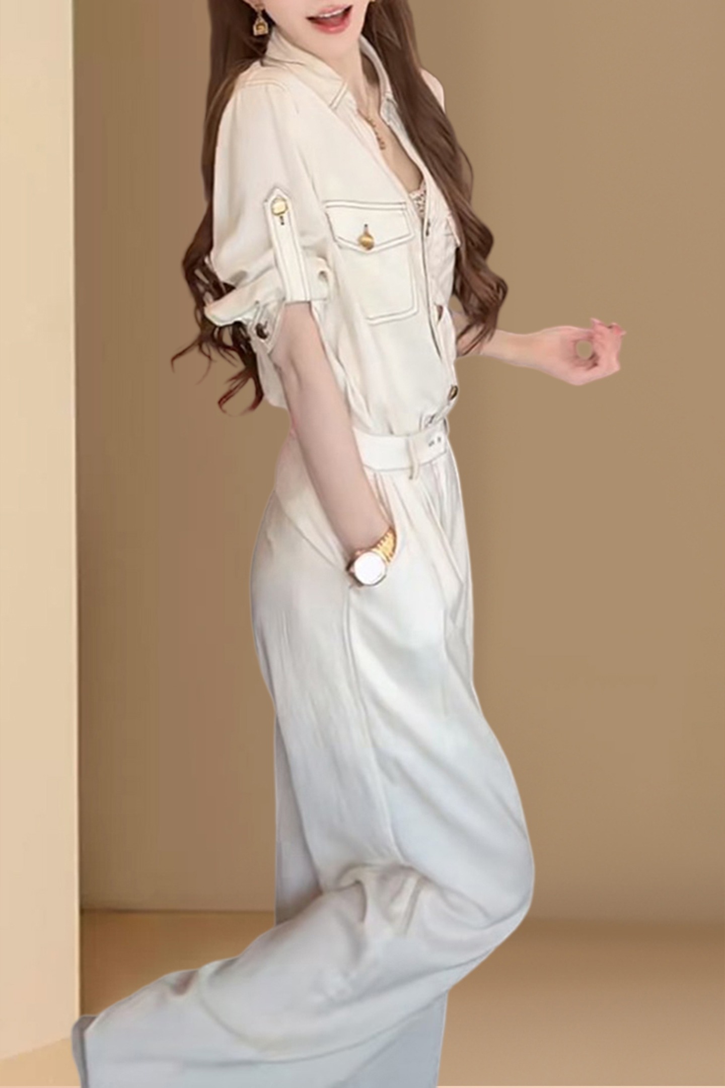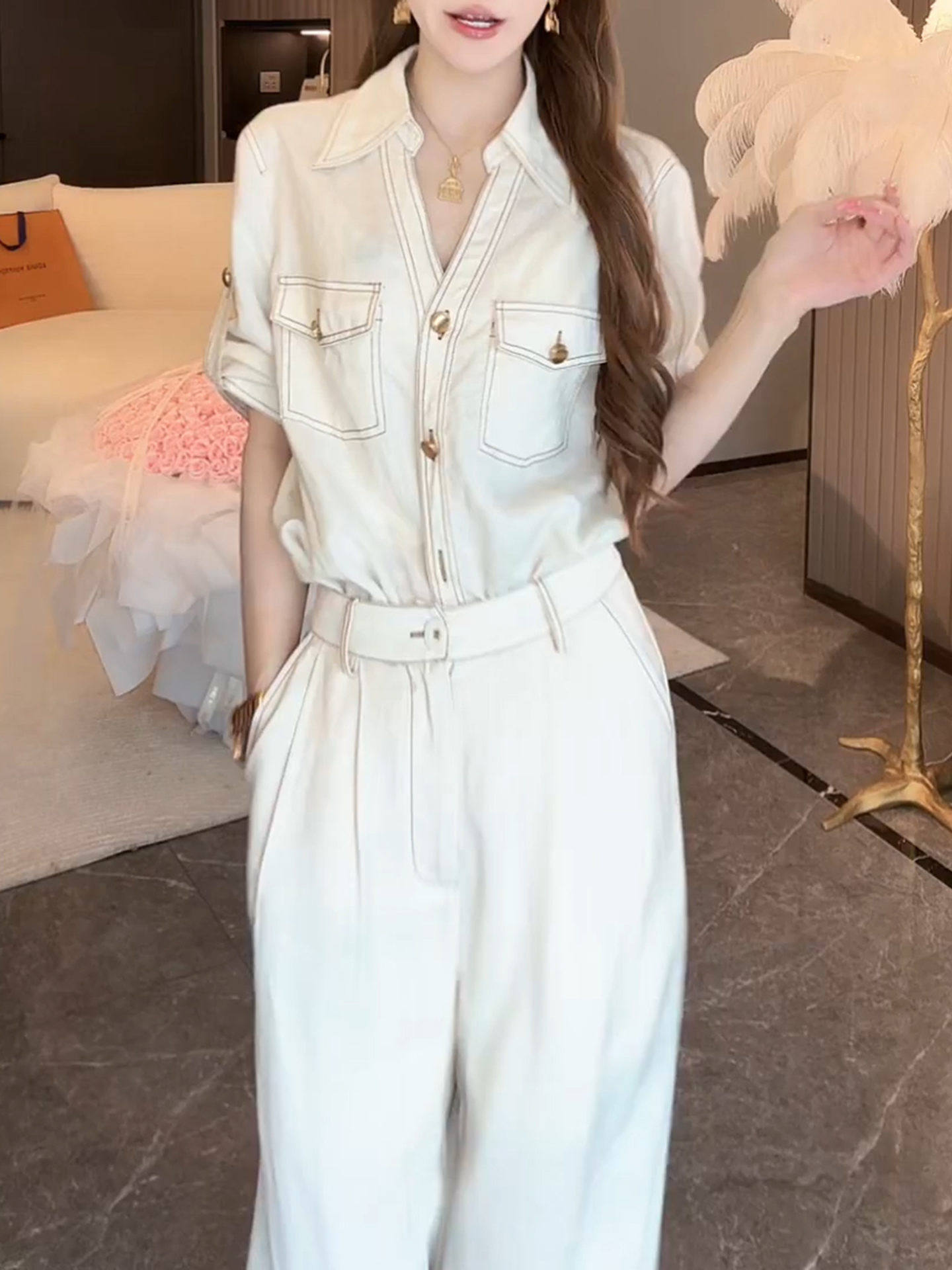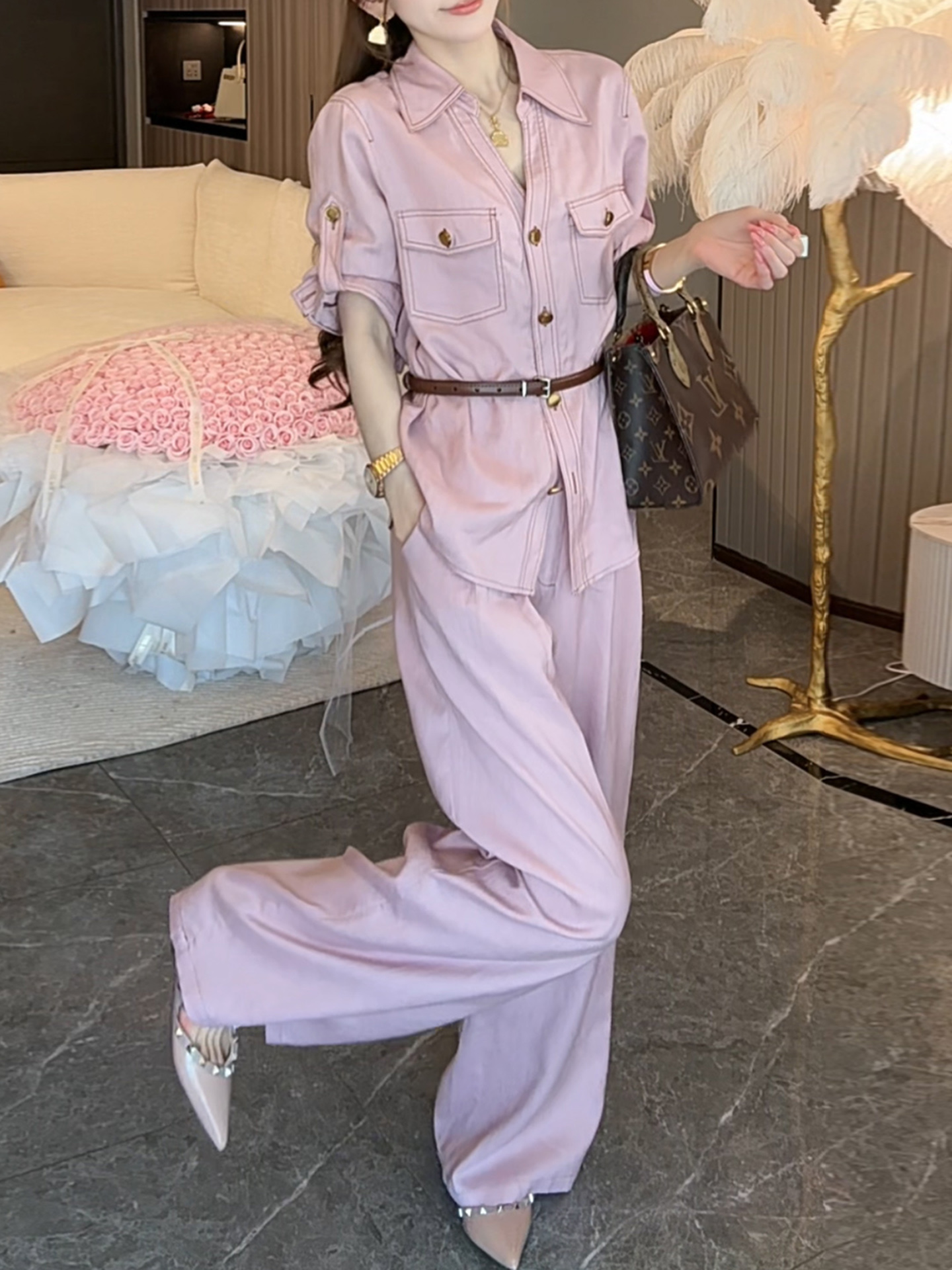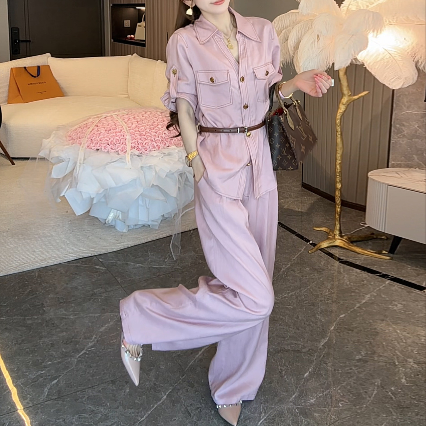 경관 그림 외국 가스 출퇴근 빛 럭셔리 패션 슬림해 보이는 전체 집합 여름 폴로 칼라 셔츠 하이웨이스트 와이드 레그 팬츠 투피스 세트