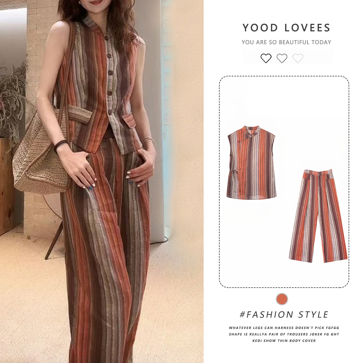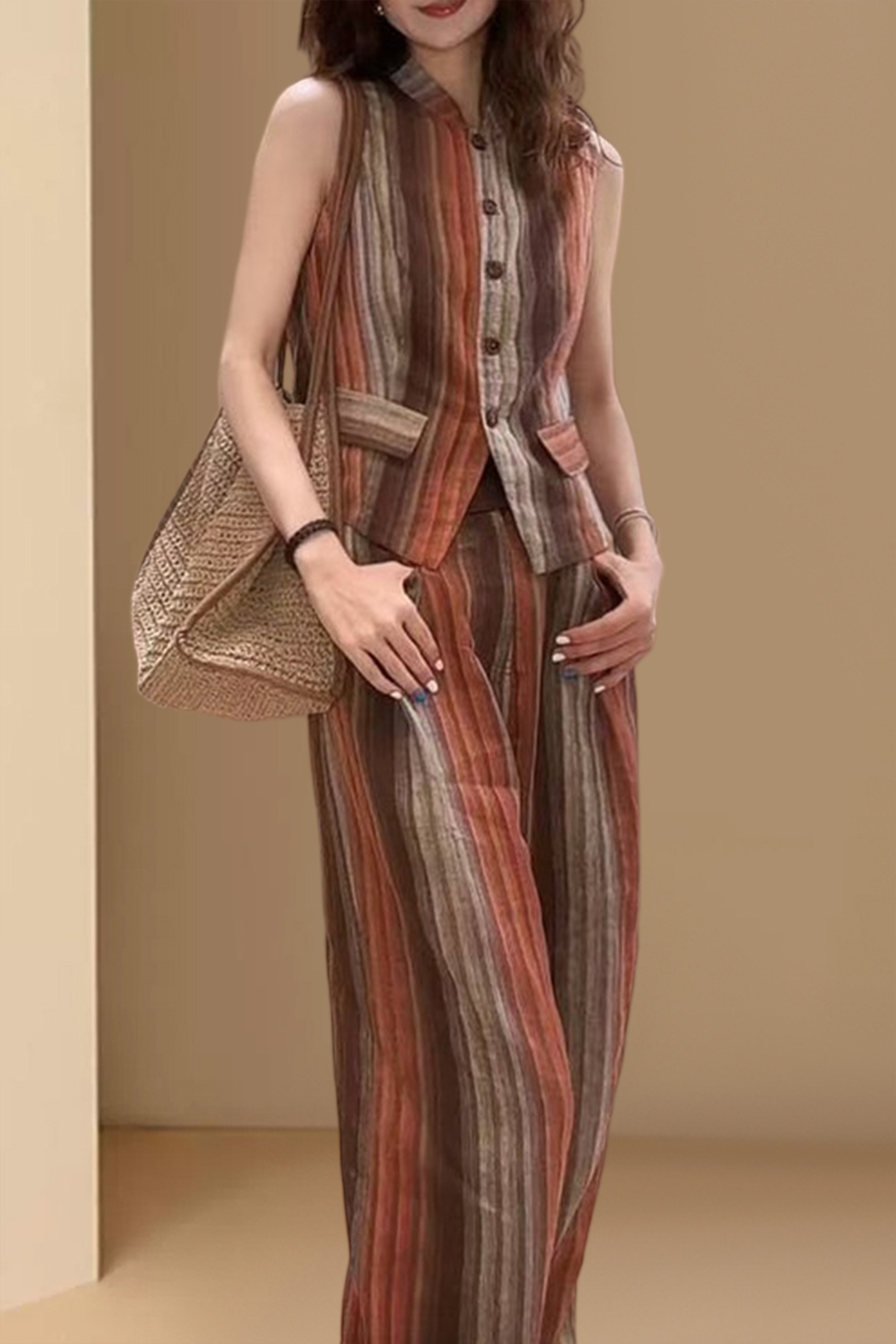 경관 그림 패션 세트 2026 여름 새로운 외국 가스 슬림해 보이는 V넥 민소매 맨위 와이드 레그 팬츠 품격 투피스 세트