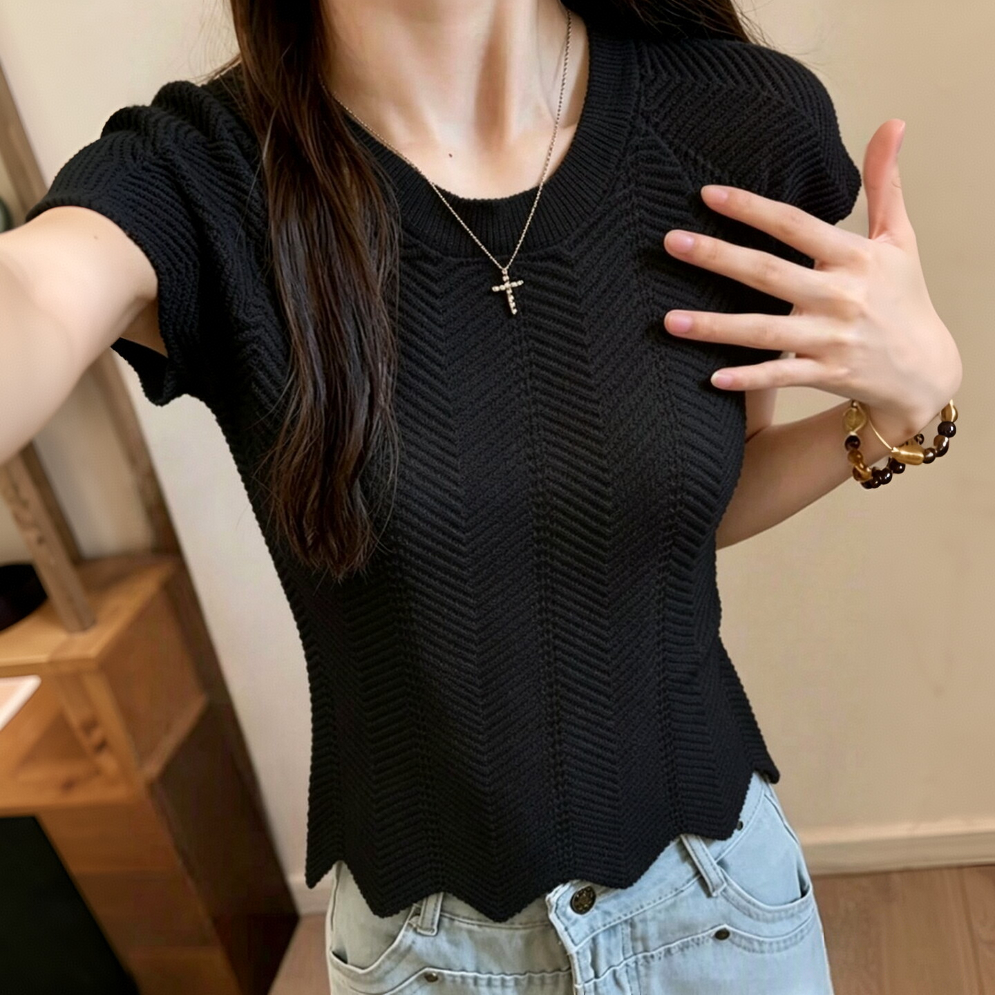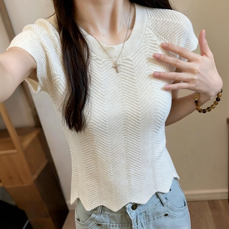 스트라이프 얼음 실크 니트 스웨터 반팔 티셔츠 여성 여름 얇은 쇼트 스타일 긍정적 인 어깨 라운드 넥 부드러운 달콤함 몸매 가꾸기 맨위