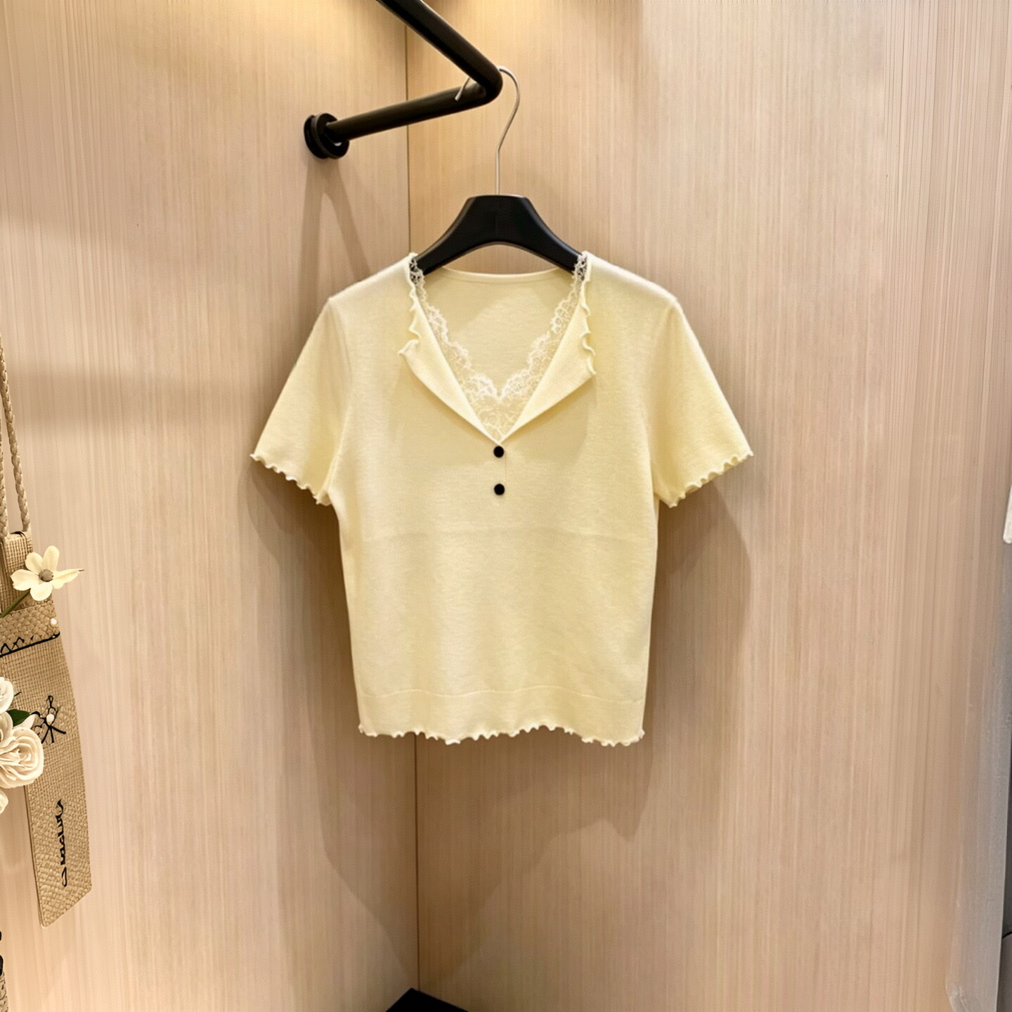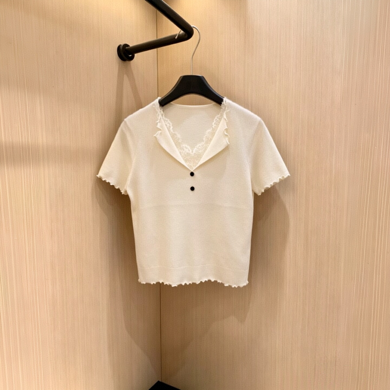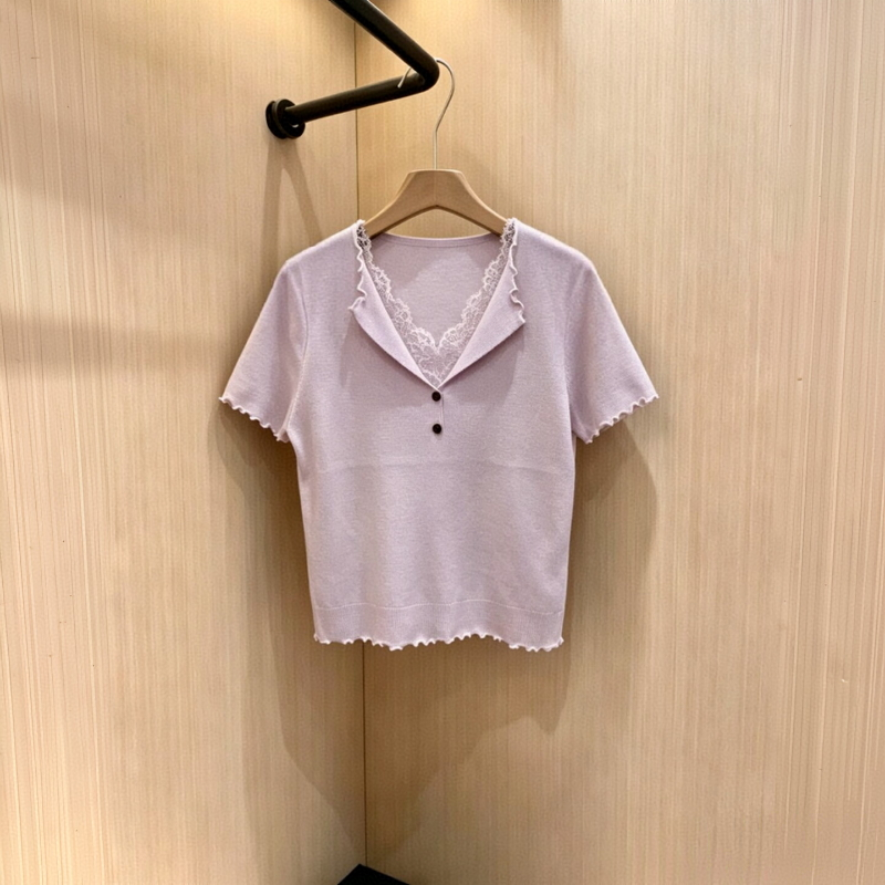 한 부서 레이스 조각 페이크 레이어드 니트 스웨터 여성 프릴 디자인 센스 몸매 가꾸기 슬림해 보이는 반팔 맨위 여름