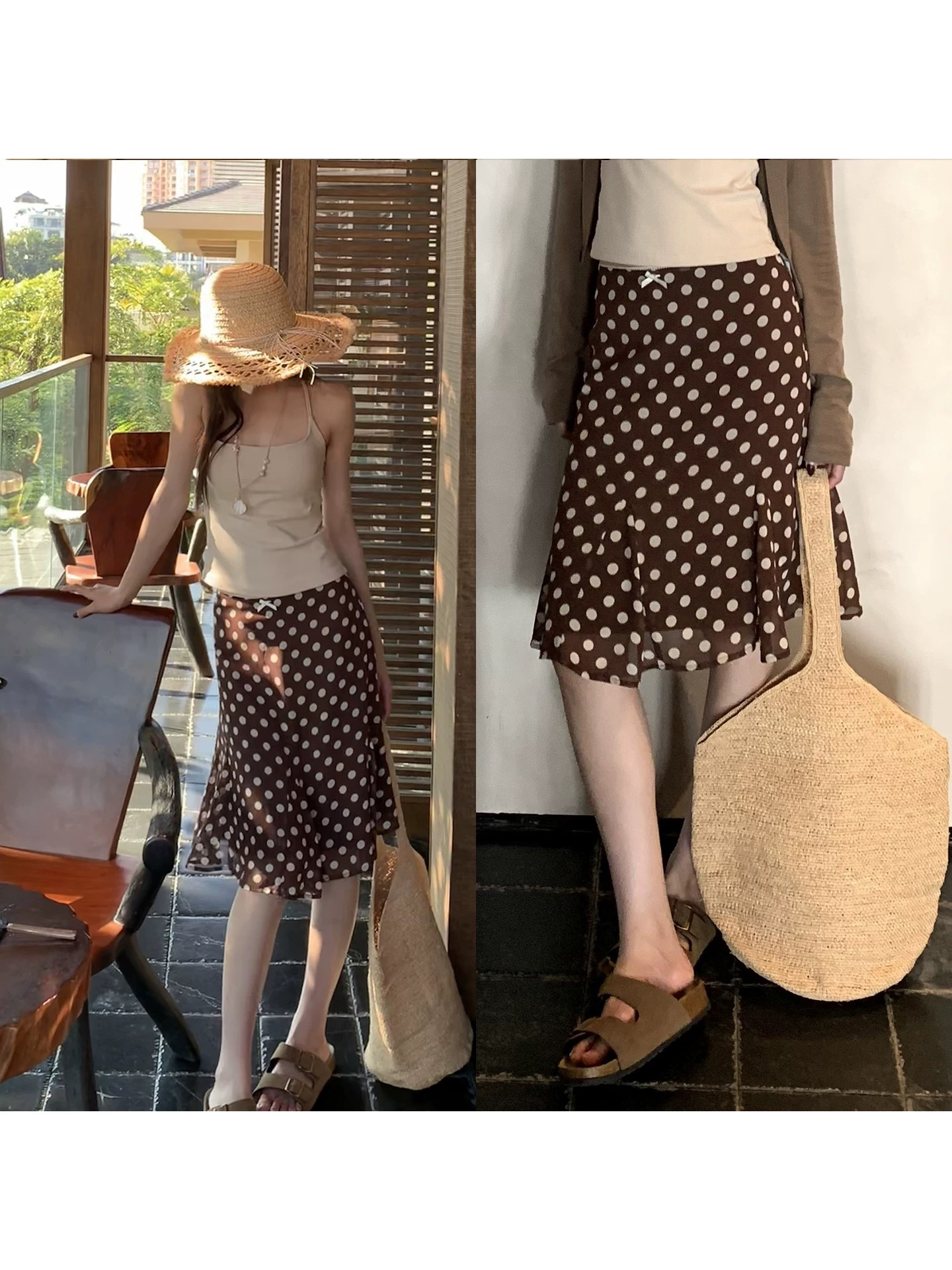 레드 맨 파빌리온 한 마디 반신 스커트 여성 2026 새로운 여름 타이트 스커트 인어 꼬리 스커트 브라운 도트 무늬 작은 키 치마 아이들