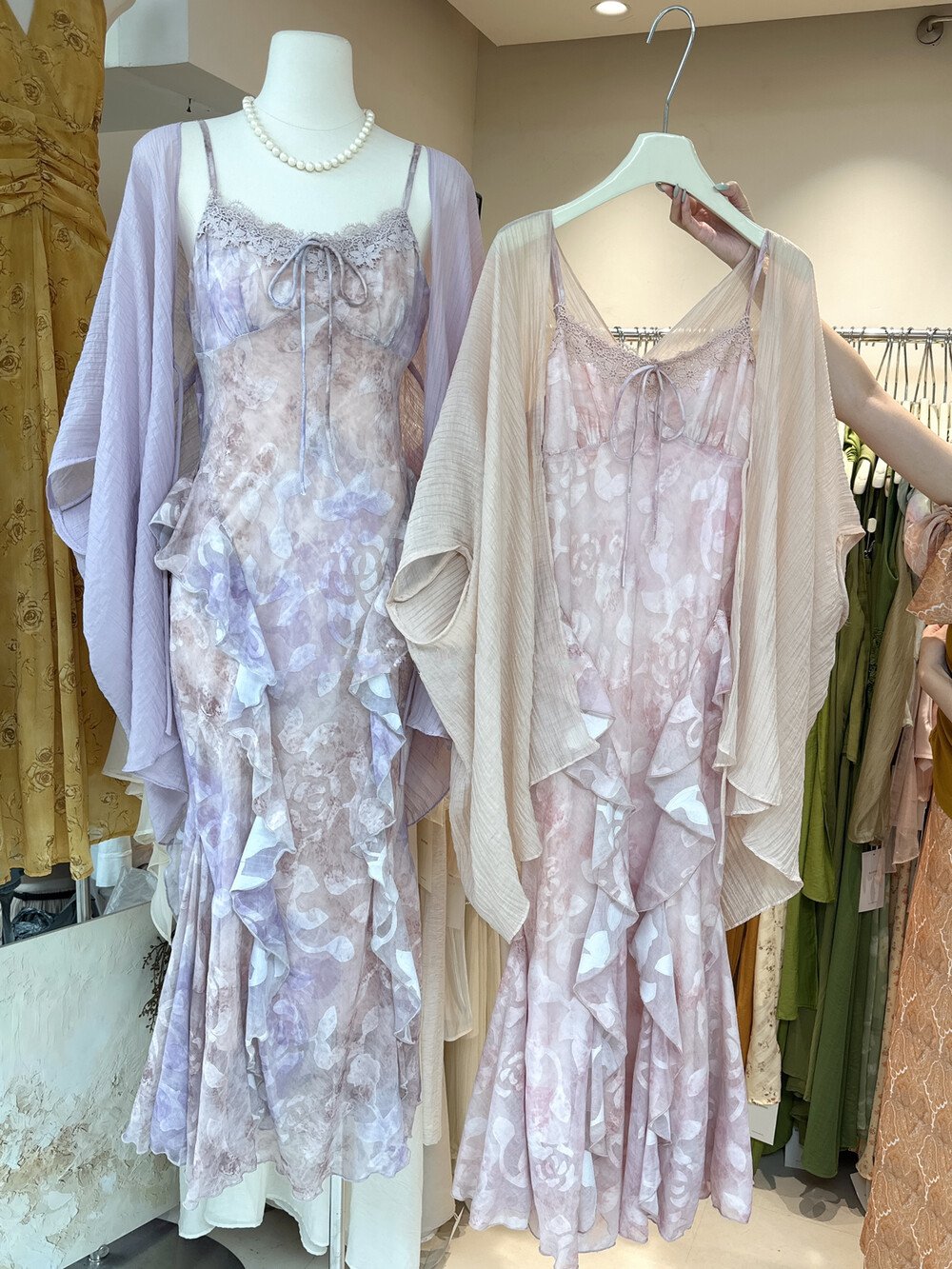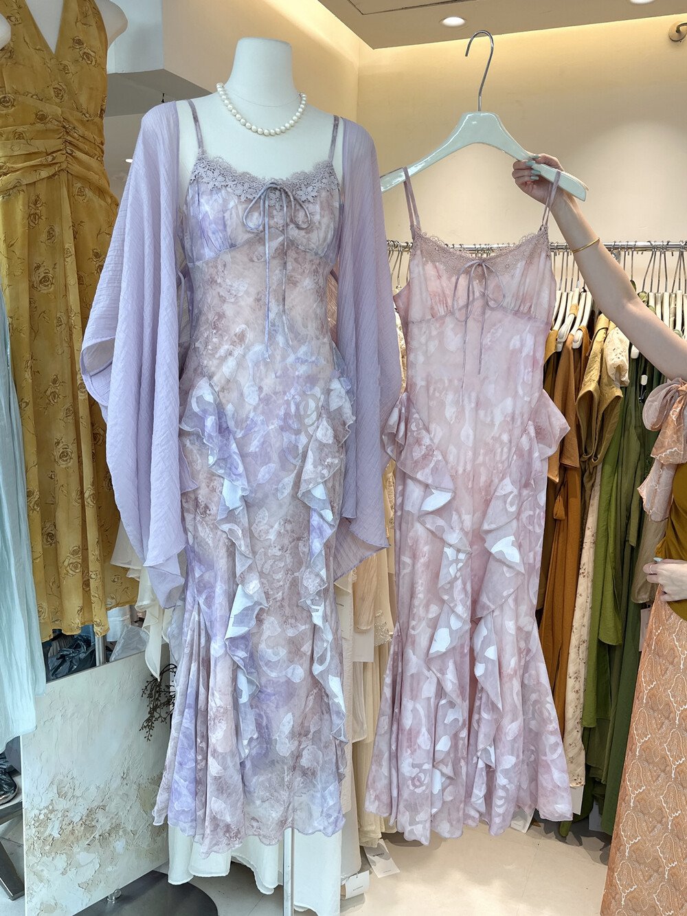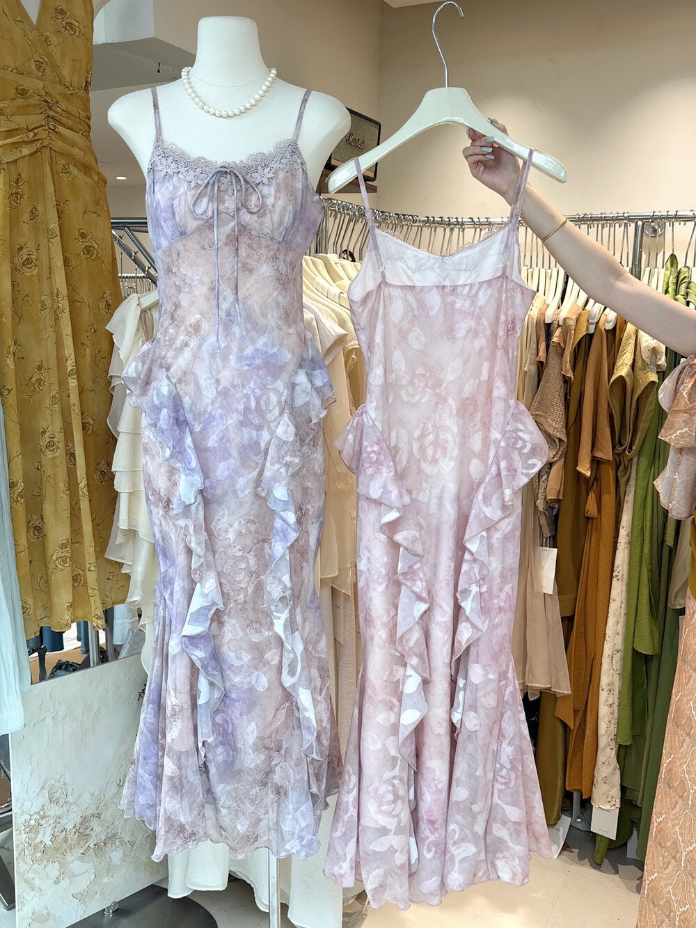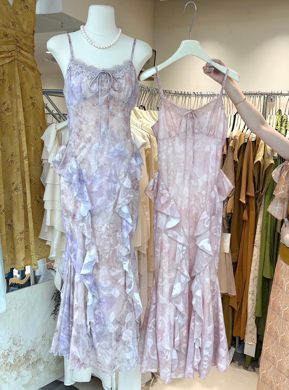 2026 여름 새로운 한국 스타일 꽃무늬 여성 드레스 여름 레이스 레이스 패치워크 프린트 허리 수축 슬림해 보이는 중간 길이 스커트