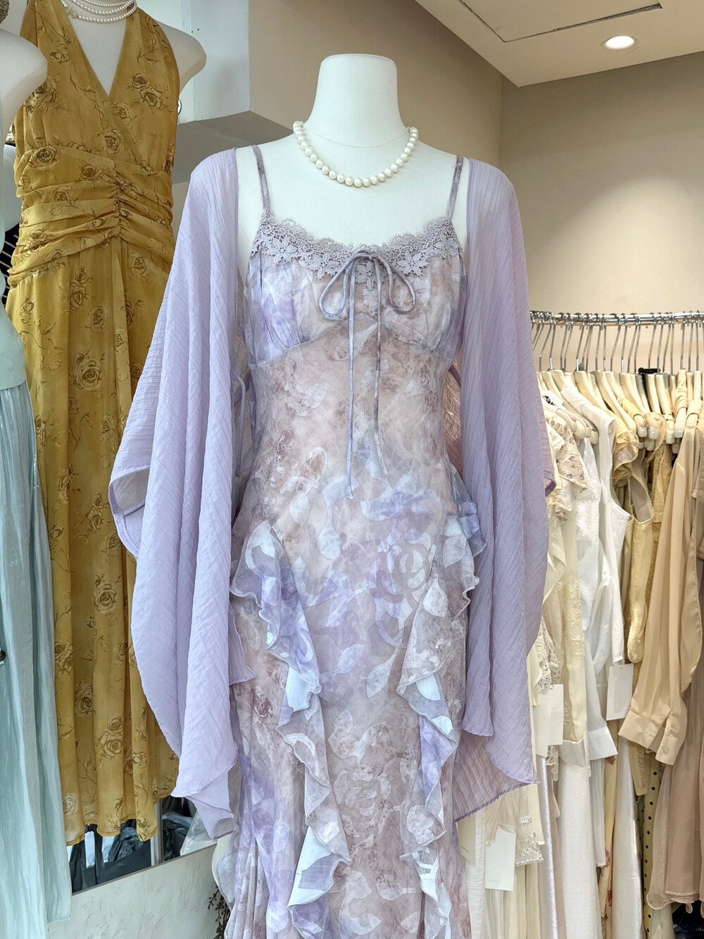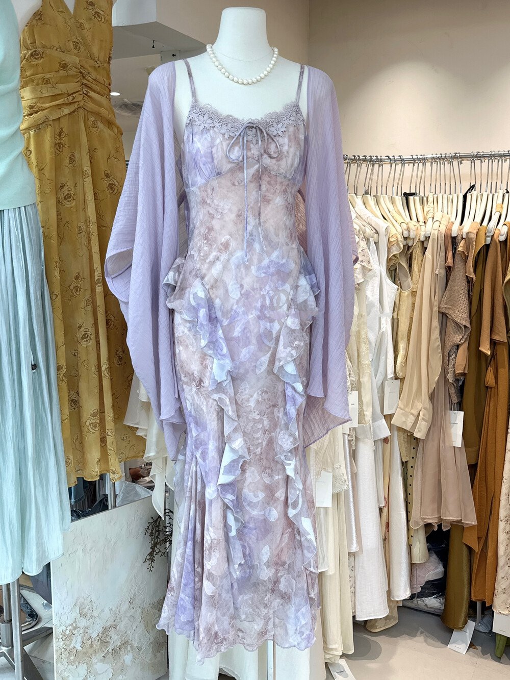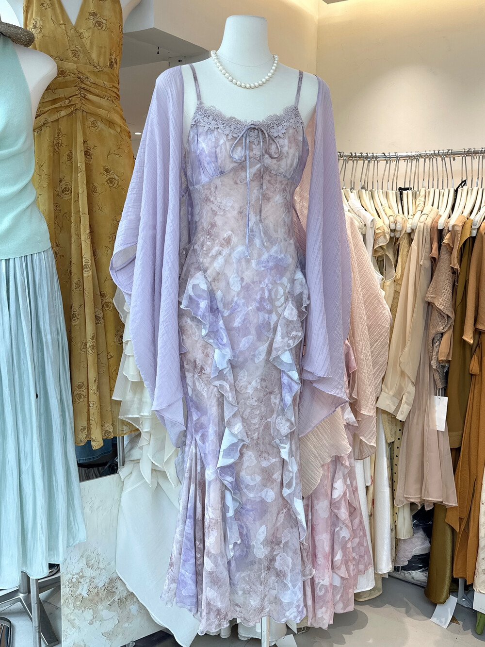 수영하다 사슴 사슴 프랑스식 자수 패치워크 헤일로 염색 혼합 색상 꽃무늬 슬립 여성 드레스 보라색 한 단어 오프숄더 길다 치마