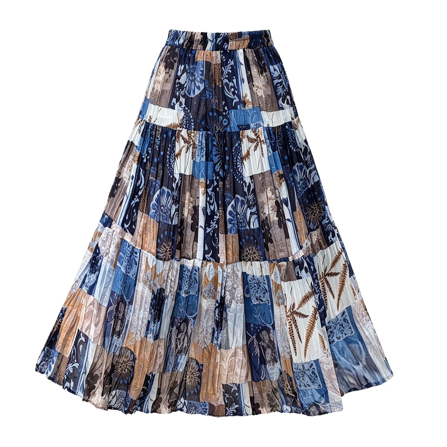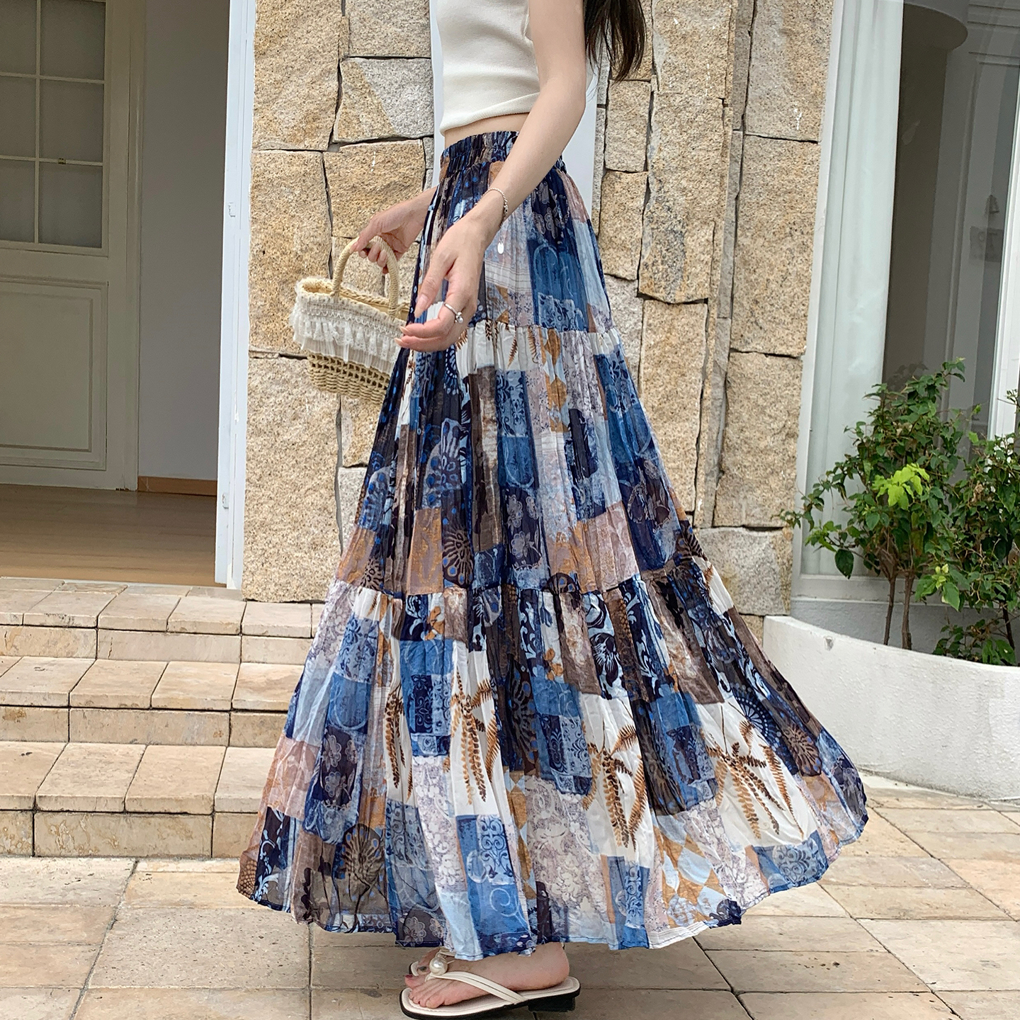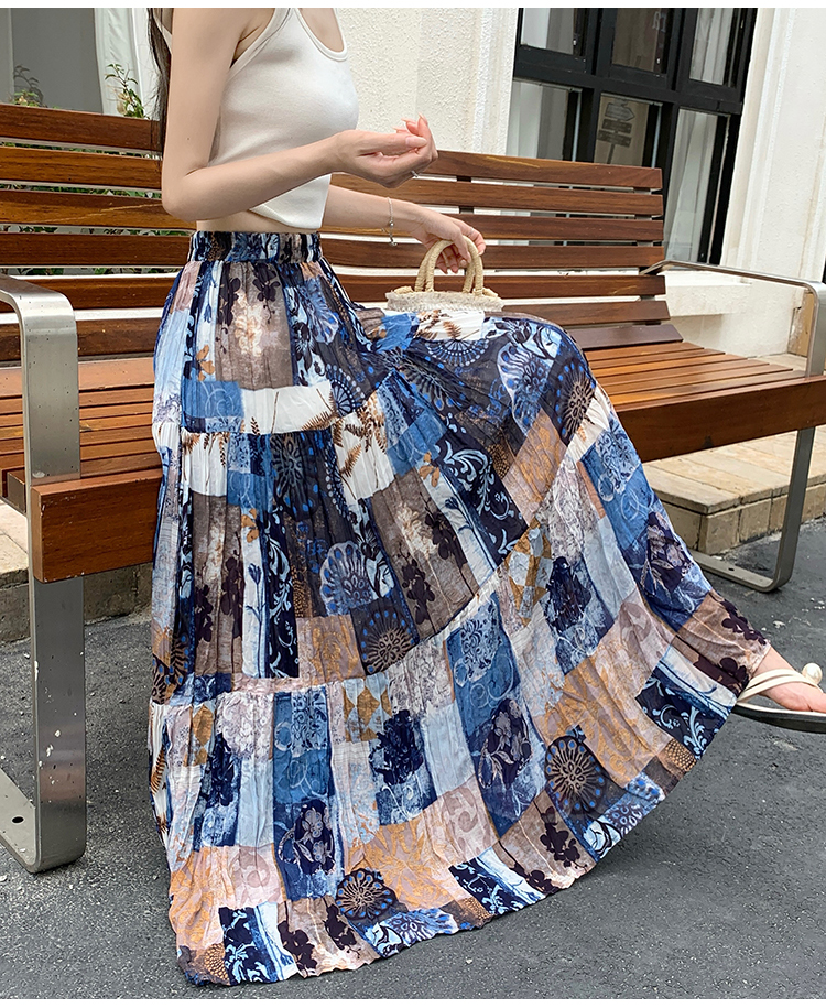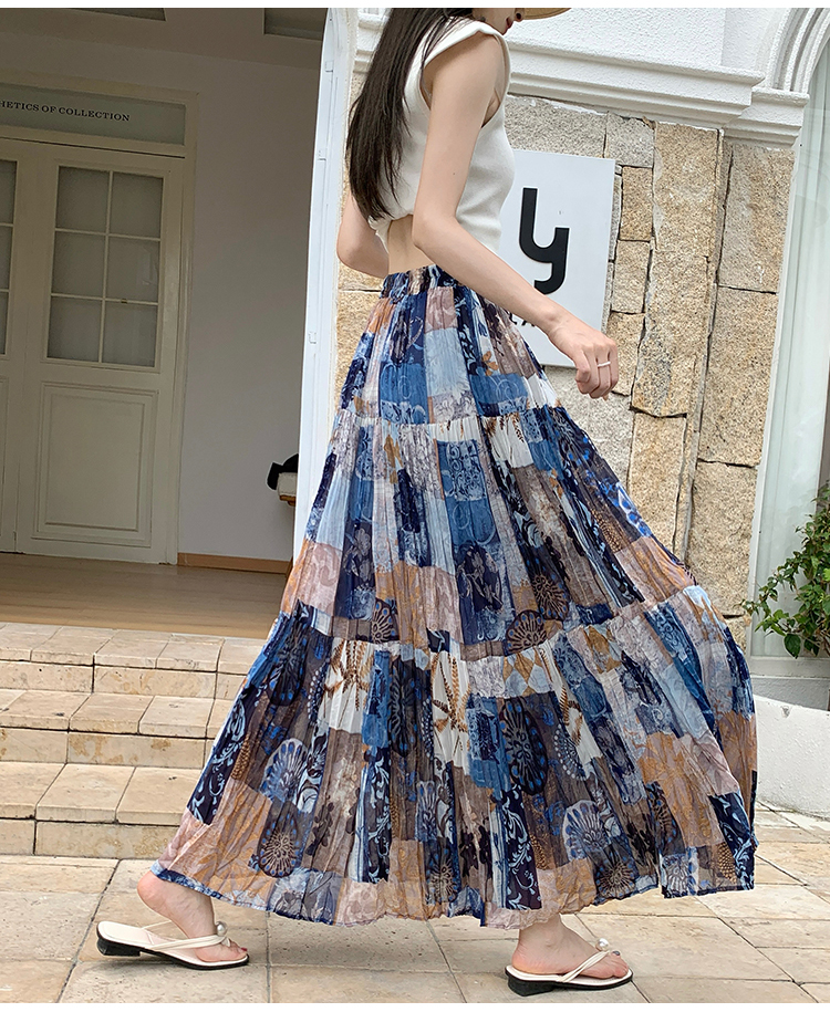 실사 2026 여름 허리밴드 표지 넓적 다리 슬림해 보이는 유화 프린트 플리츠 A라인 스커트 케이크 요정 쉬폰 롱 스커트