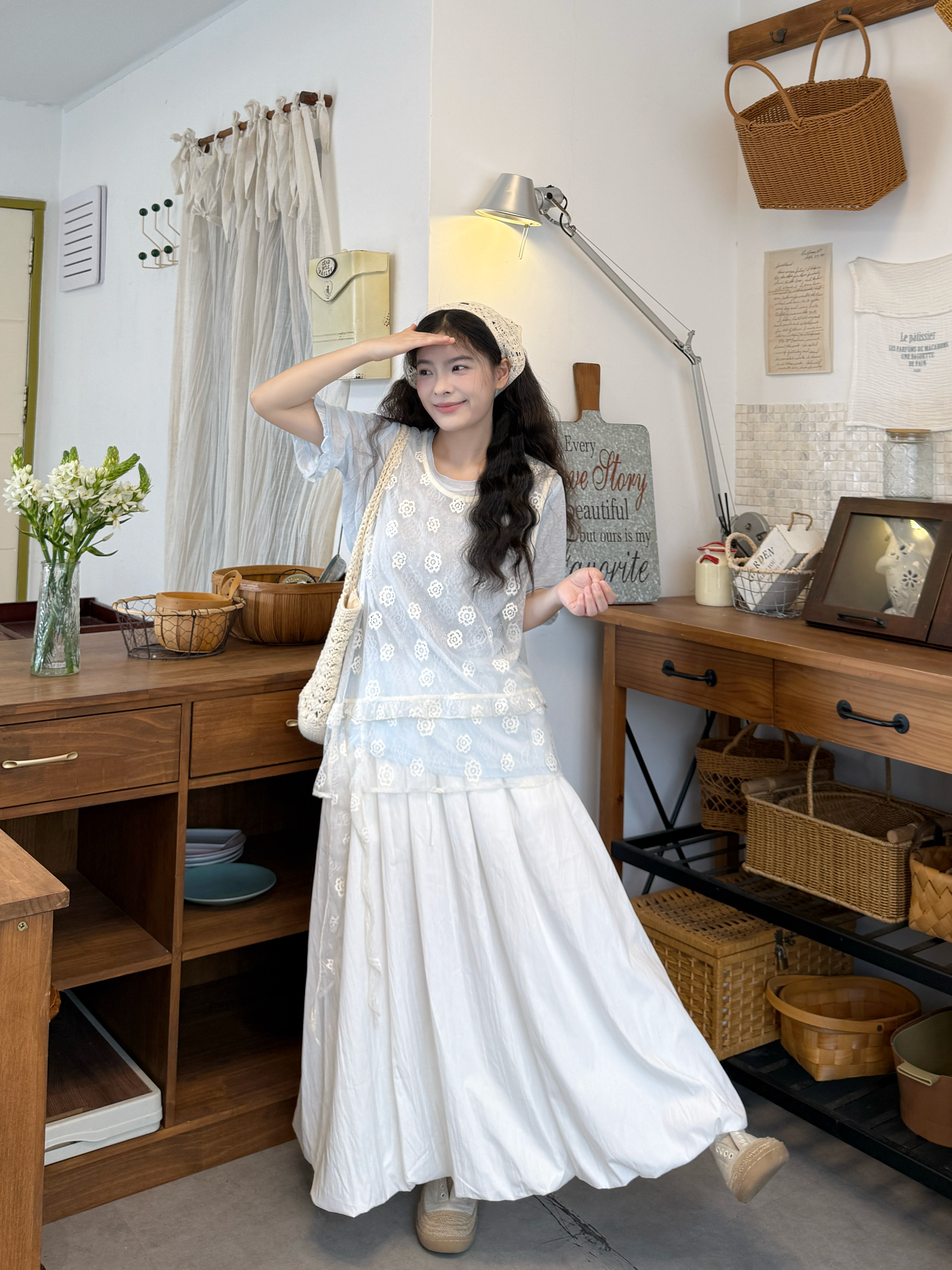실사 반팔 티셔츠 스택 착용 자수 블라우스 반신 스커트