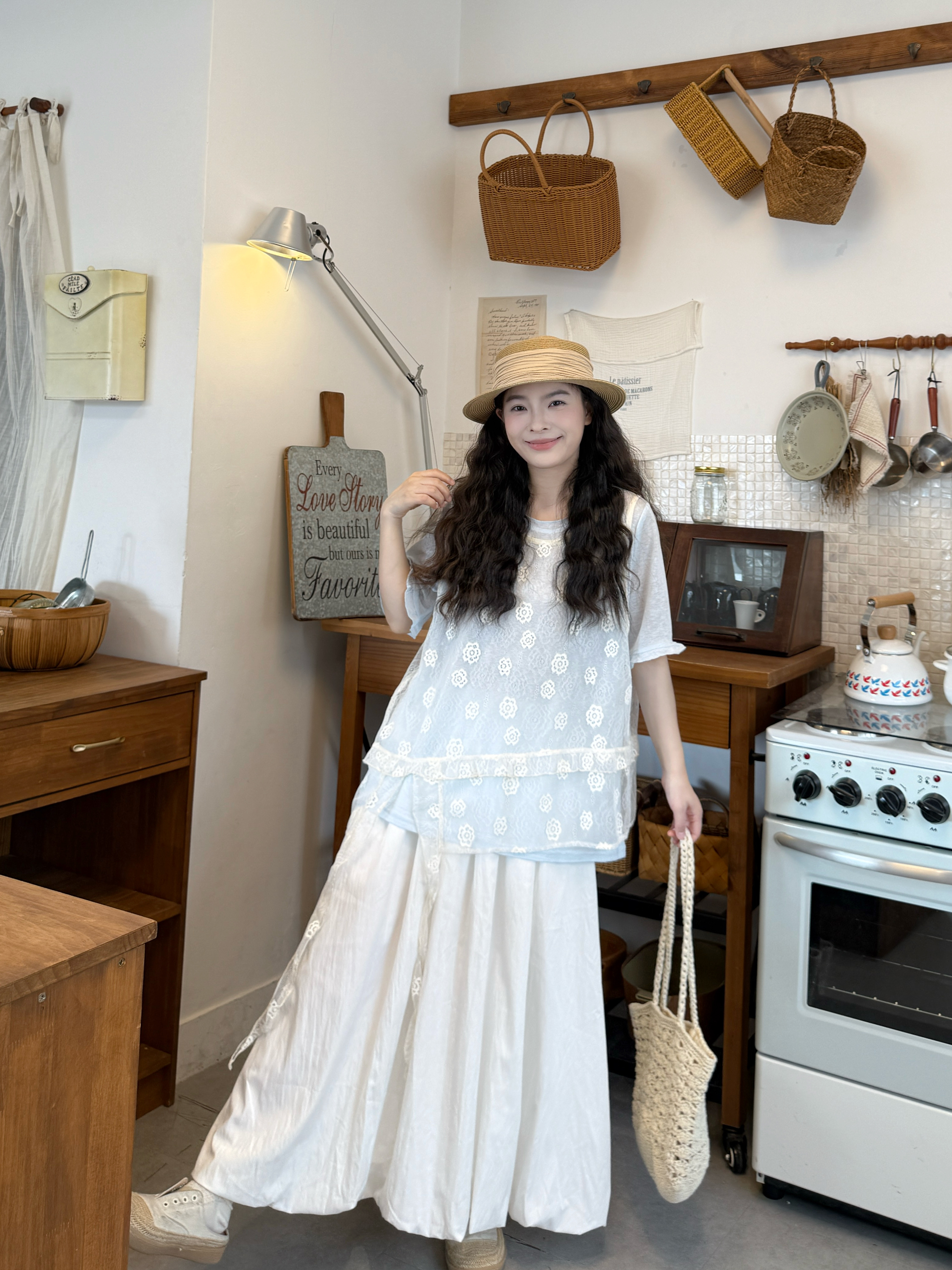 실사 레이스 레이스 루즈핏 자수 반팔 셔츠