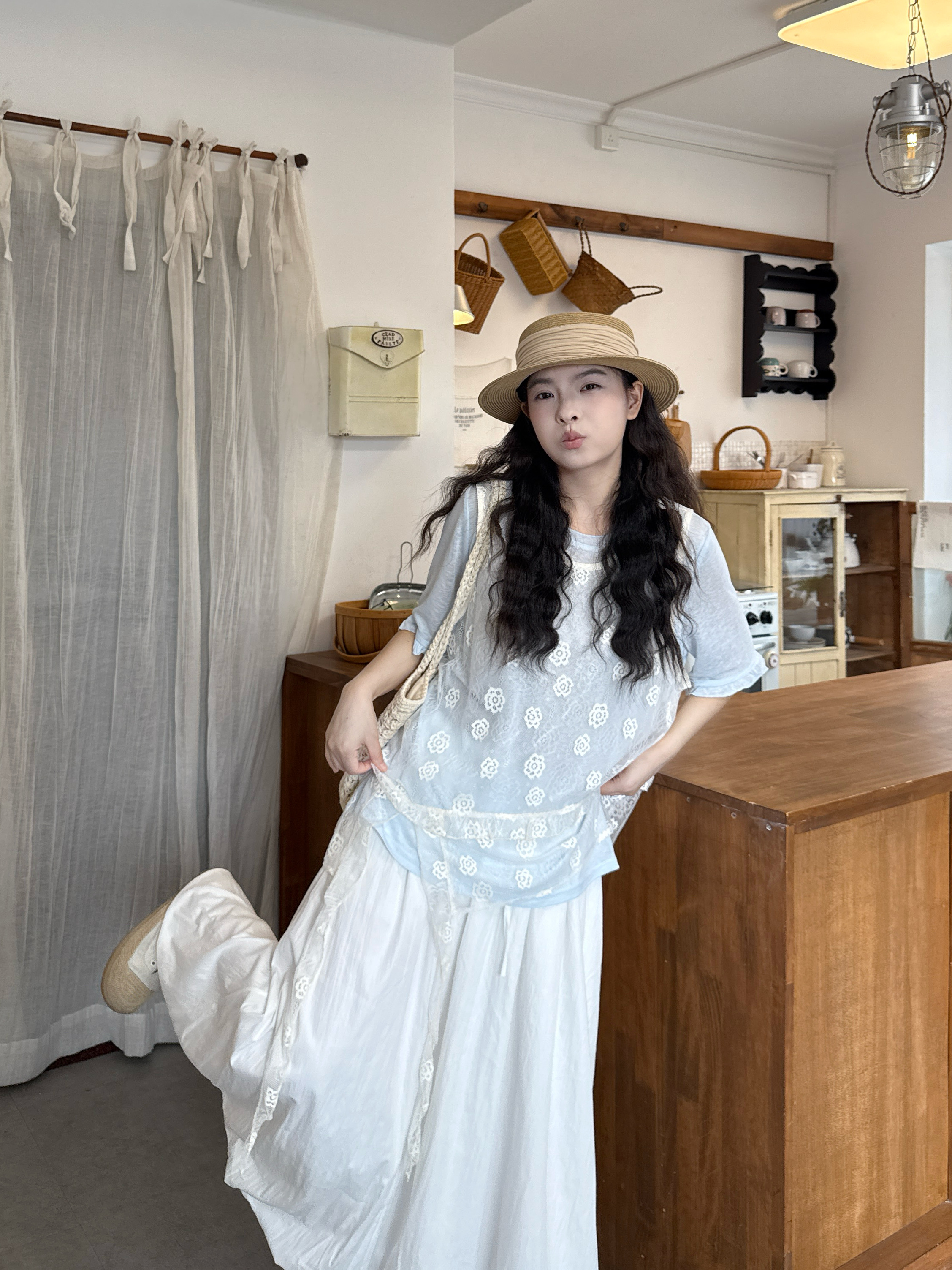 실사 레이스 베이비 칼라 반팔 셔츠 꽃밭 치마