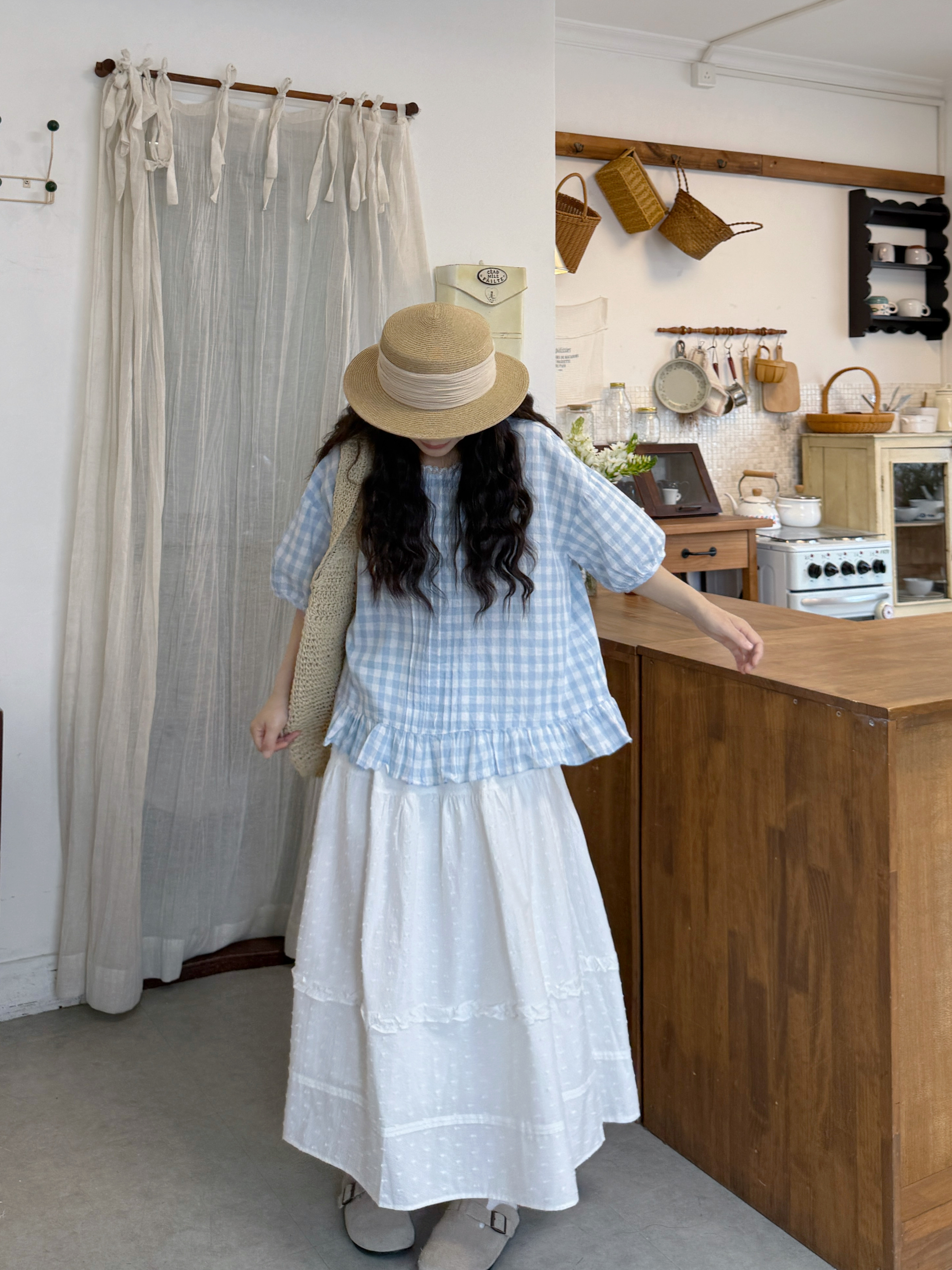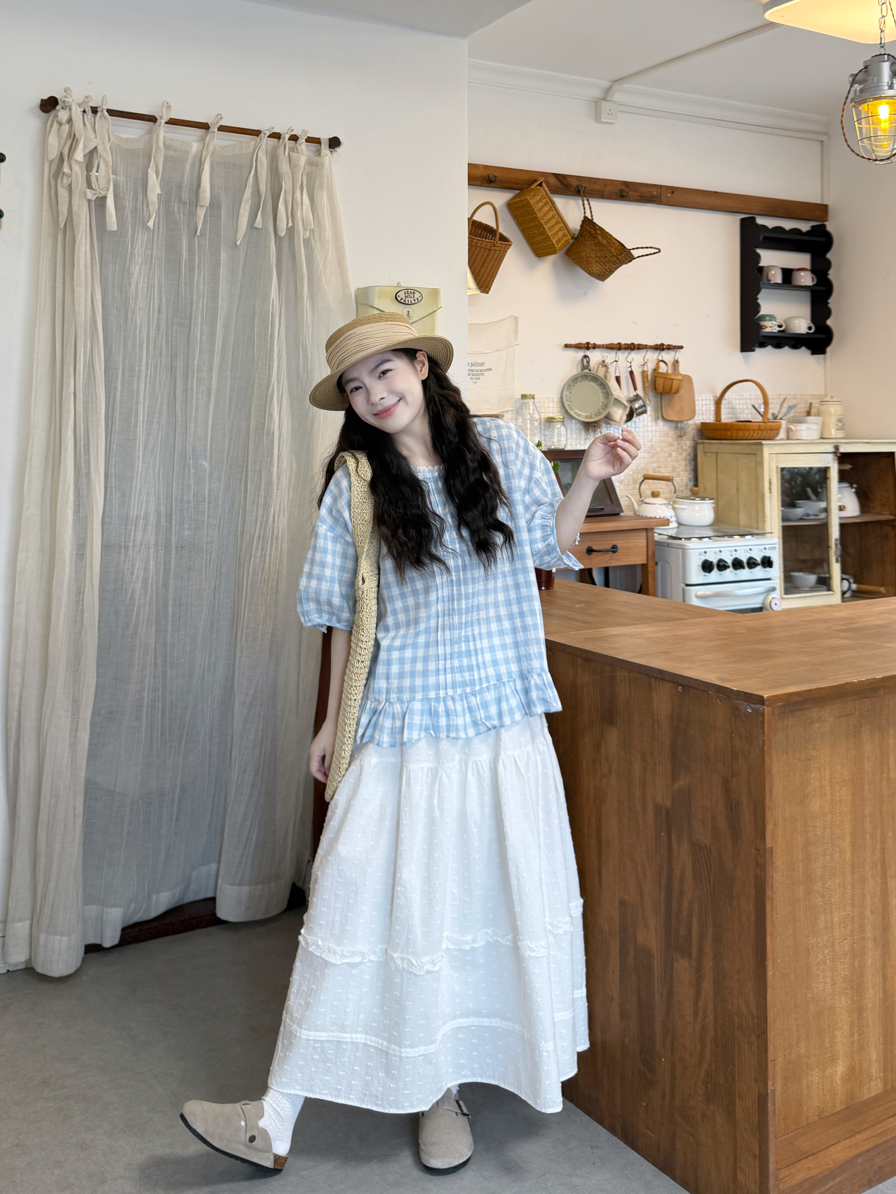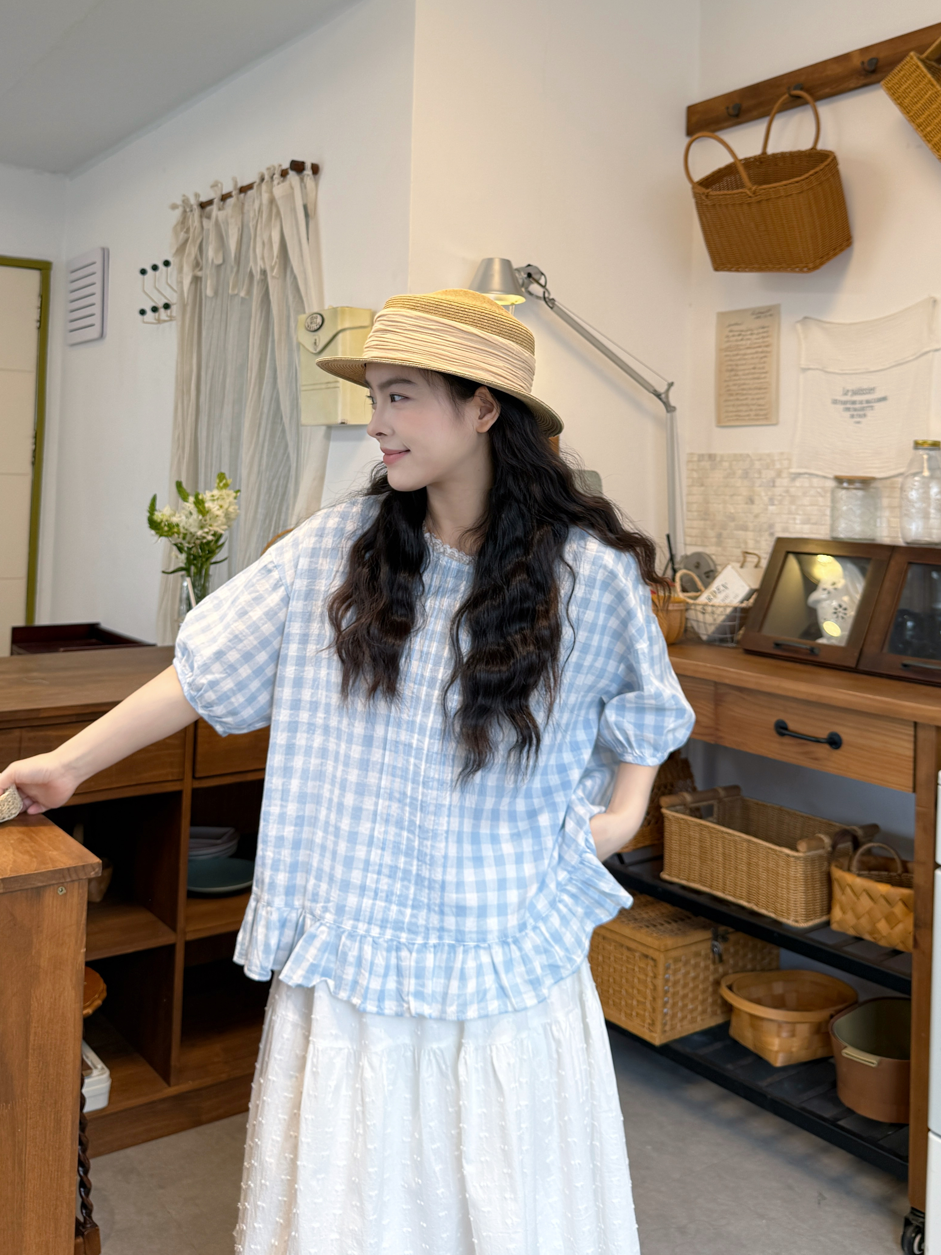 실사 루즈핏 일본식 체크무늬 셔츠 드레스 면 린넨 와이드 레그 팬츠 세트