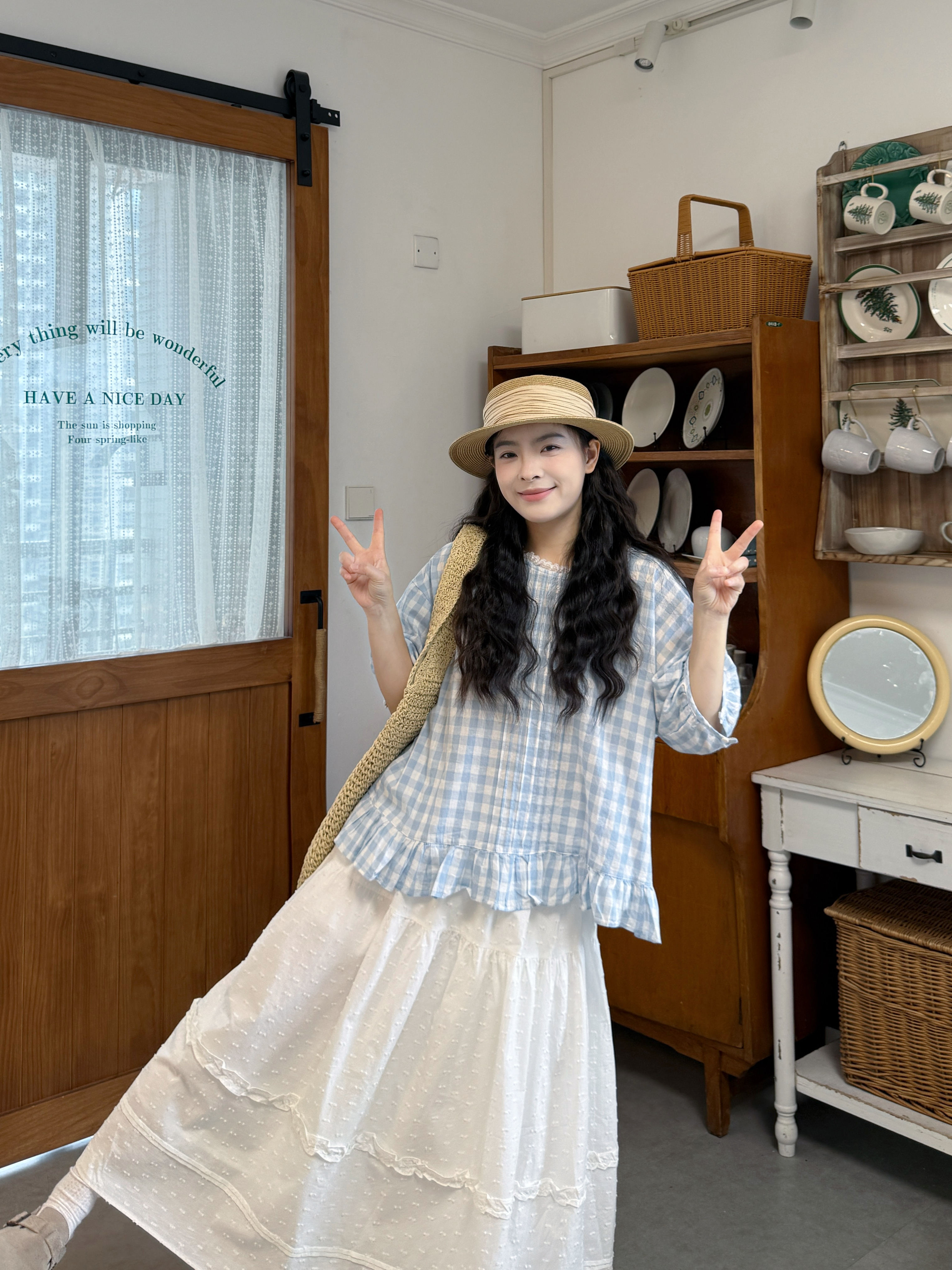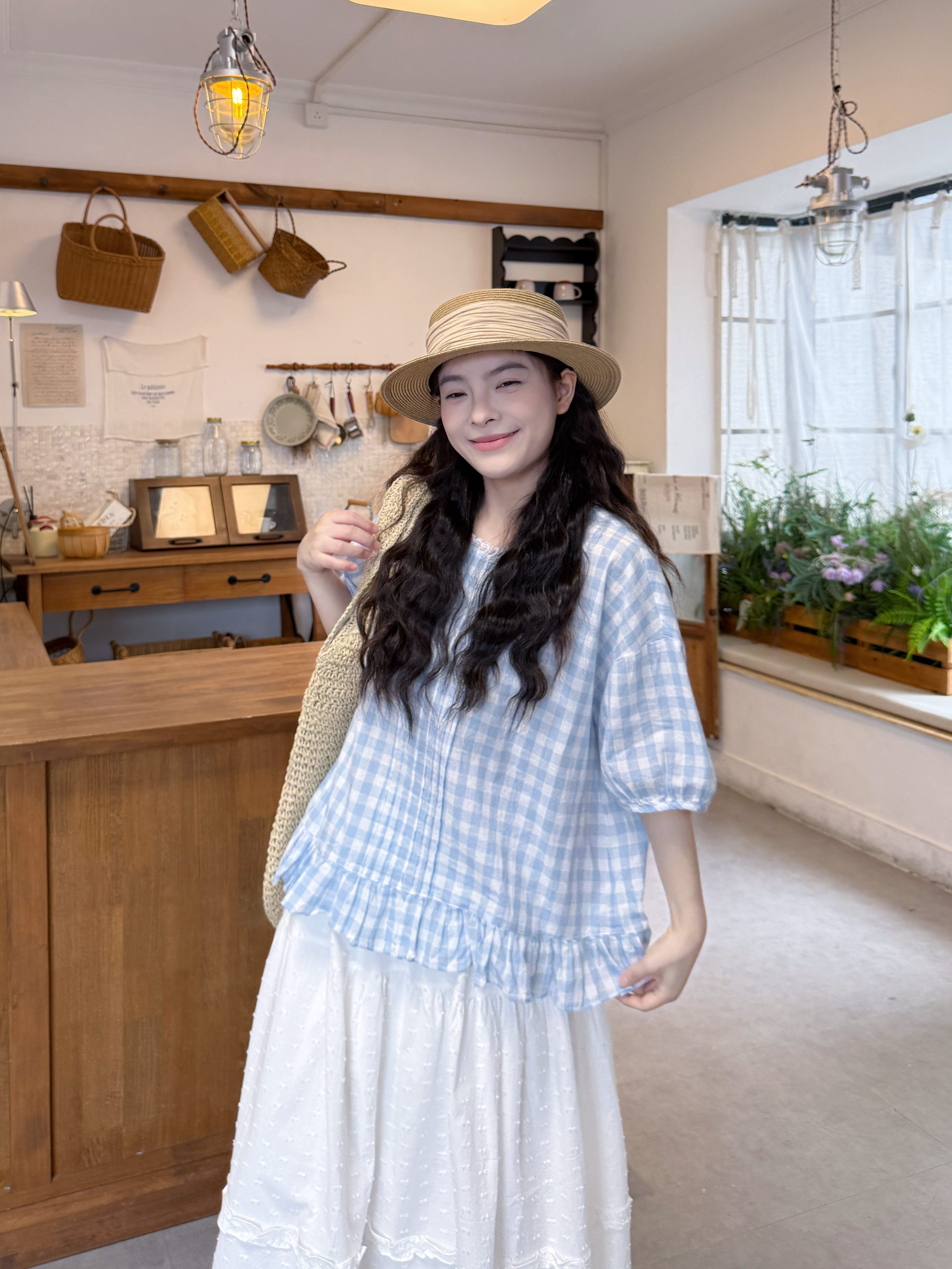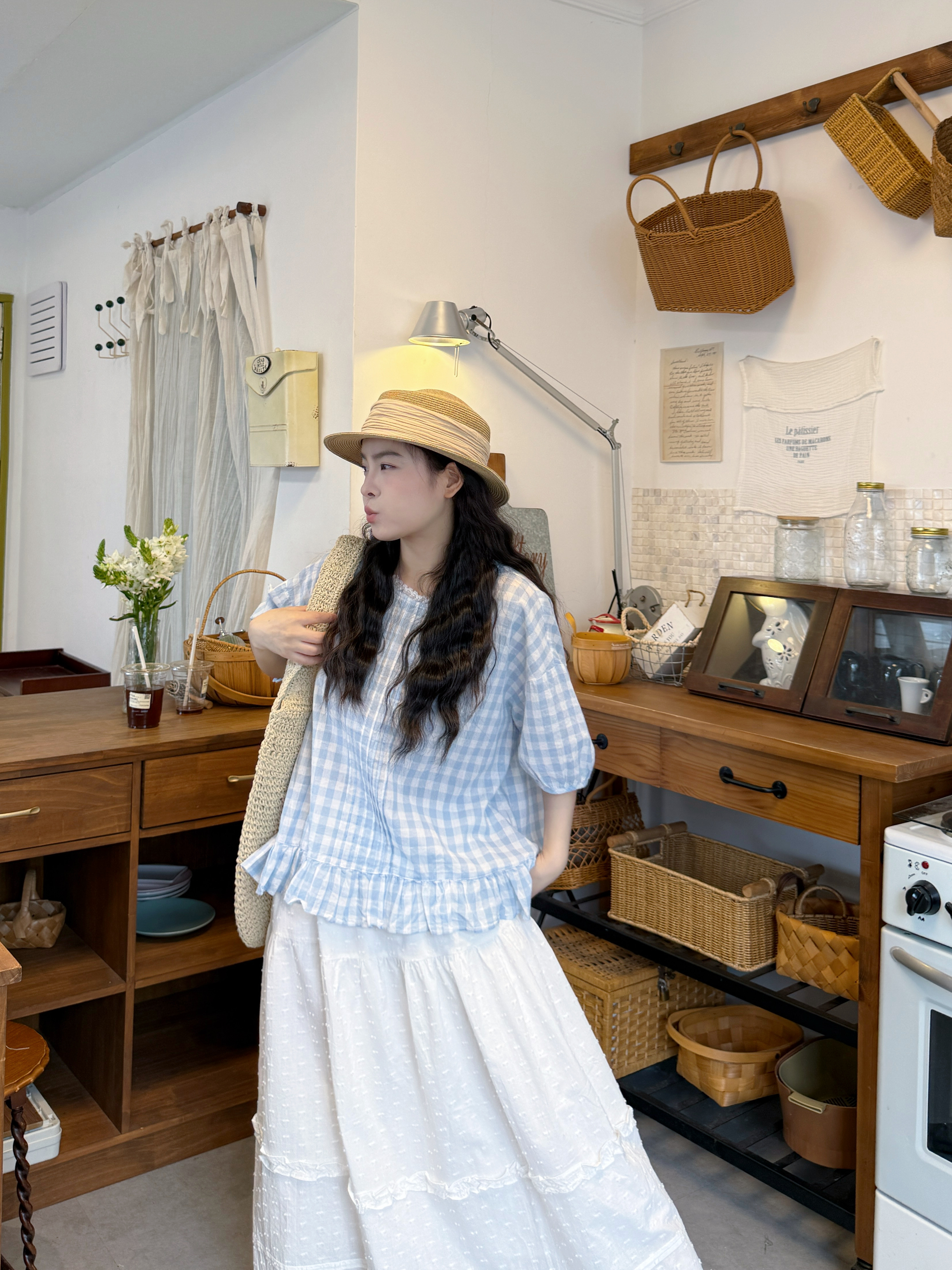 실사 루즈핏 일본식 체크무늬 셔츠 드레스 면 린넨 와이드 레그 팬츠 세트