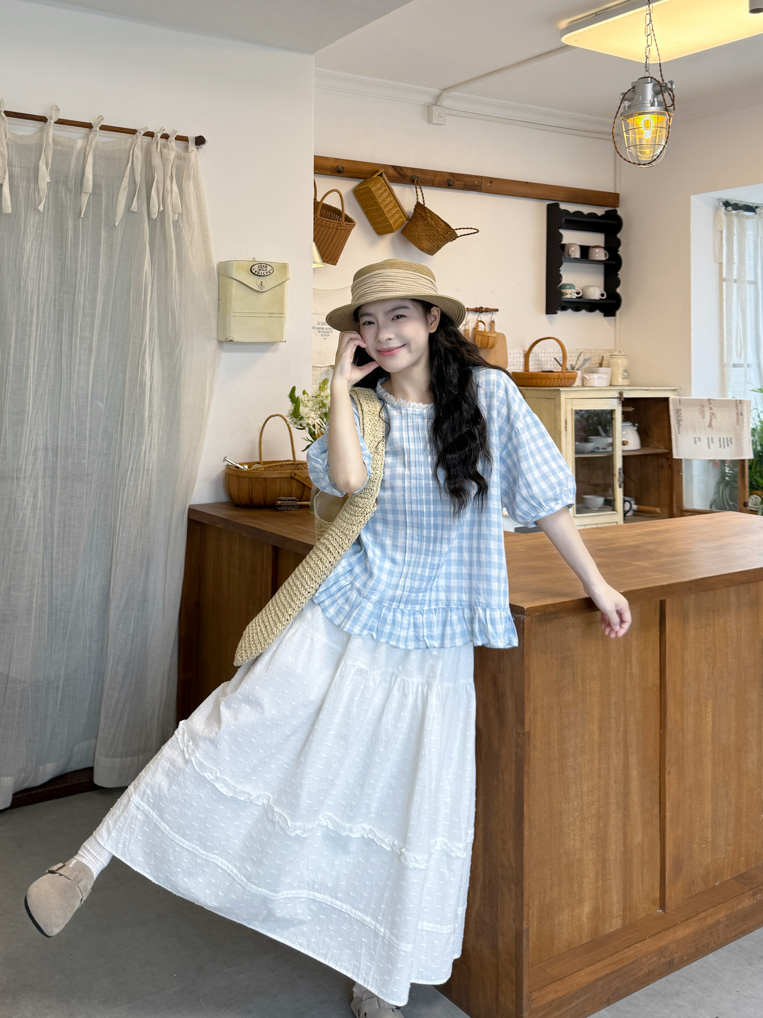 실사 반팔 티셔츠 스택 착용 자수 블라우스 반신 스커트