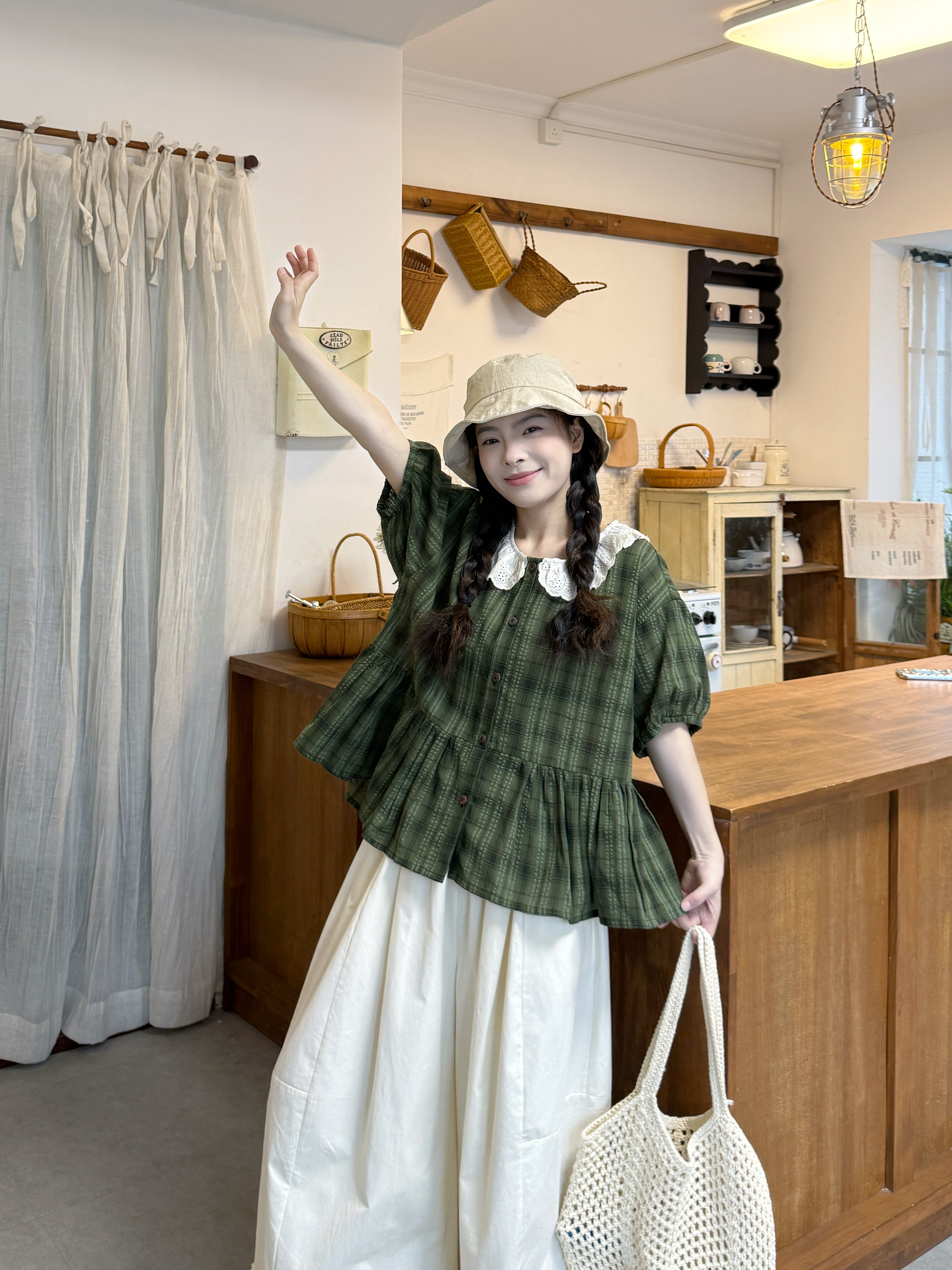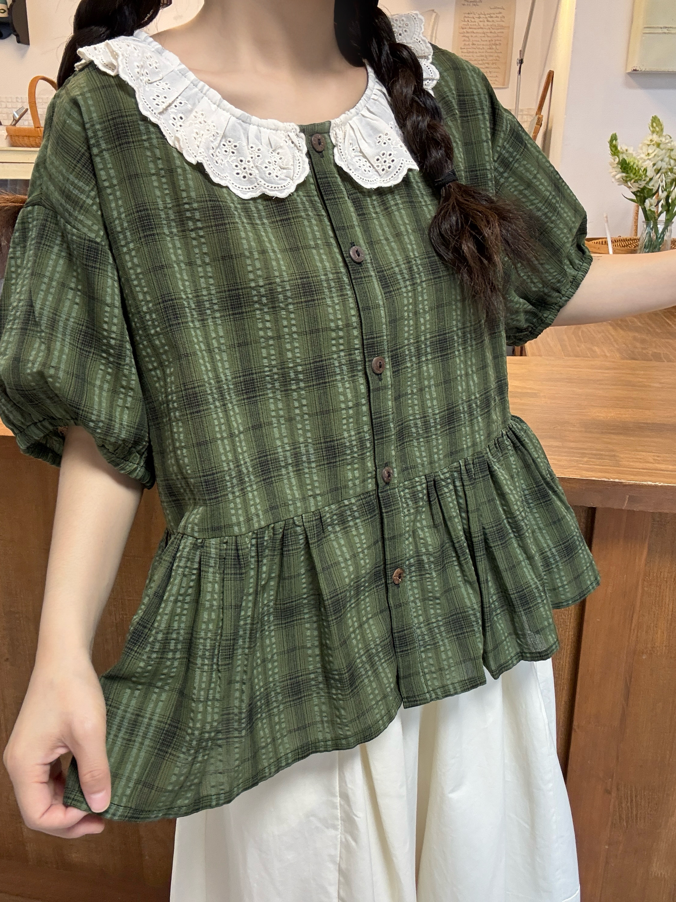 실사 레이스 베이비 칼라 루즈핏 반팔 셔츠
