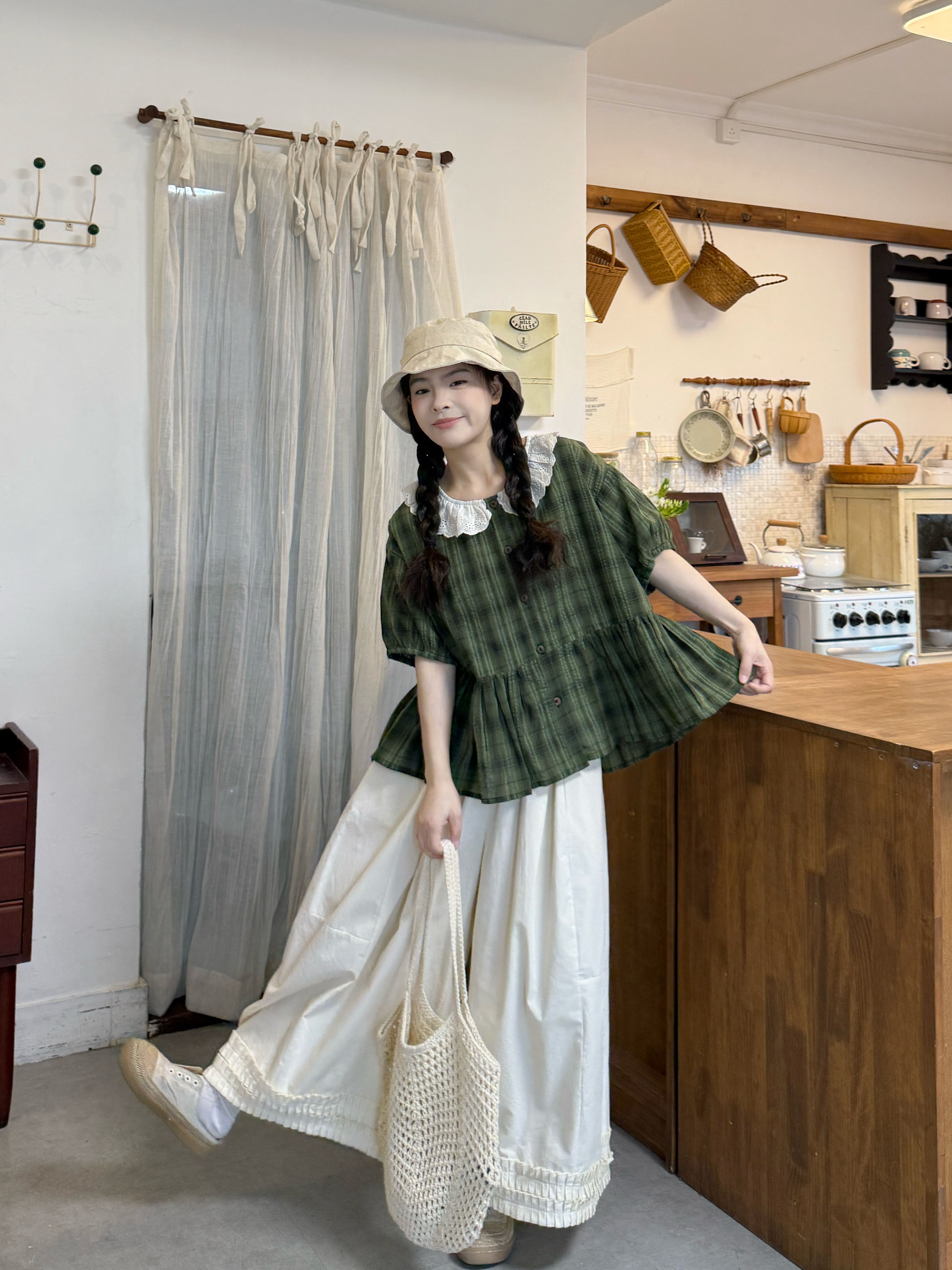 실사 루즈핏 일본식 체크무늬 셔츠 드레스 면 린넨 와이드 레그 팬츠 세트