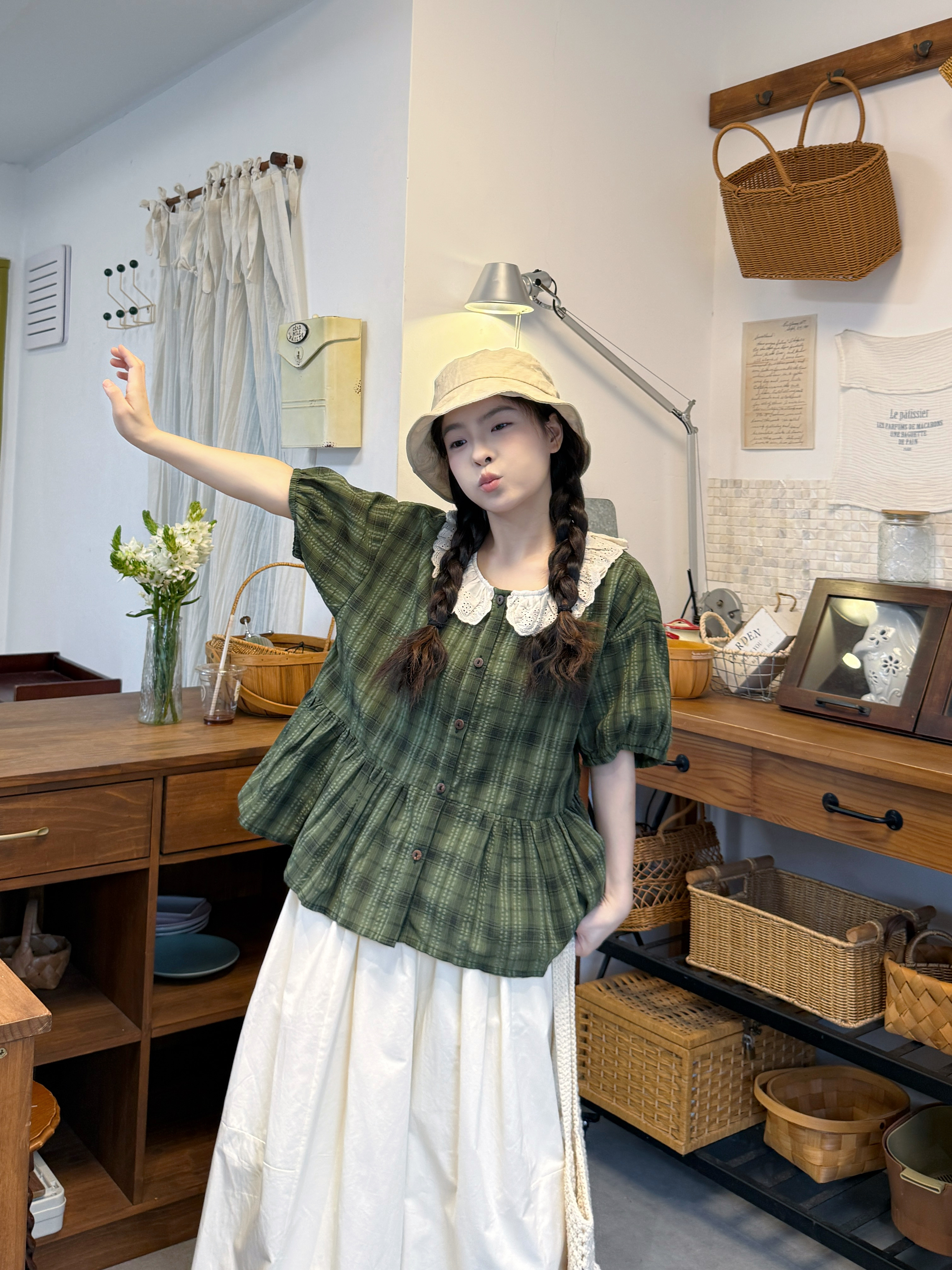 실사 레이스 베이비 칼라 반팔 셔츠 꽃밭 치마