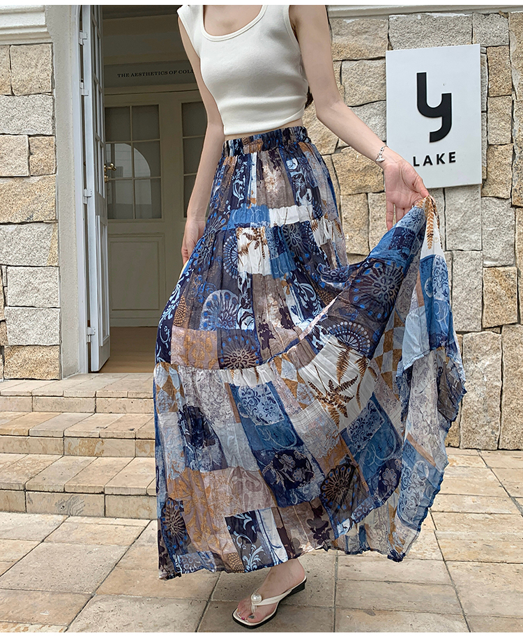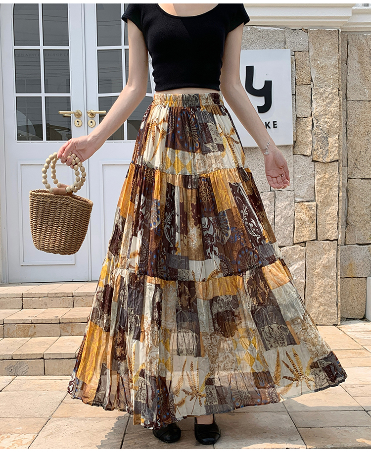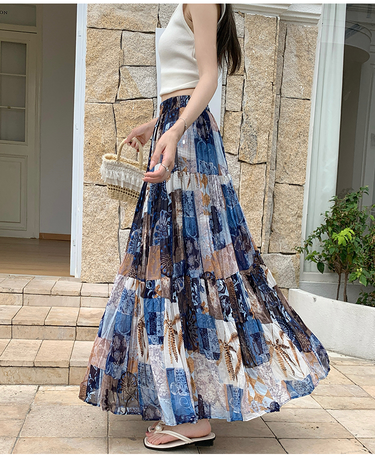 실사 2026 여름 허리밴드 표지 넓적 다리 슬림해 보이는 유화 프린트 플리츠 A라인 스커트 케이크 요정 쉬폰 롱 스커트