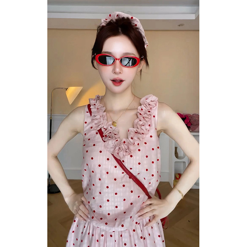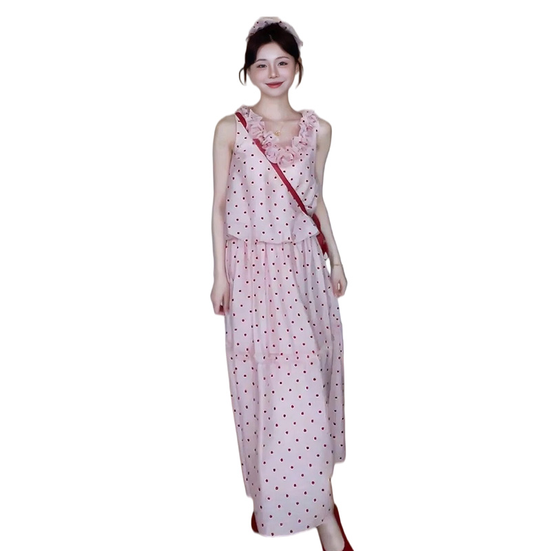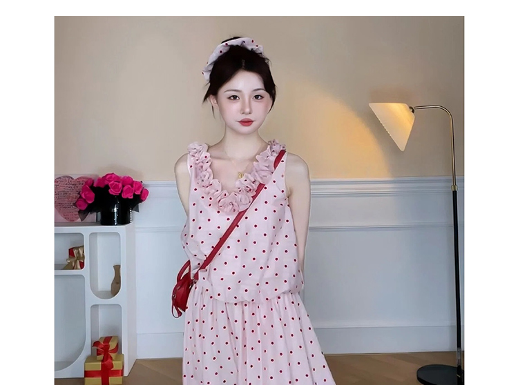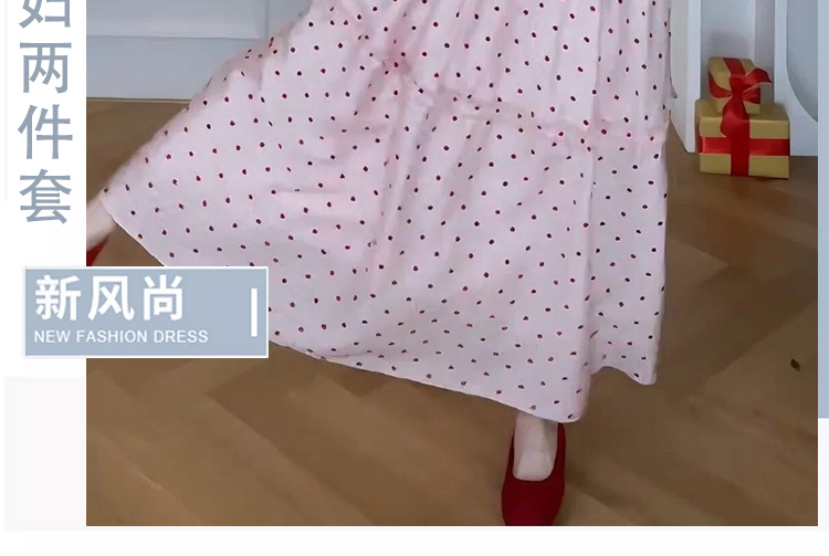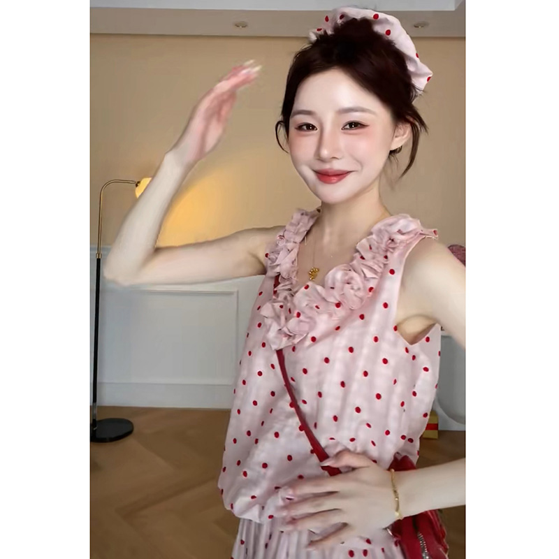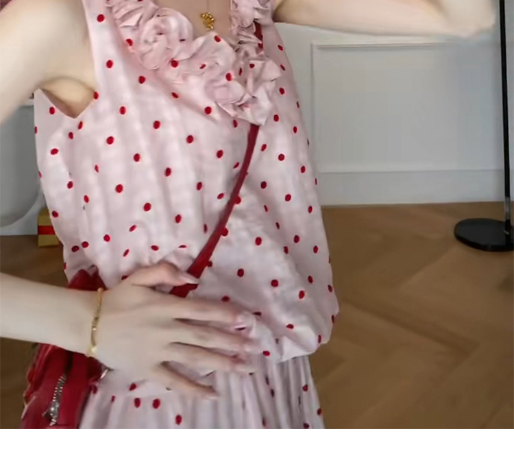 지금 임산부 한 부서 달콤함 식물 플러시 도트 무늬 세트 여성 여름 V넥 민소매 맨위 허리 수축 슬림해 보이는 롱 스커트 투피스 세트