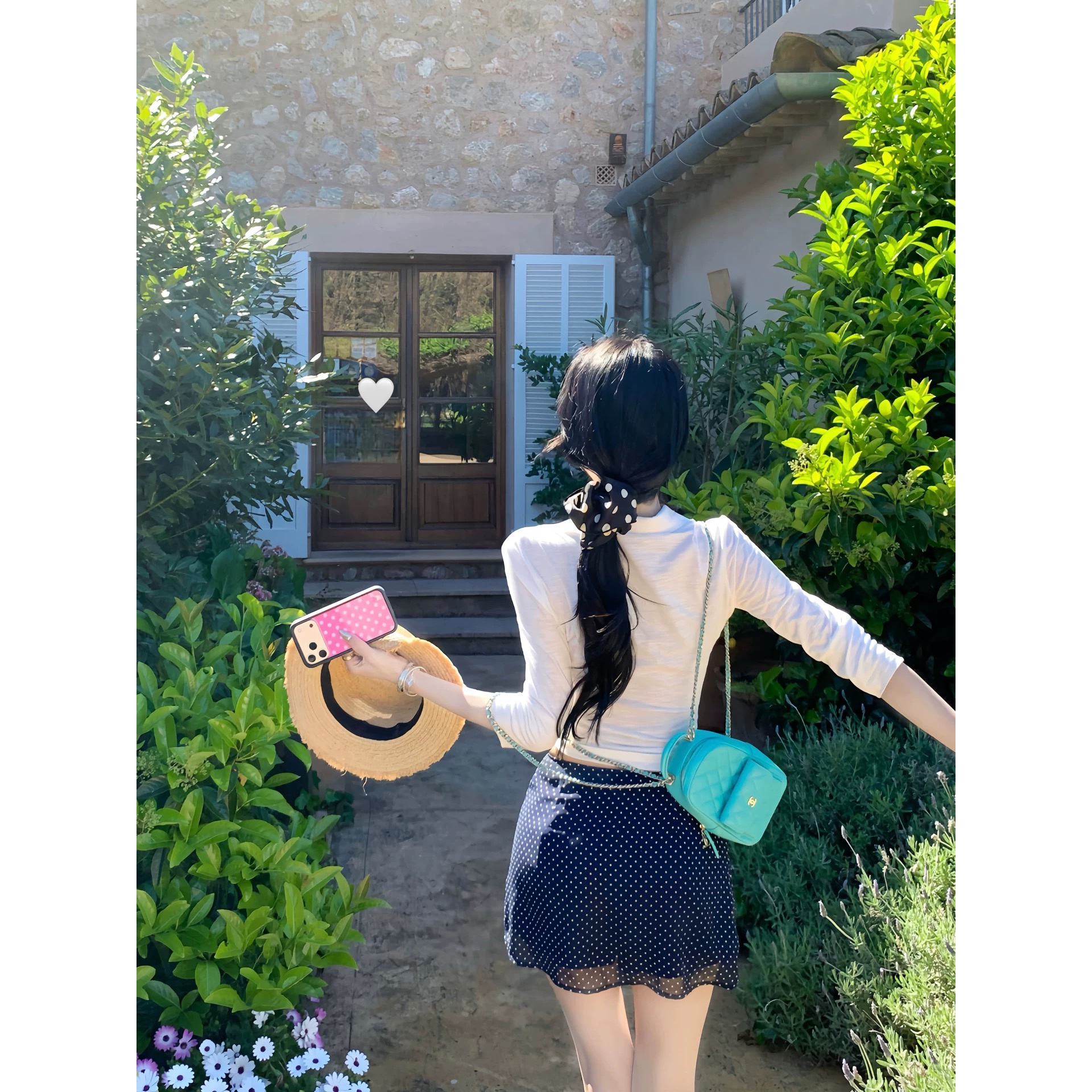 프랑스식 오픈 가디건 흔들다 칼라 슬립 도트 무늬 점프 슈트 치마 세트 휴가 허리 수축 수리