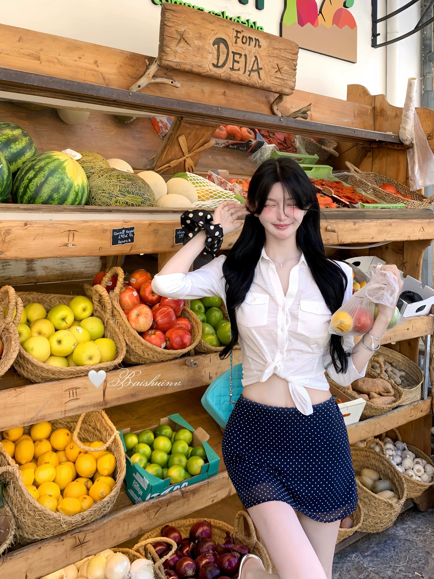 화이트 워터 여성 지능 자매 작은 폴로 칼라 여성 셔츠 여름 느긋한 바람 대나무 마디 질감 센스 가벼움 매듭이 달린 맨위