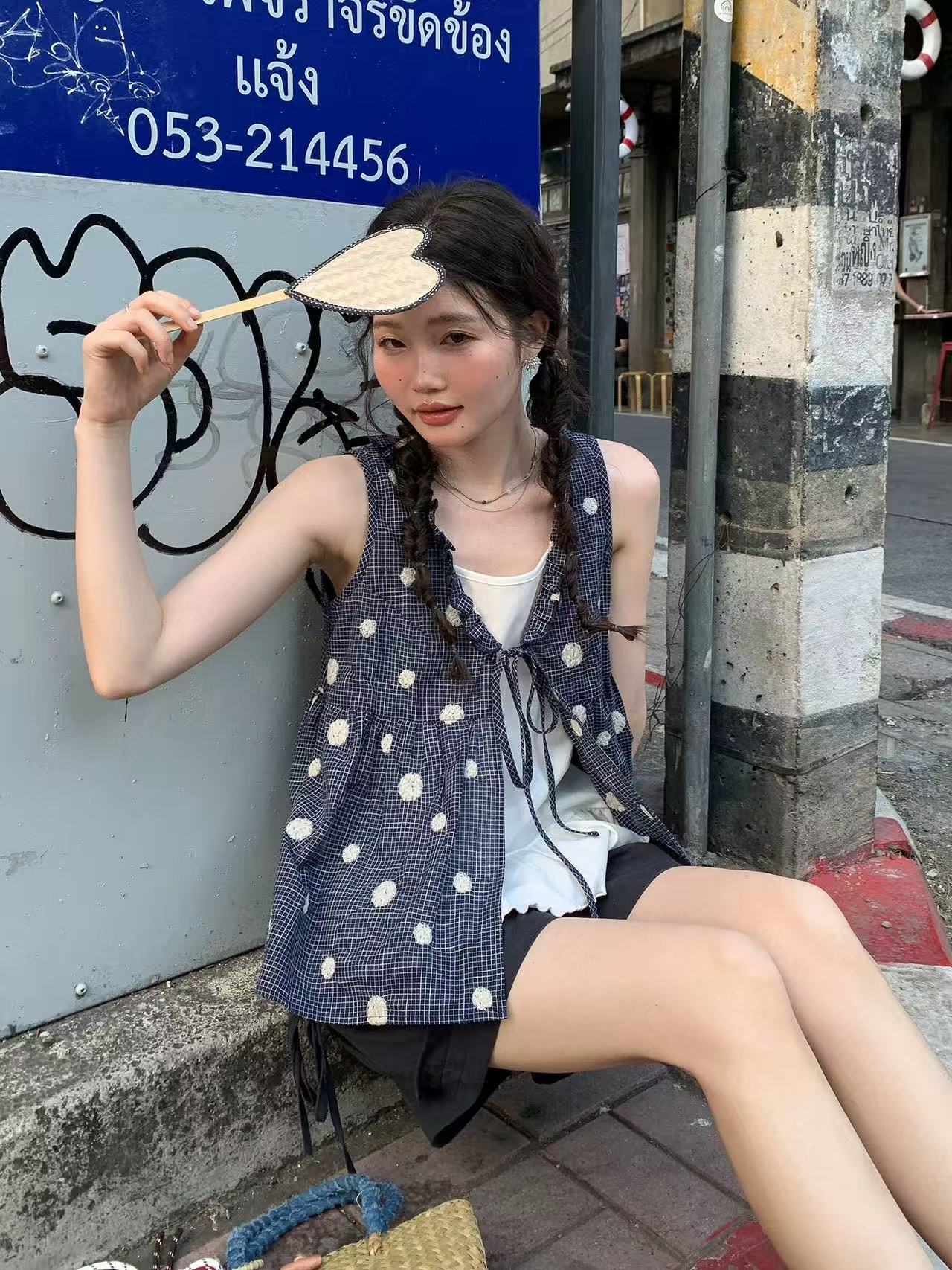 달콤함 똑똑한 3 차원 장식 체크무늬 레이스업 민소매 조끼