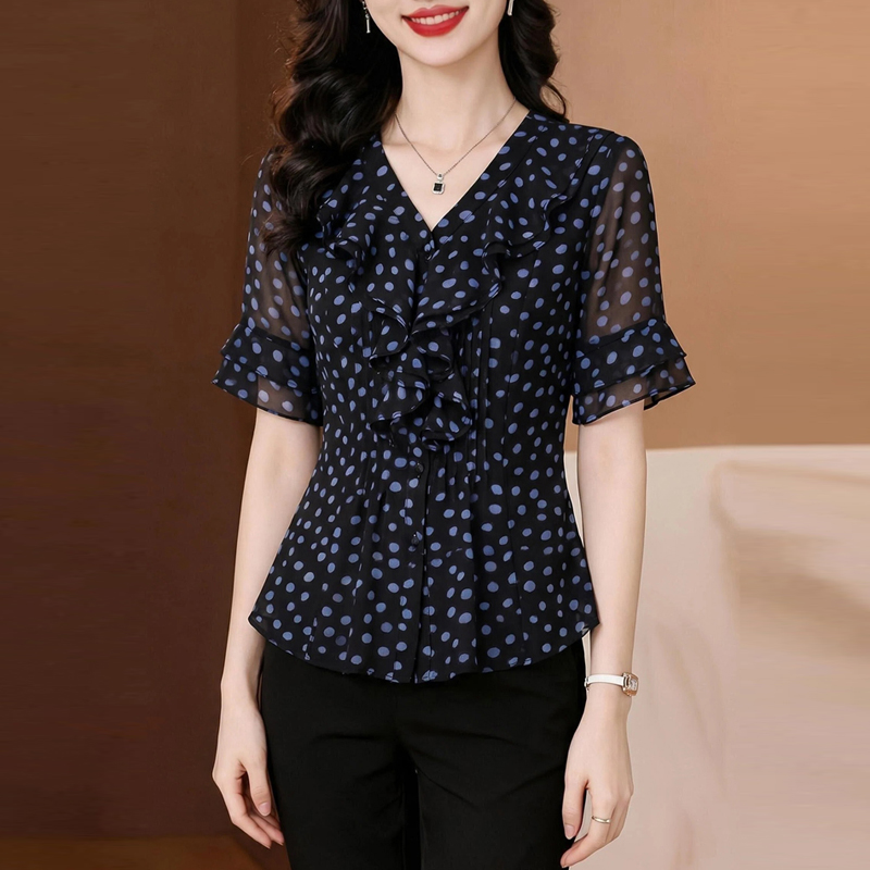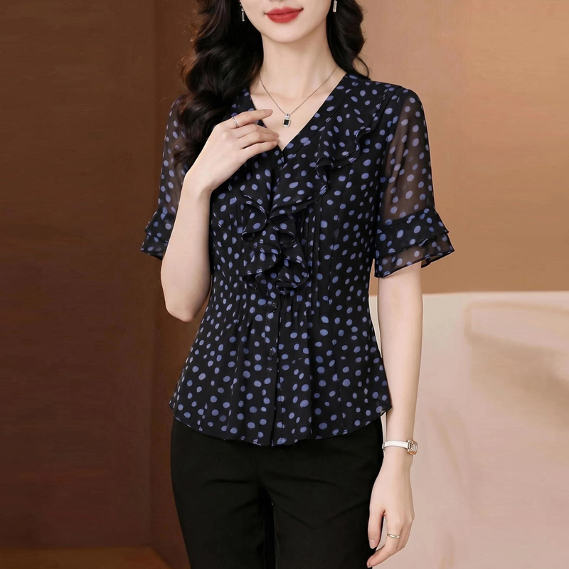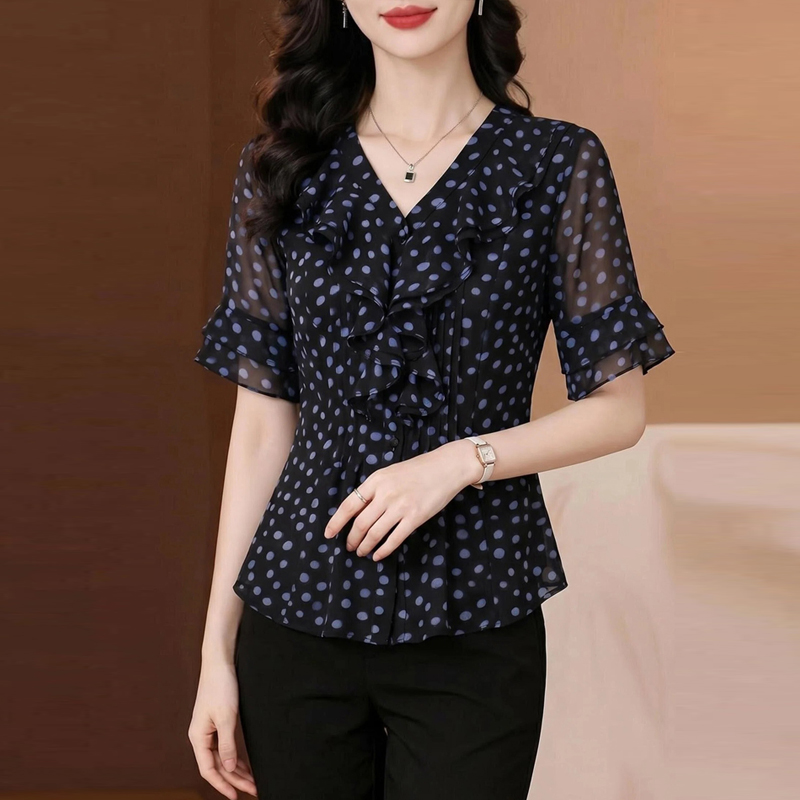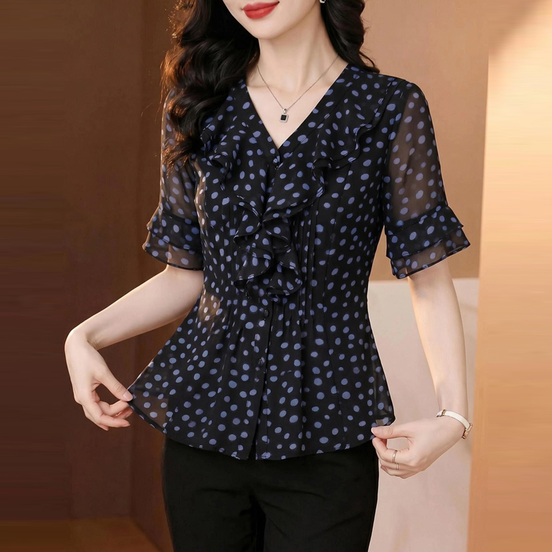 수 있습니다. 맞춤 프랑스식 우아함 파란색 도트 무늬 프릴 V넥 쉬폰 여성 셔츠 여름 디자인 센스 품격 맨위