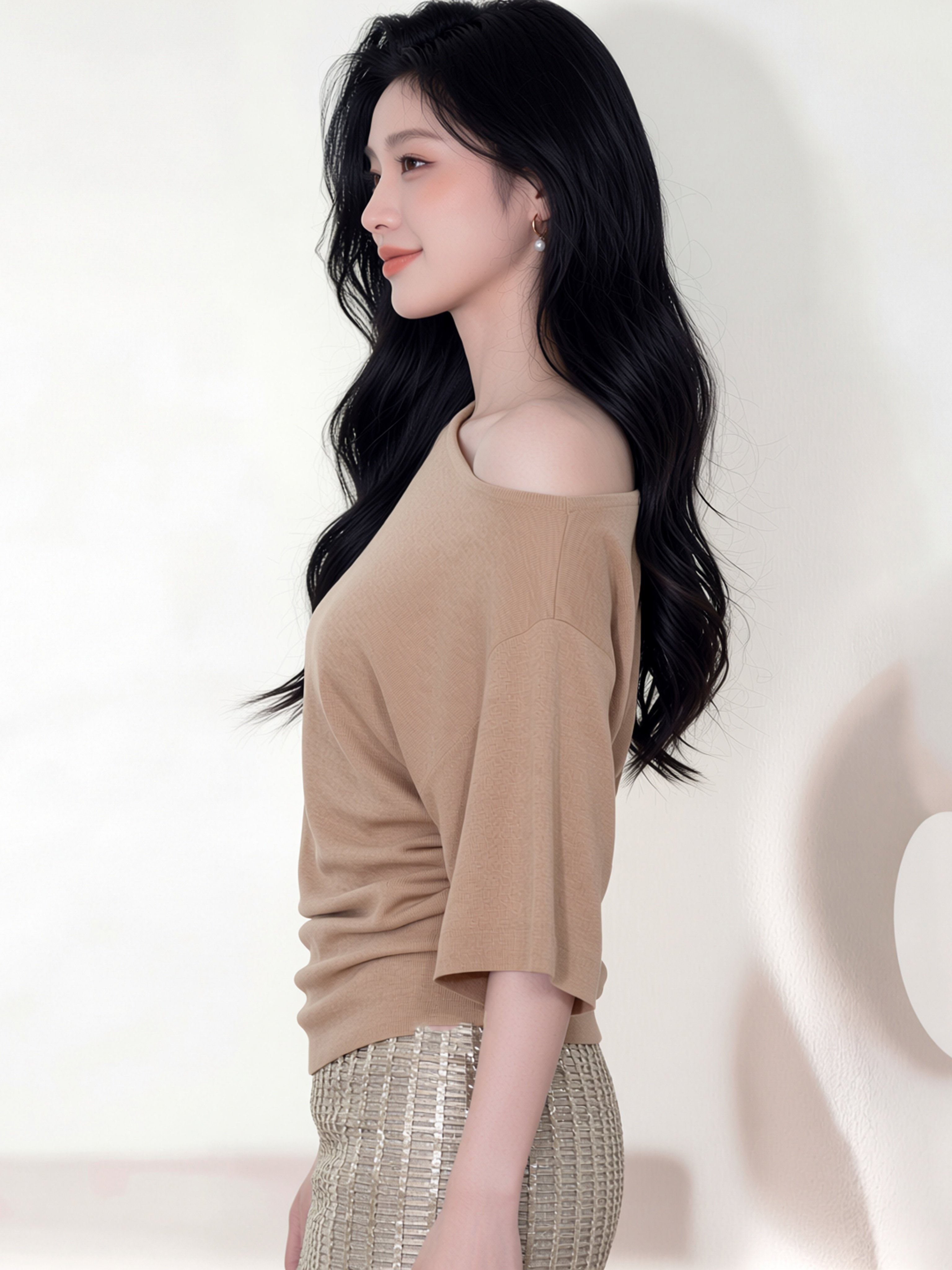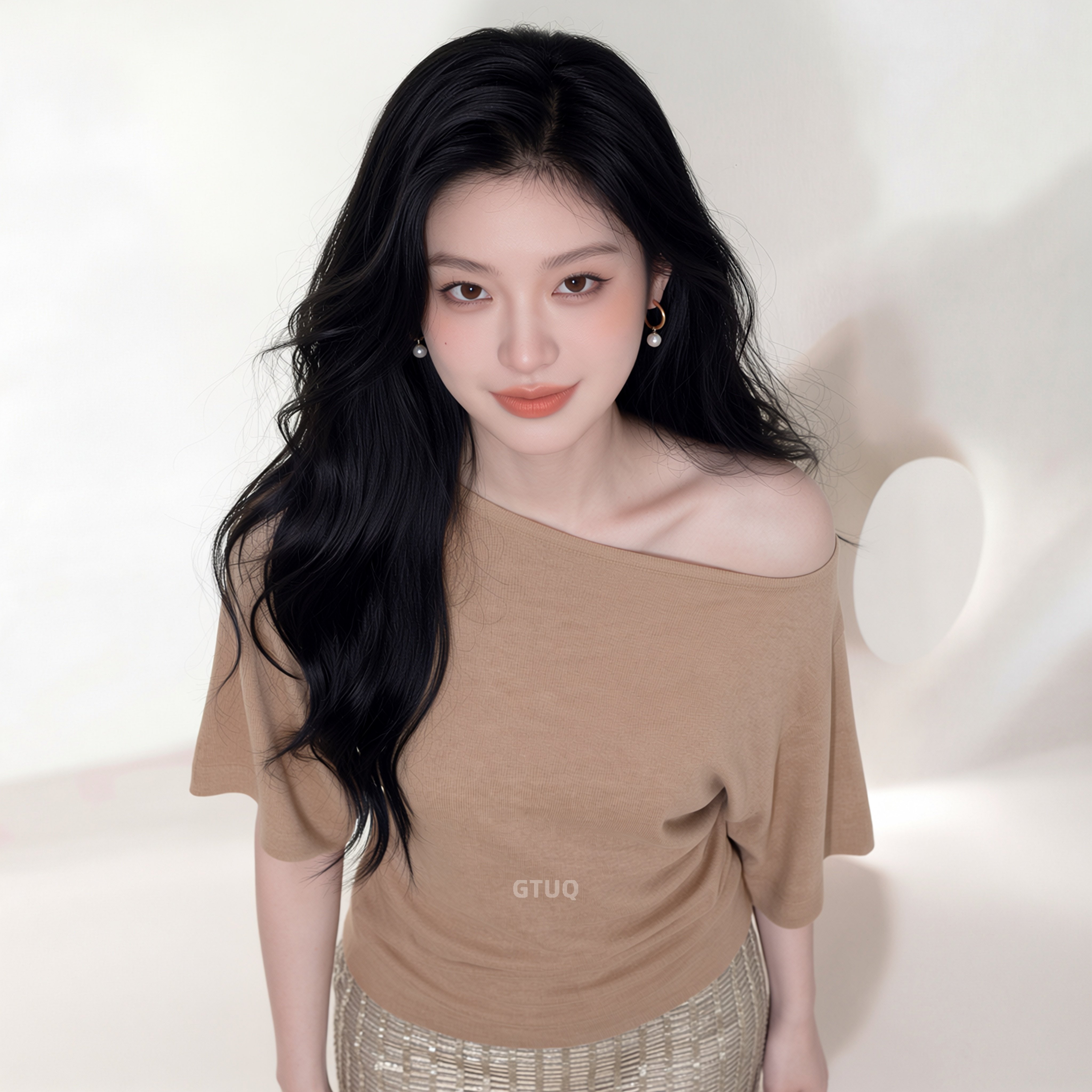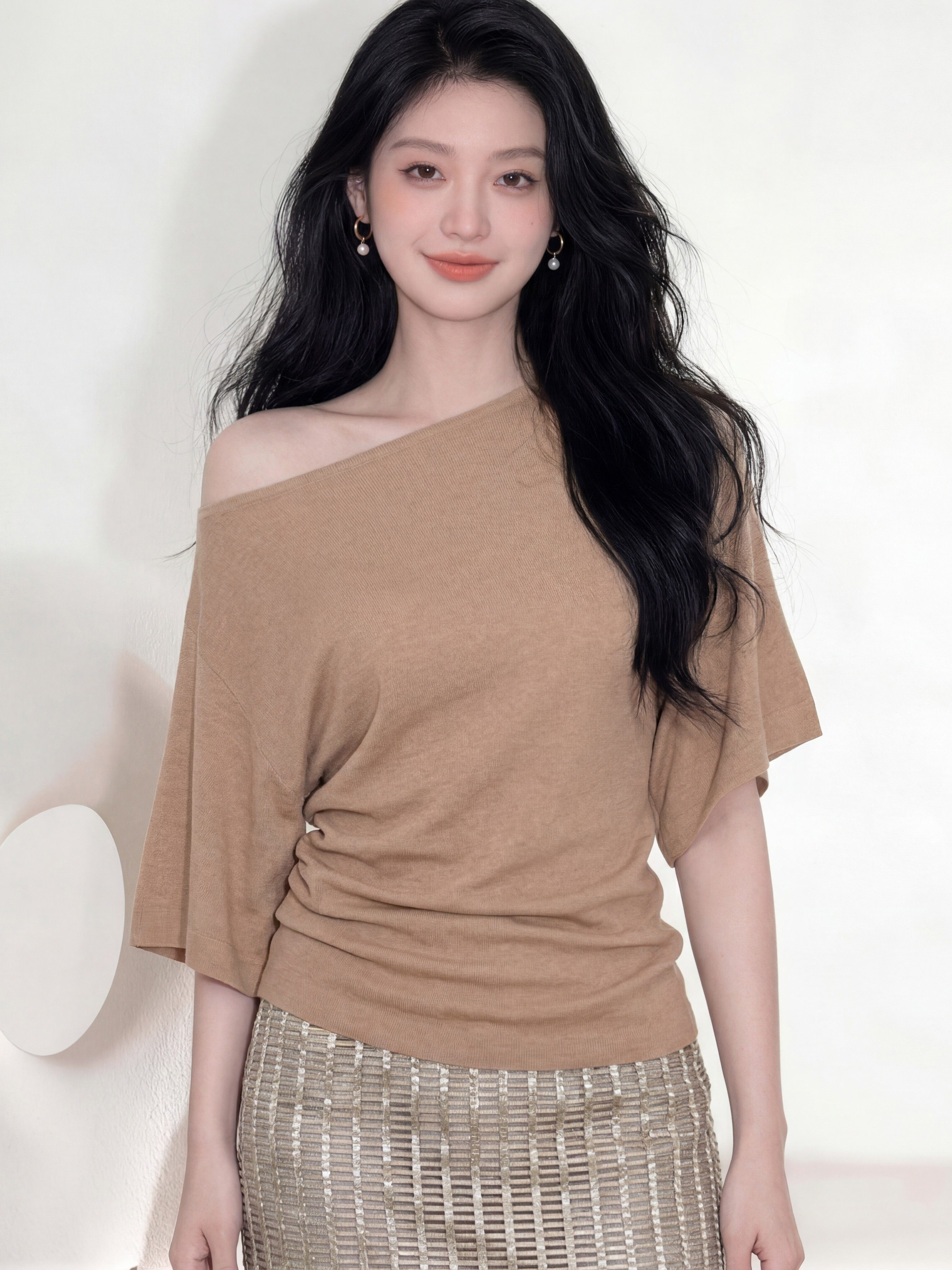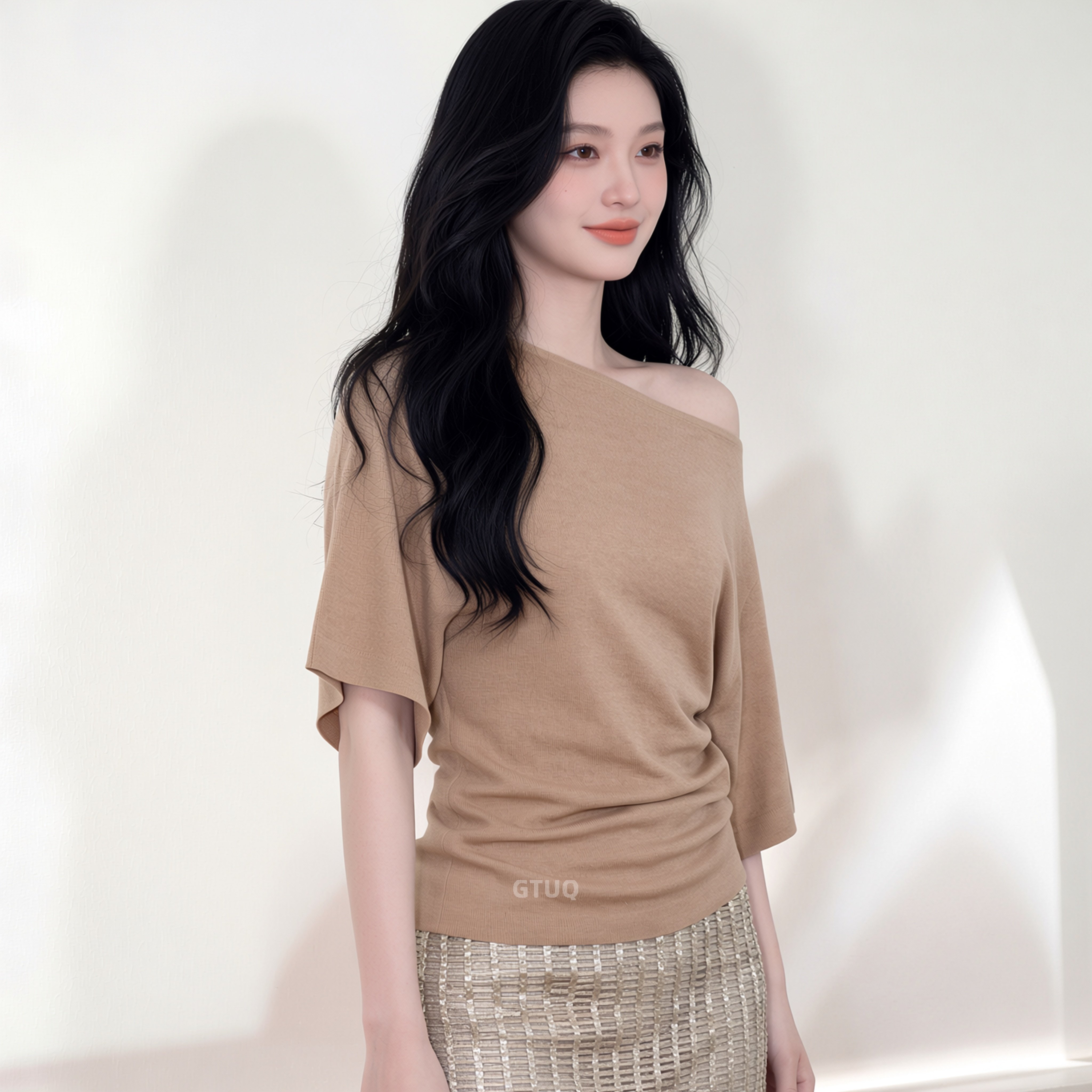 있음 도착 한국 스타일 비스듬한 어깨 니트 스웨터 여성 2026 여름 몸매 가꾸기 슬림해 보이는 반팔 맨위 Chic