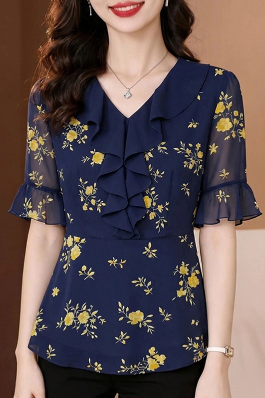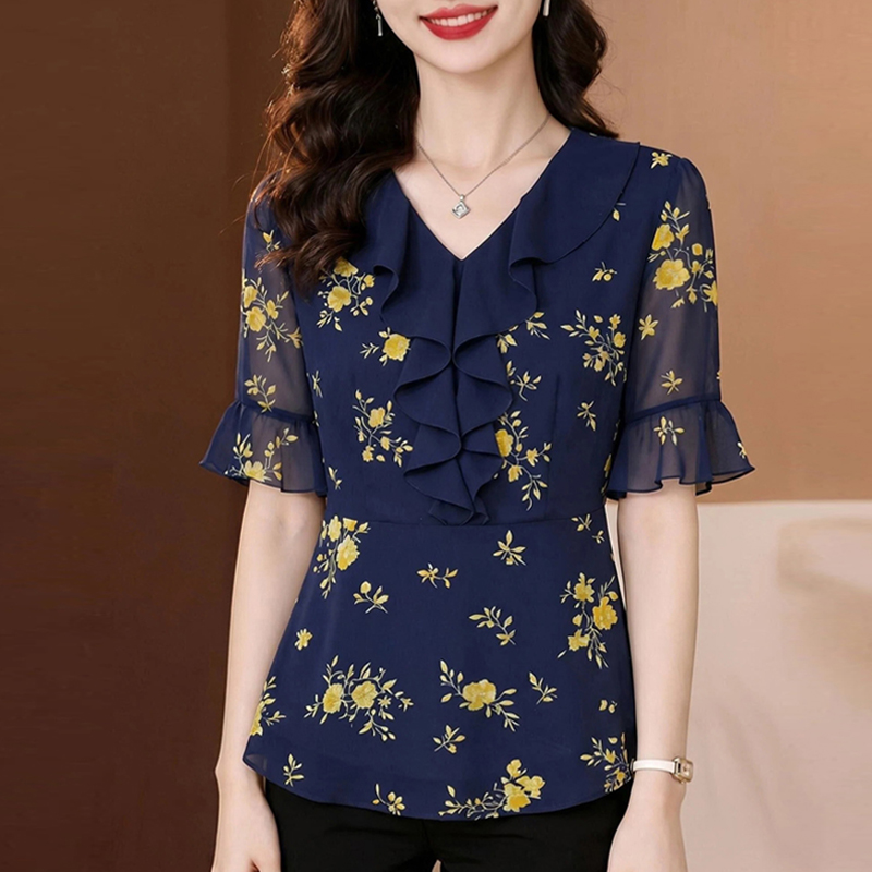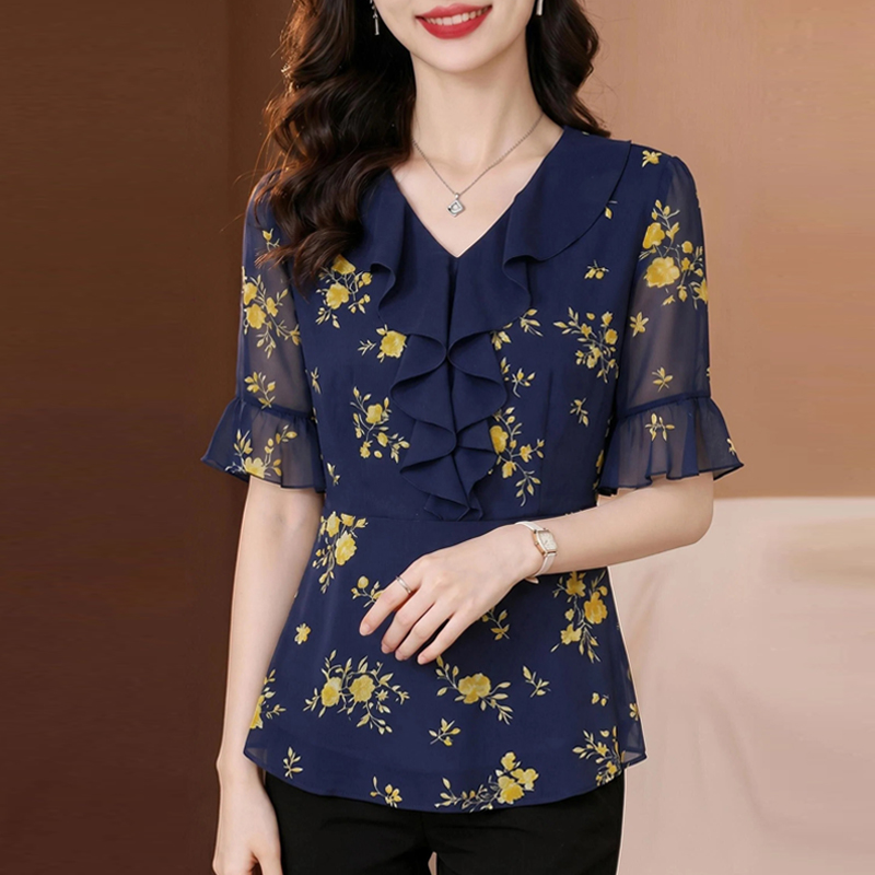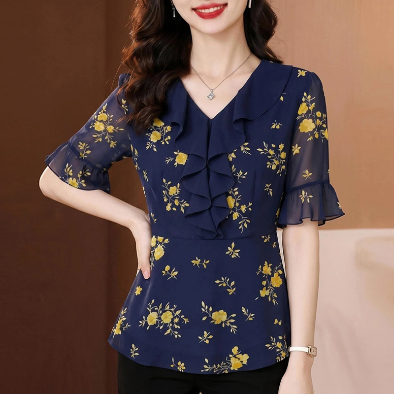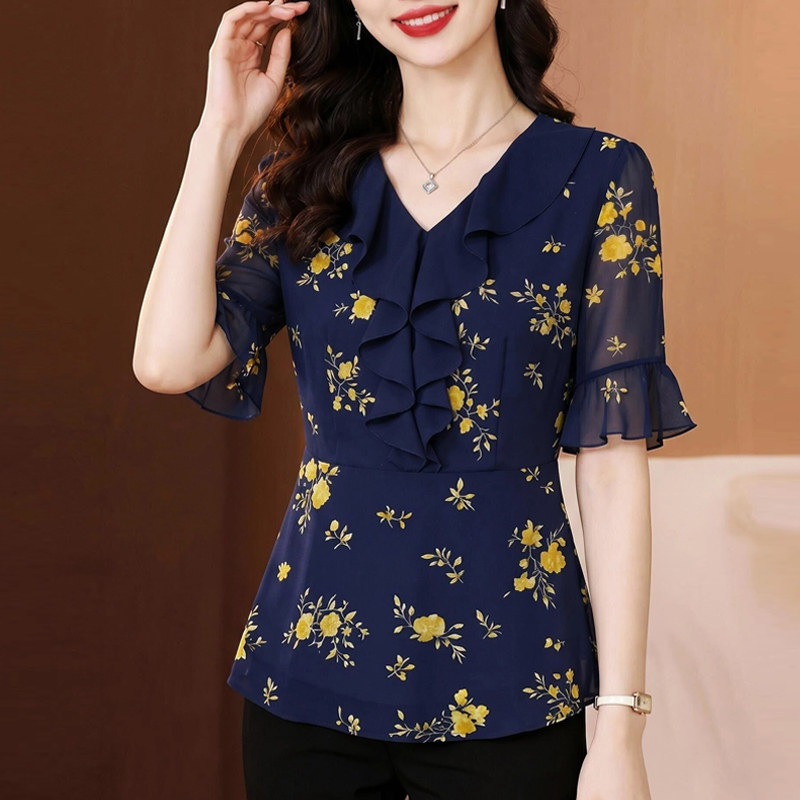 프랑스식 V넥 블루 커피 색상 프릴 맨위 여성 여름 새로운 디자인 센스 슬림해 보이는 품격 반팔 쉬폰 셔츠