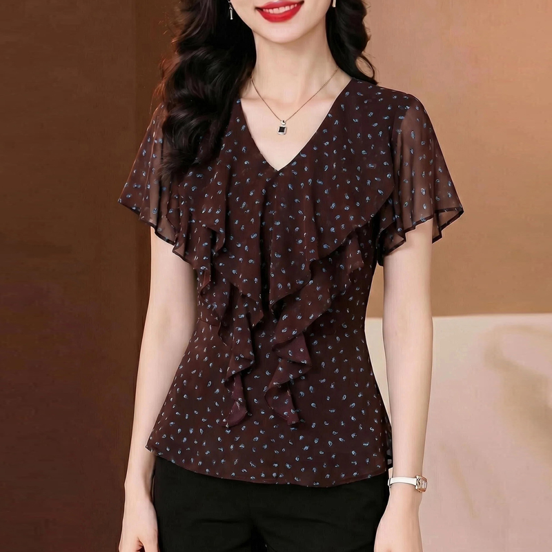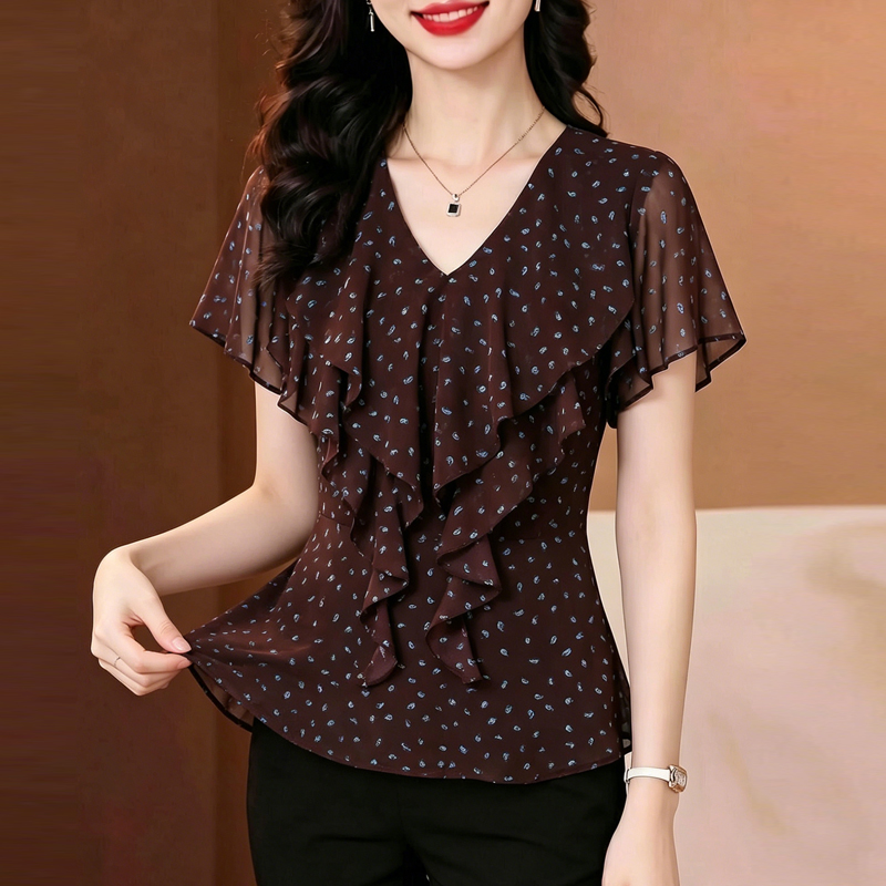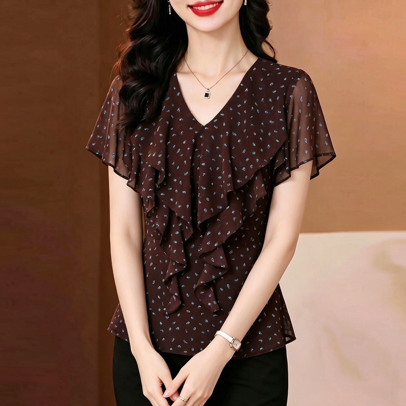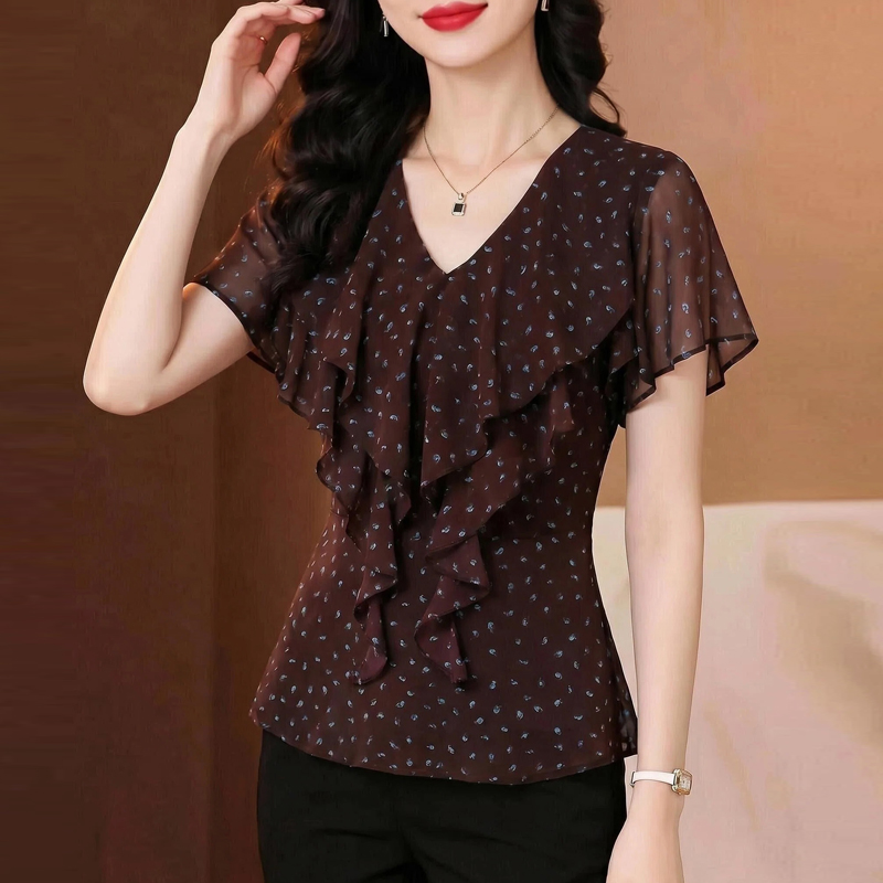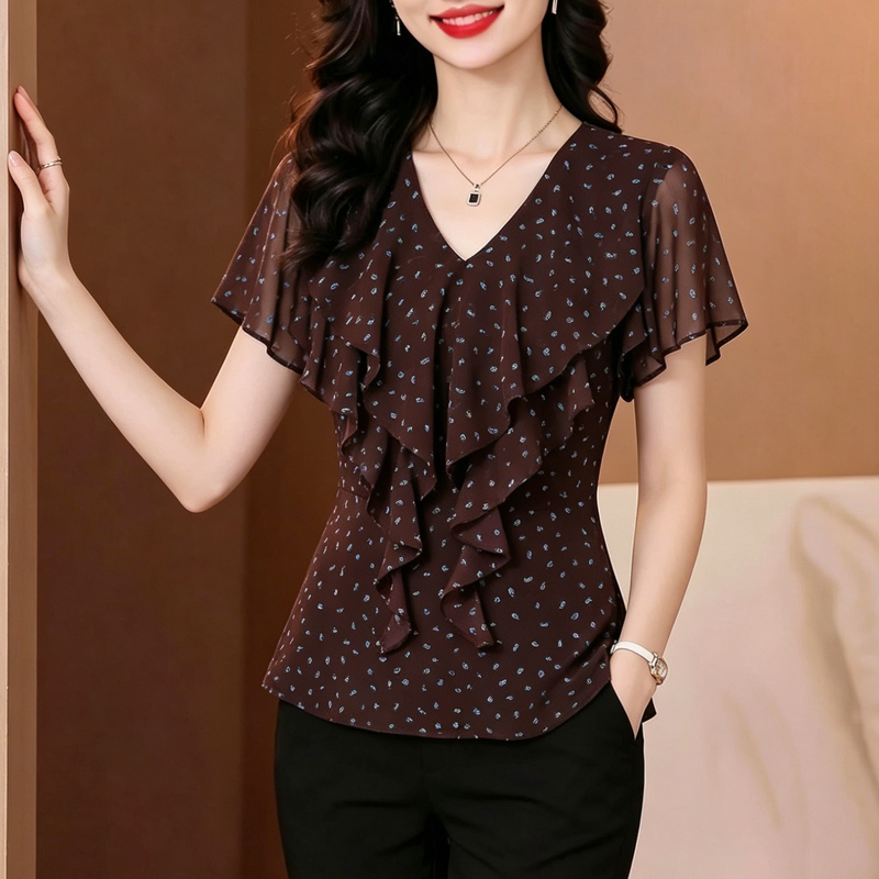 프랑스식 V넥 블루 커피 색상 프릴 맨위 여성 여름 새로운 디자인 센스 슬림해 보이는 품격 반팔 쉬폰 셔츠