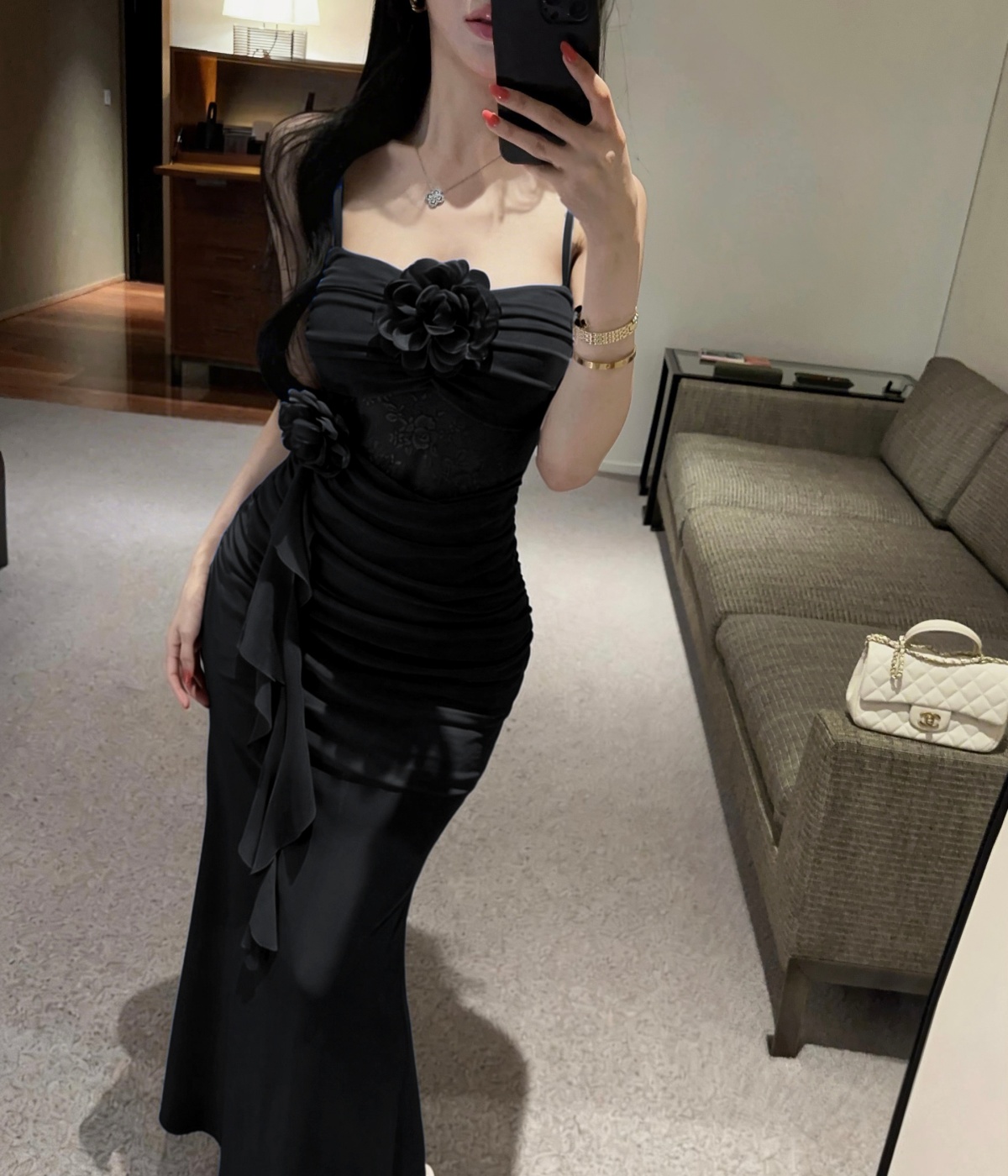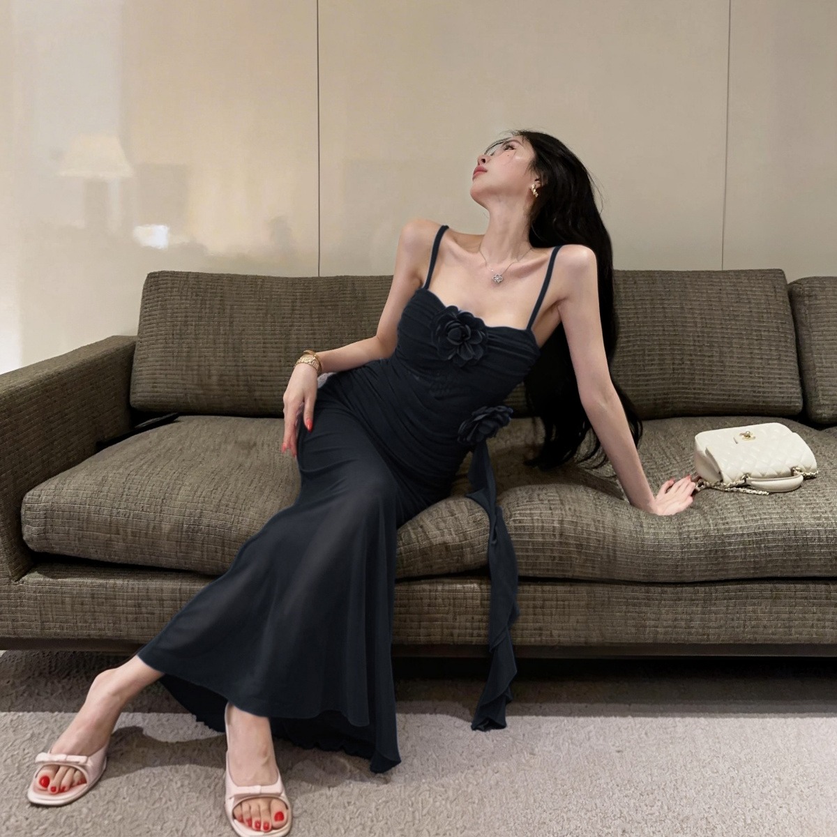 실사 섹시함 로얄 자매 바람 V넥 백리스 인어 꼬리 롱 스커트 여성 디자인 센스 몸매 가꾸기 슬림해 보이는 슬립 타이트 스커트 드레스