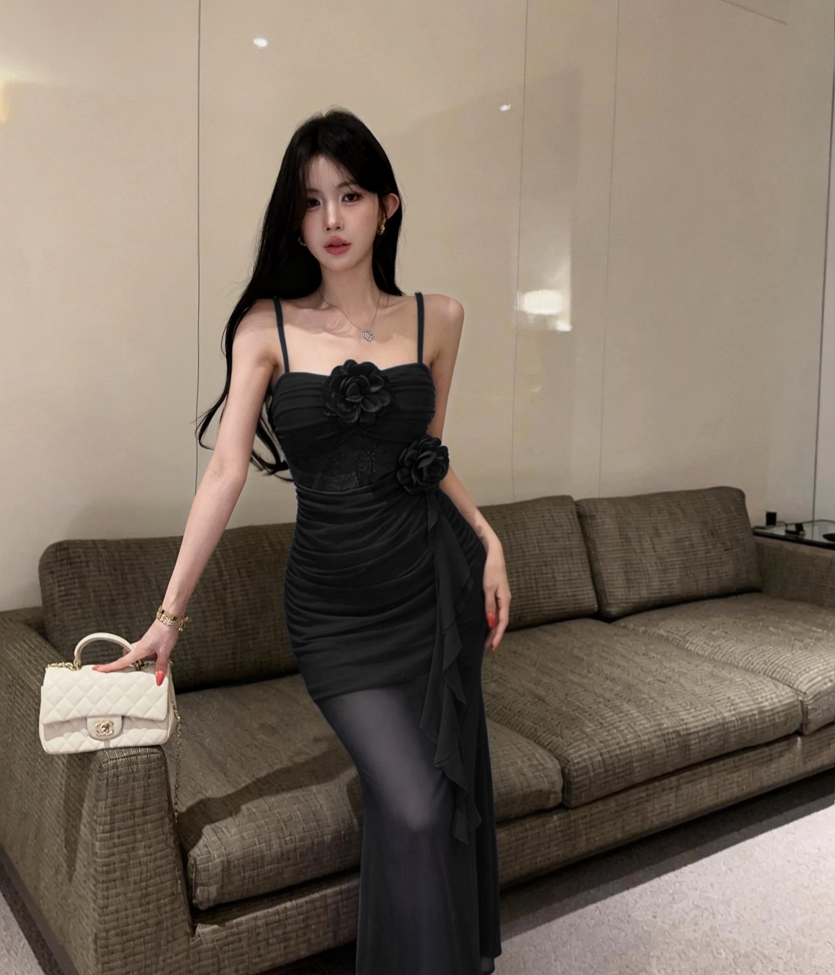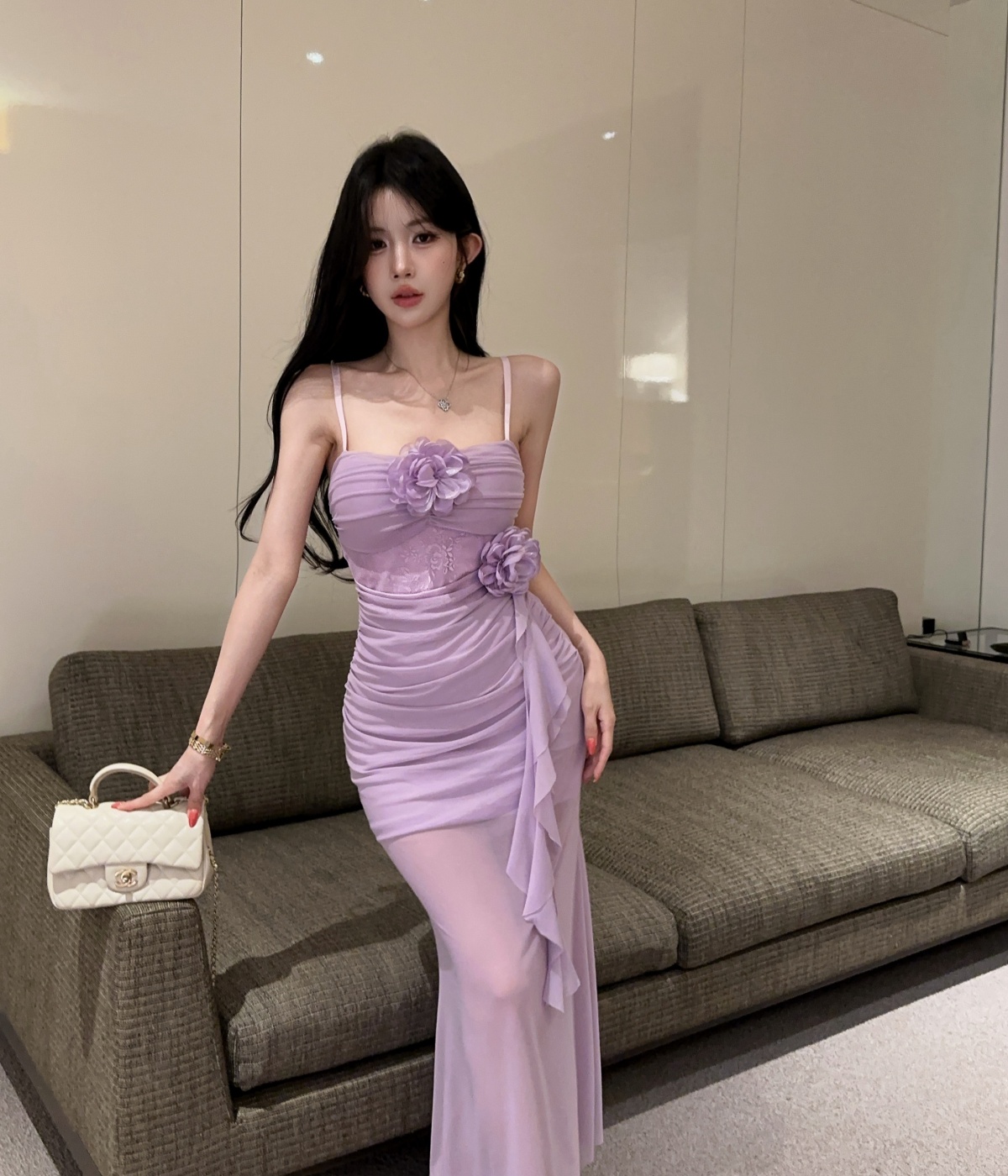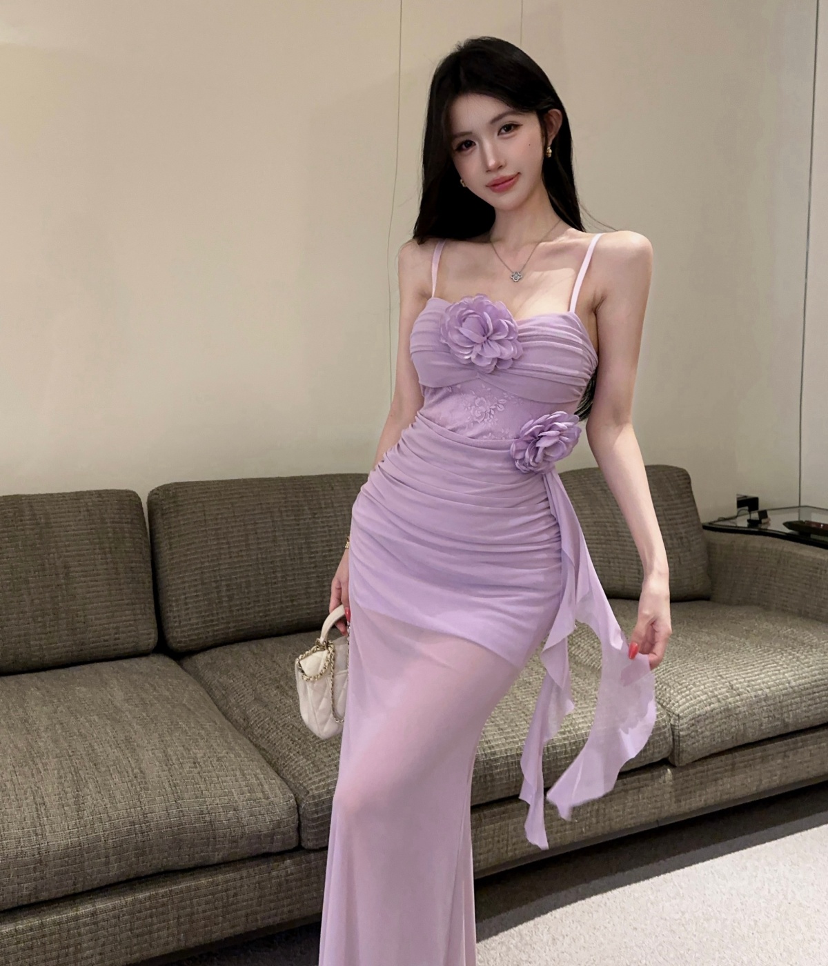 실사 섹시함 핫걸 튜브탑 망사 드레스 순수한 욕망 바람 디자인 센스 몸매 가꾸기 슬림해 보이는 오프숄더 롱 스커트