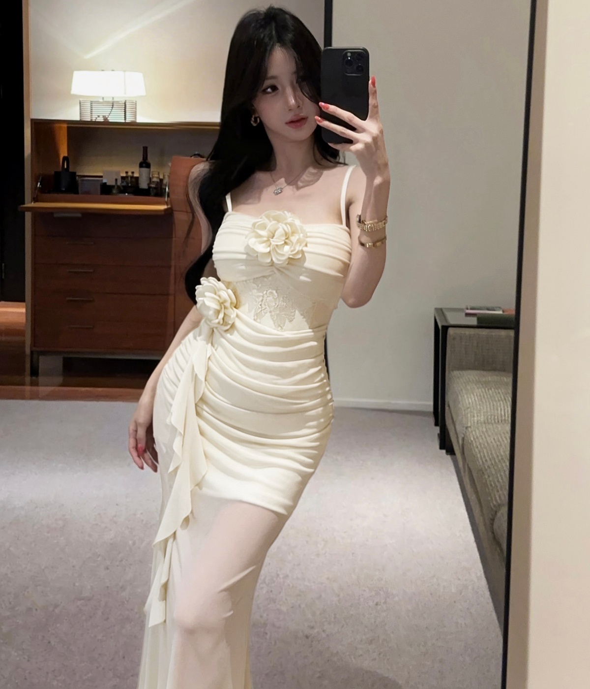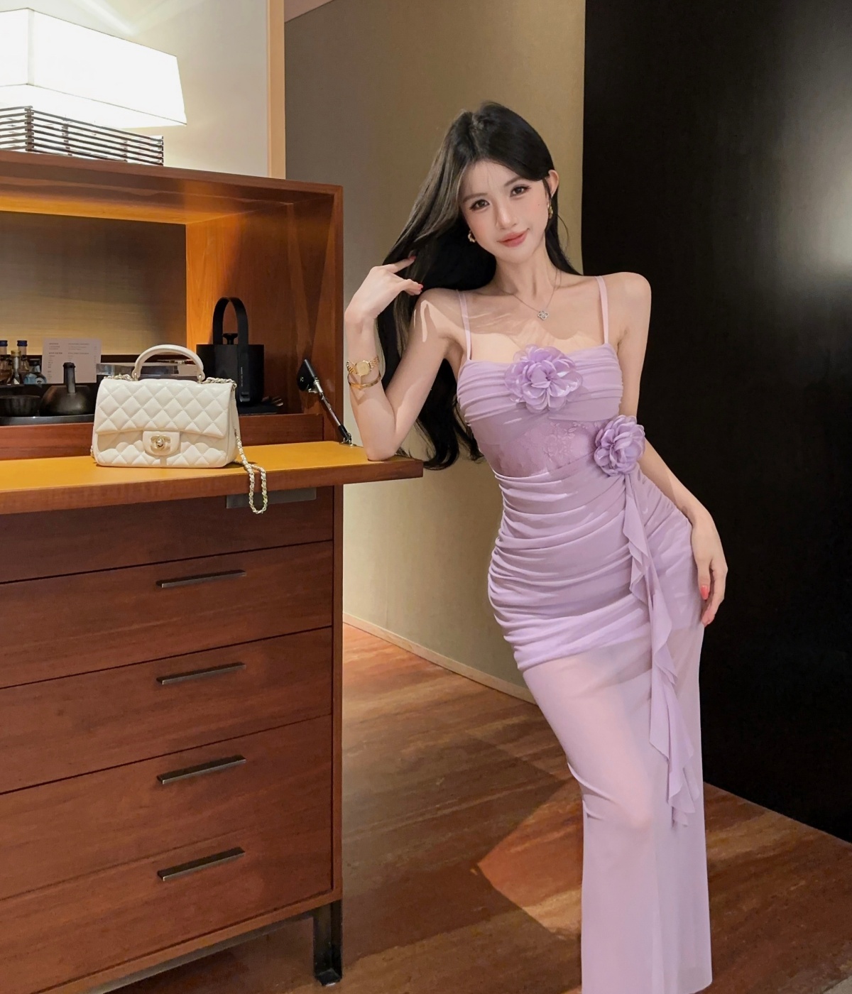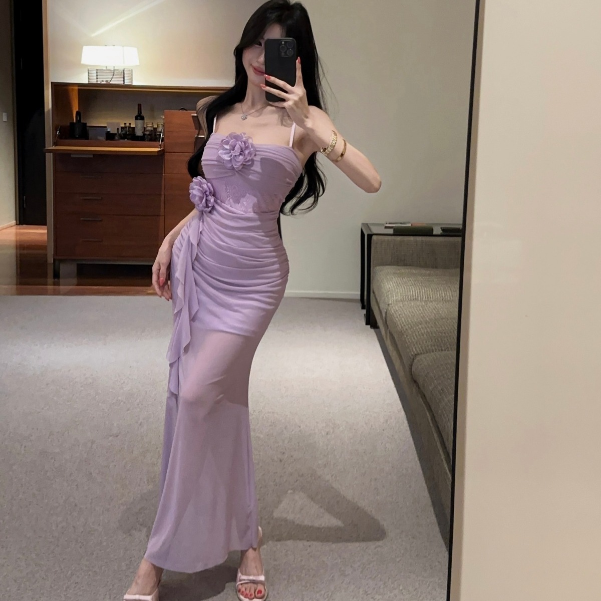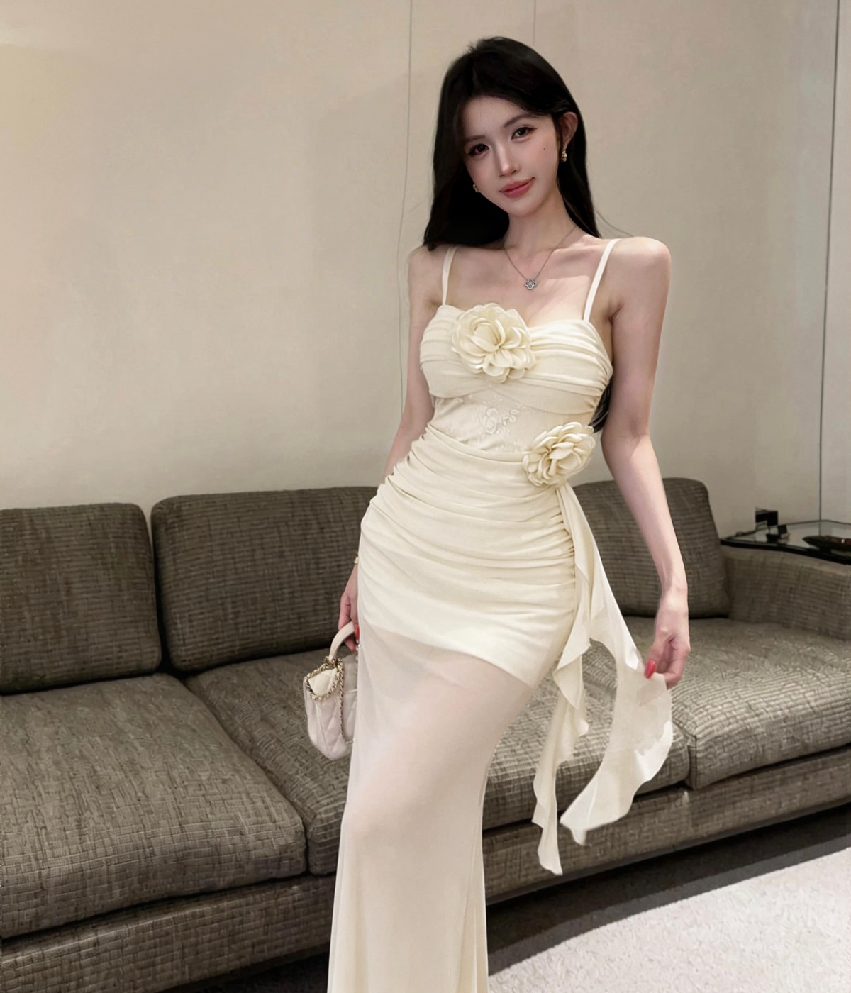실사 섹시함 핫걸 튜브탑 망사 드레스 순수한 욕망 바람 디자인 센스 몸매 가꾸기 슬림해 보이는 오프숄더 롱 스커트