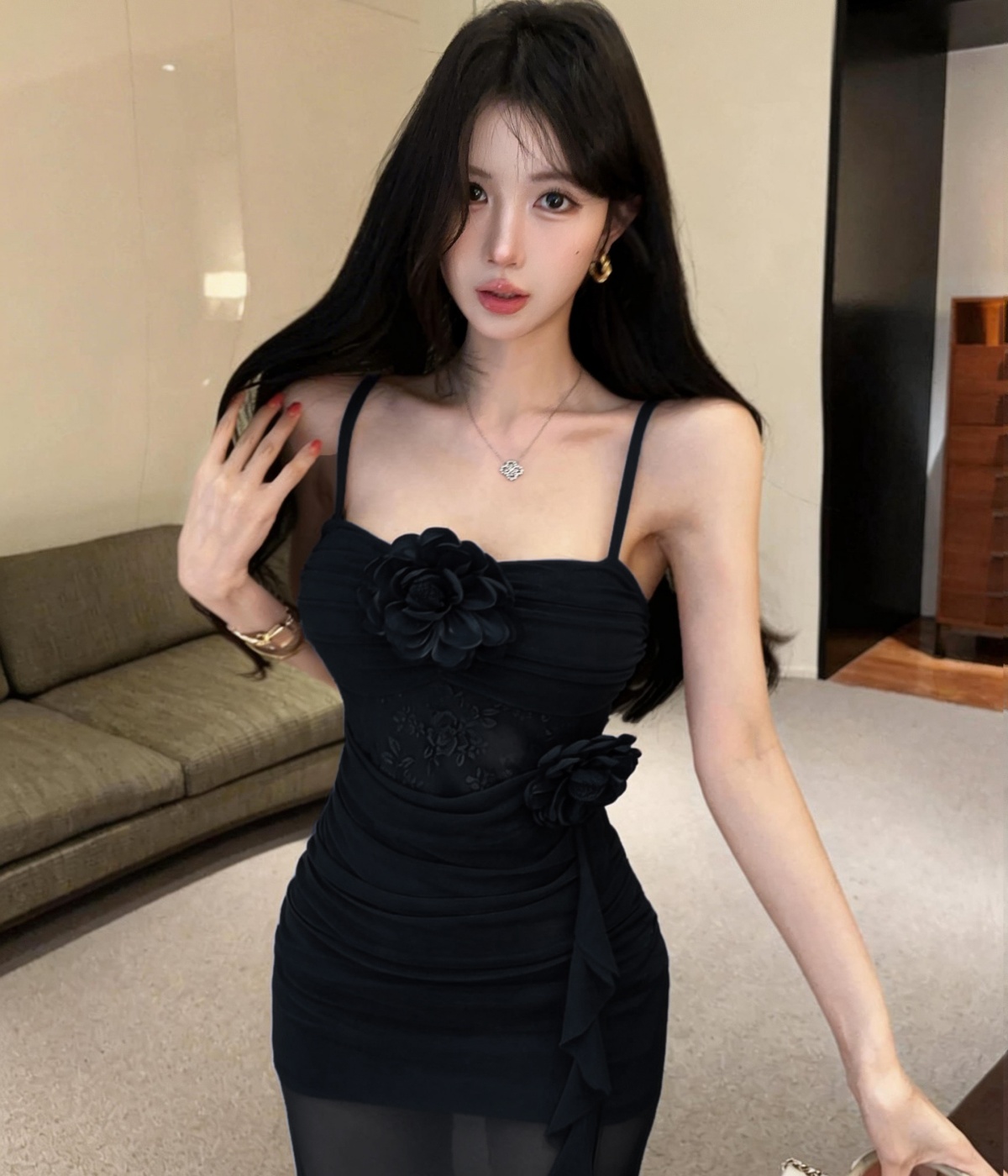 실사 순수한 욕망 섹시함 프릴 쇼트 스타일 타이트 스커트 배색 드레스 복장