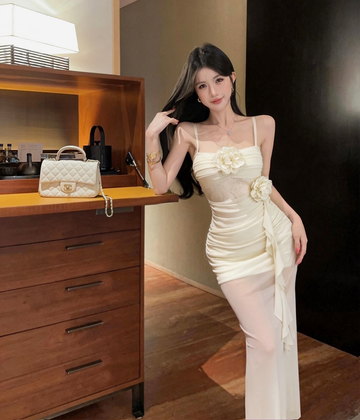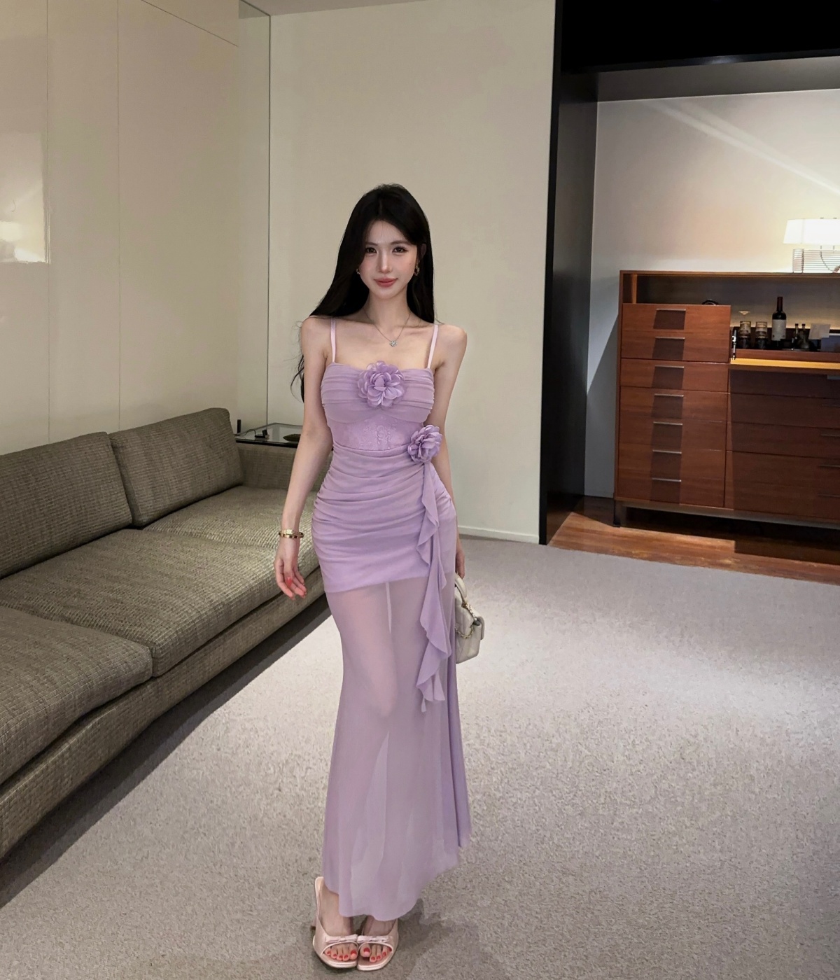 실사 섹시함 망사 롱 코트 슬립 드레스