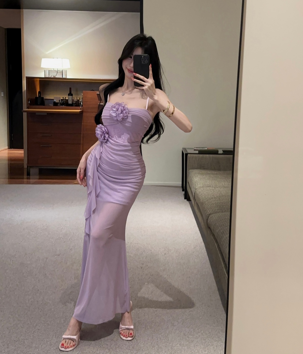 실사 새로운 명문 여성 품격 여신 슬림해 보이는 한국 망사 꽃무늬 드레스