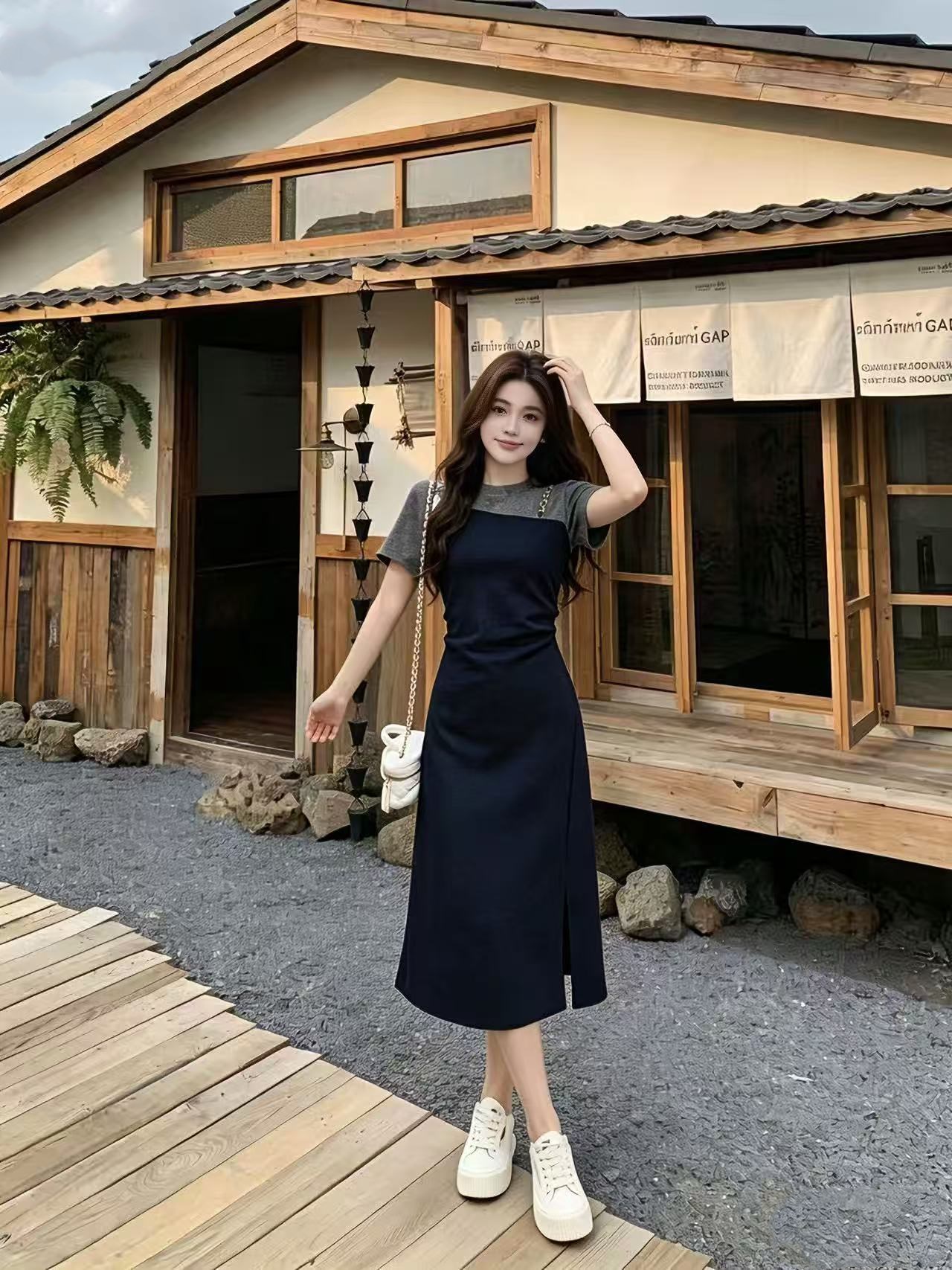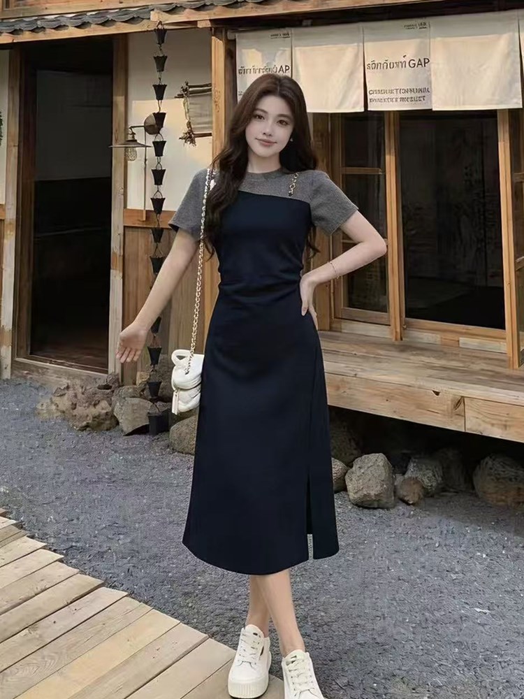2026 여름 새로운 지방 mm 디자인 센스 페이크 레이어드 패치워크 허리 수축 연령 감소 고급 품격 중간 길이 드레스