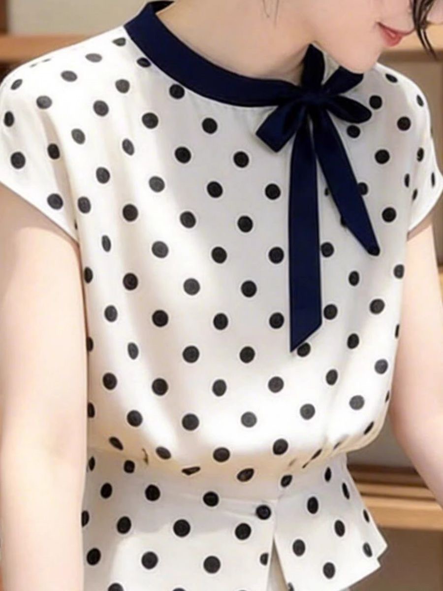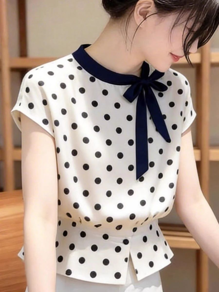 배색 나비 매듭 우아함 품격 반팔 작은 셔츠 2026 여름 허리 수축 다용도 맨위 달콤함 연령 감소 기본 셔츠
