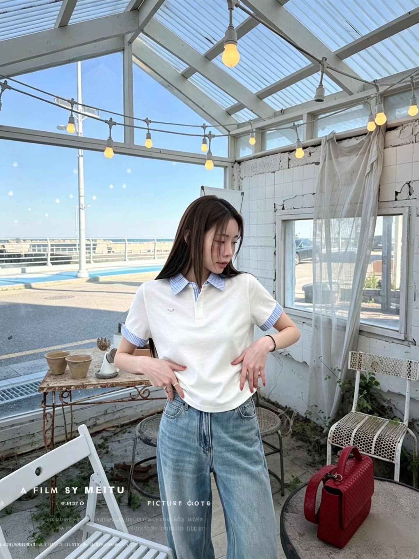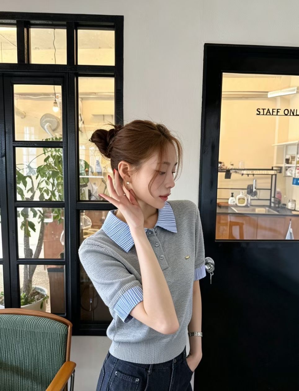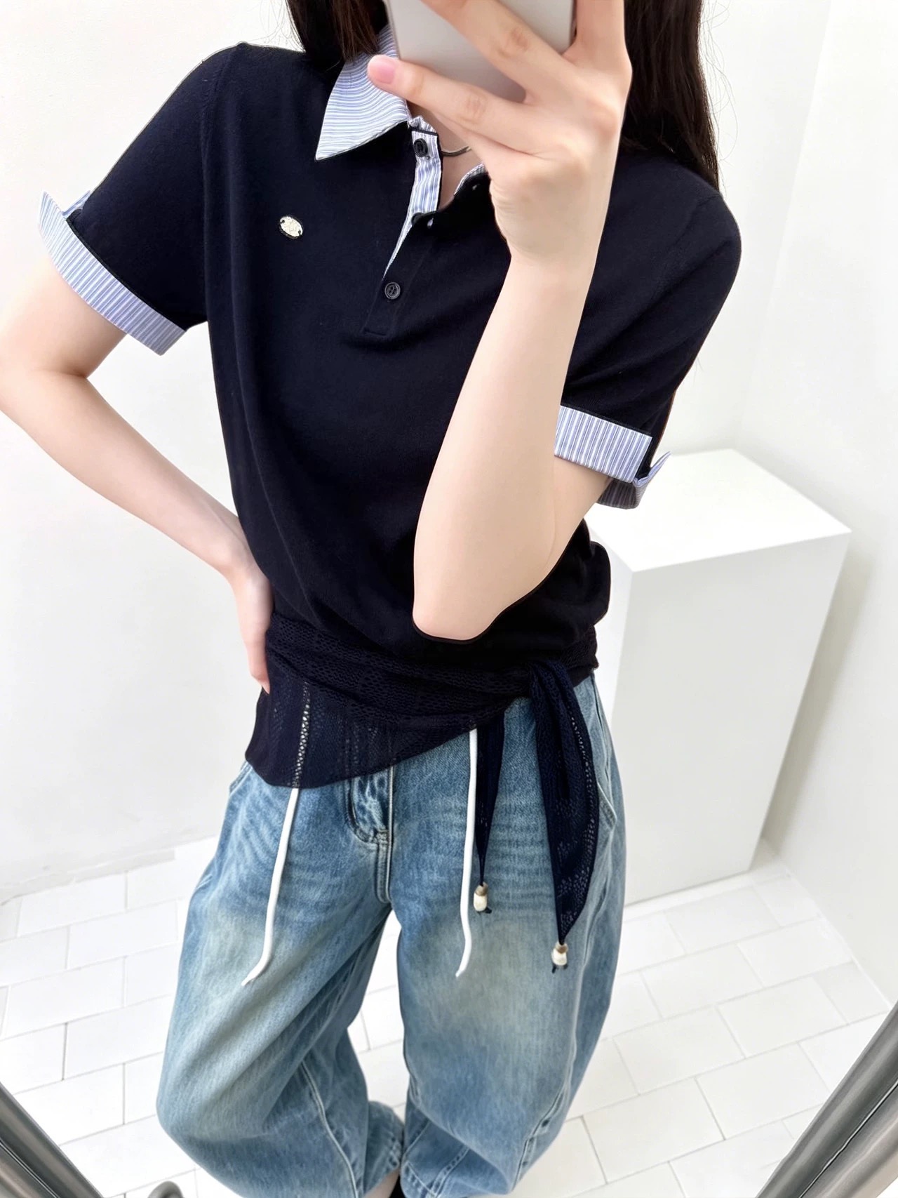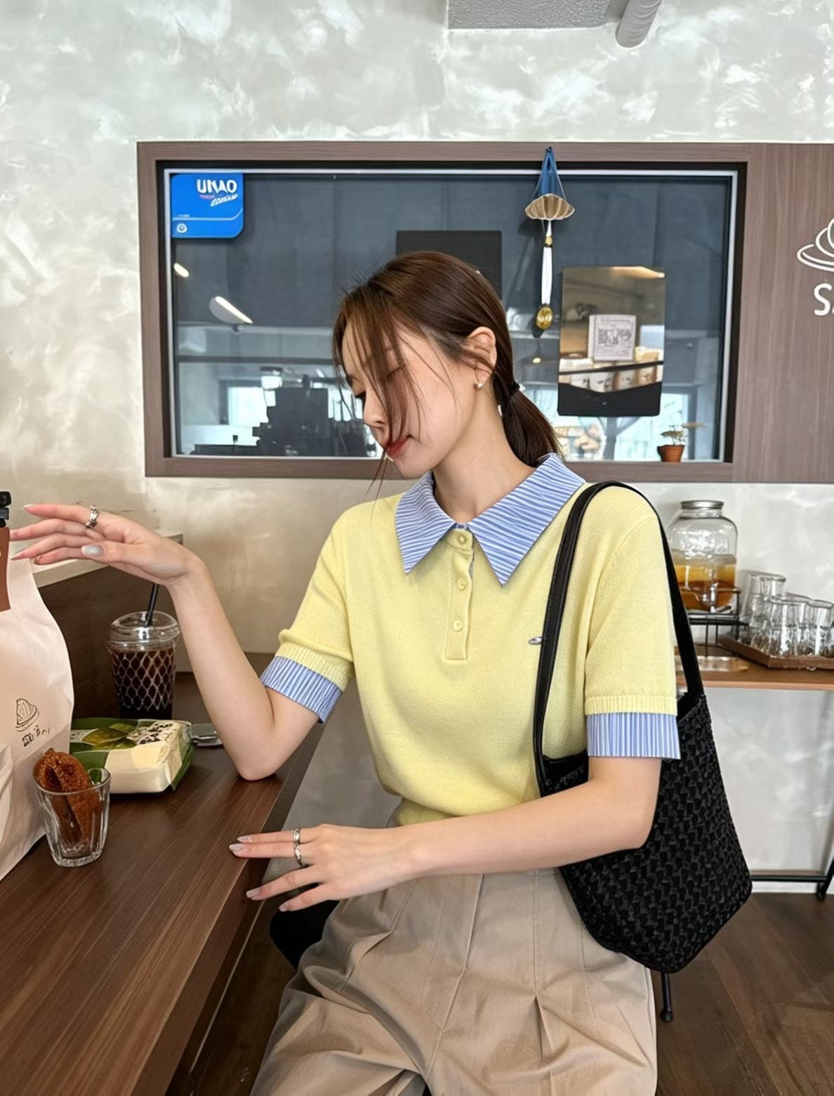 한 부서 학원 스타일 POLO 칼라 배색 긍정적 인 어깨 몸매 가꾸기 슬림해 보이는 패치워크 반팔 티셔츠 다용도 외국 가스 니트 스웨터
