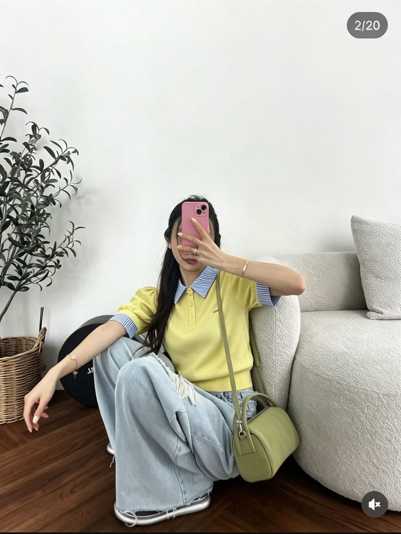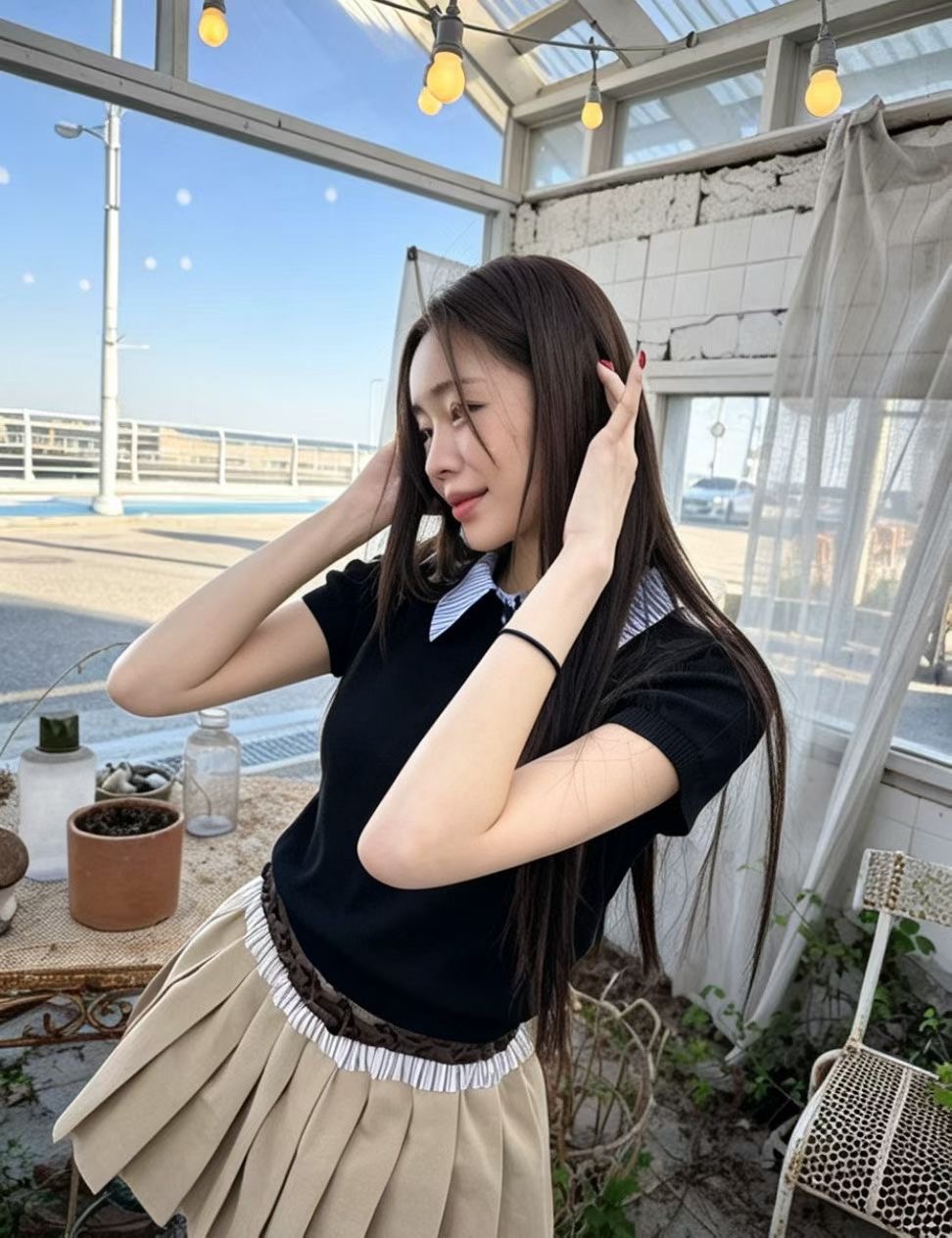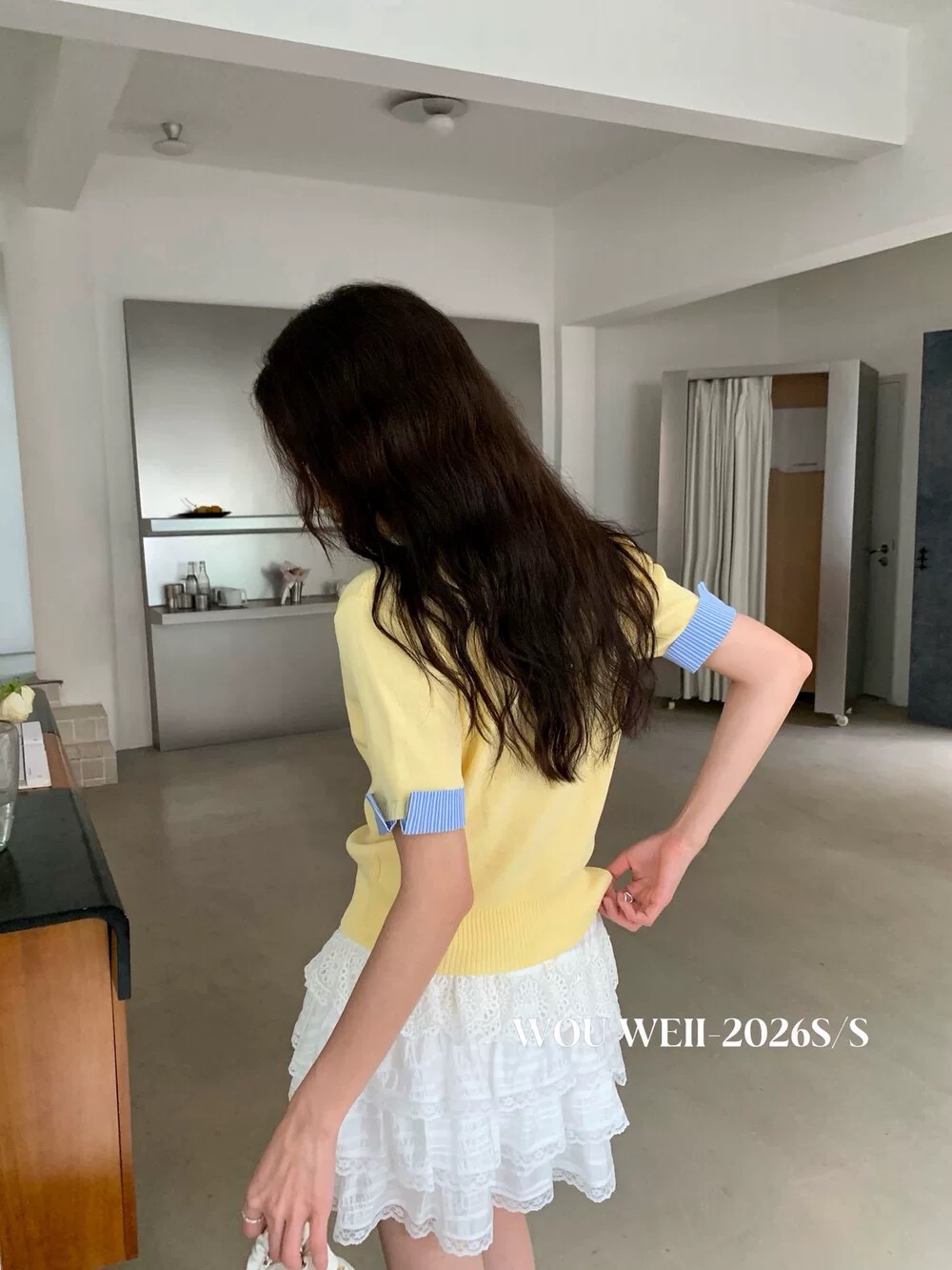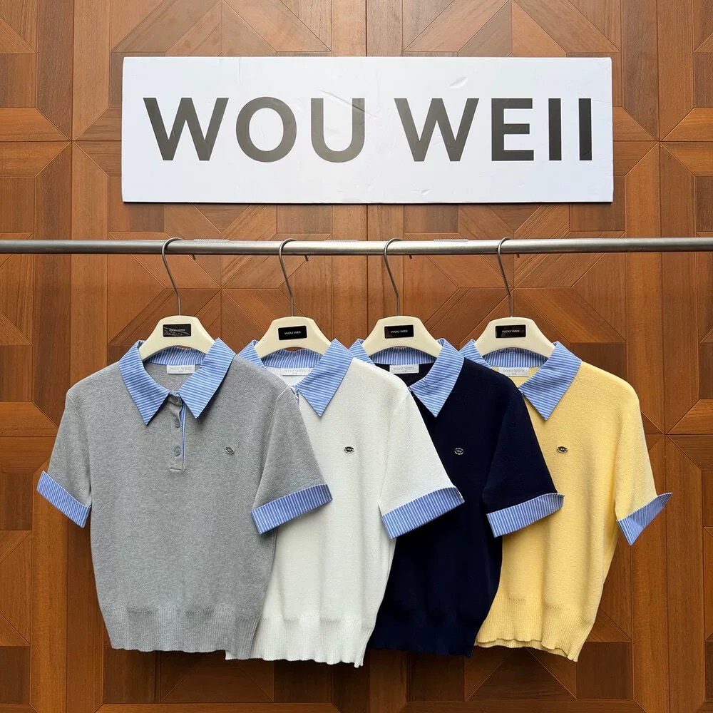 한 부서 학원 스타일 POLO 칼라 배색 긍정적 인 어깨 몸매 가꾸기 슬림해 보이는 패치워크 반팔 티셔츠 다용도 외국 가스 니트 스웨터