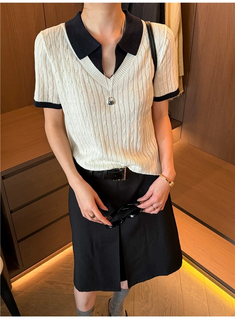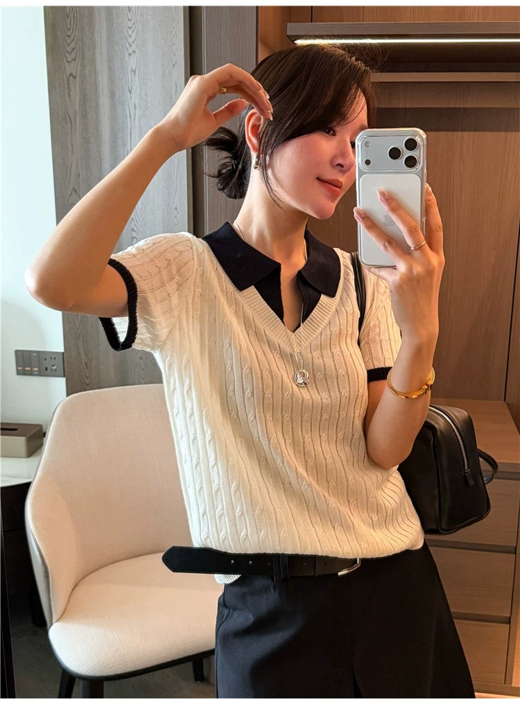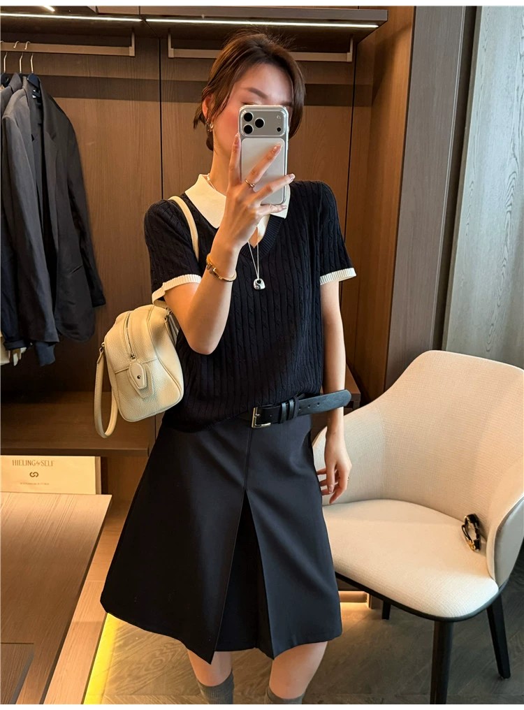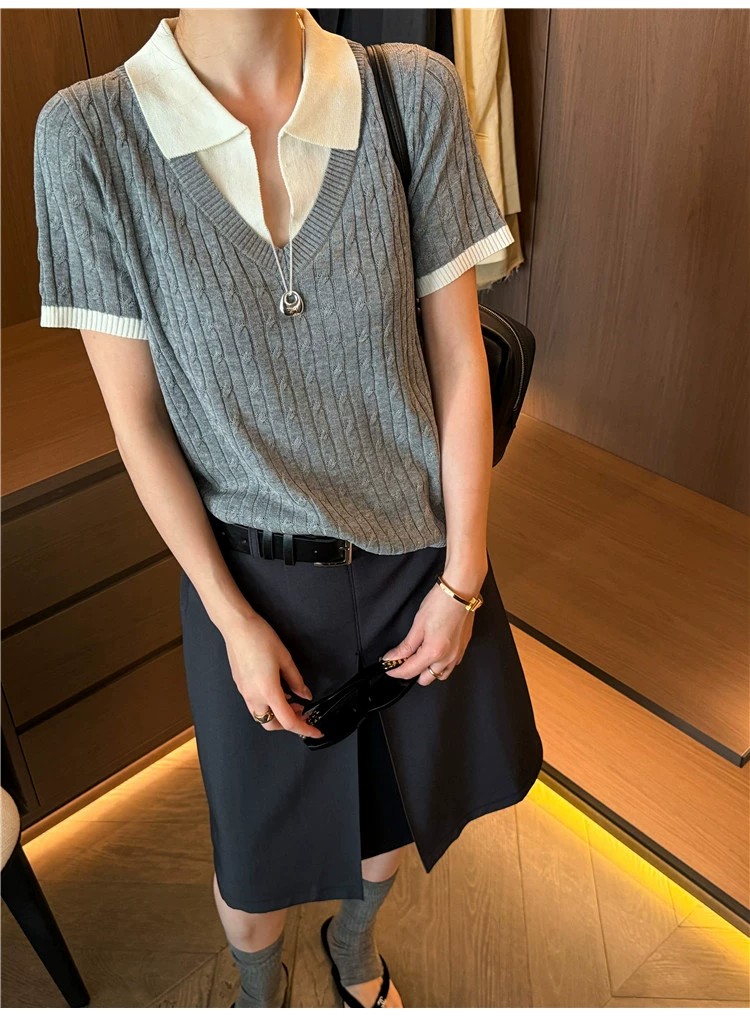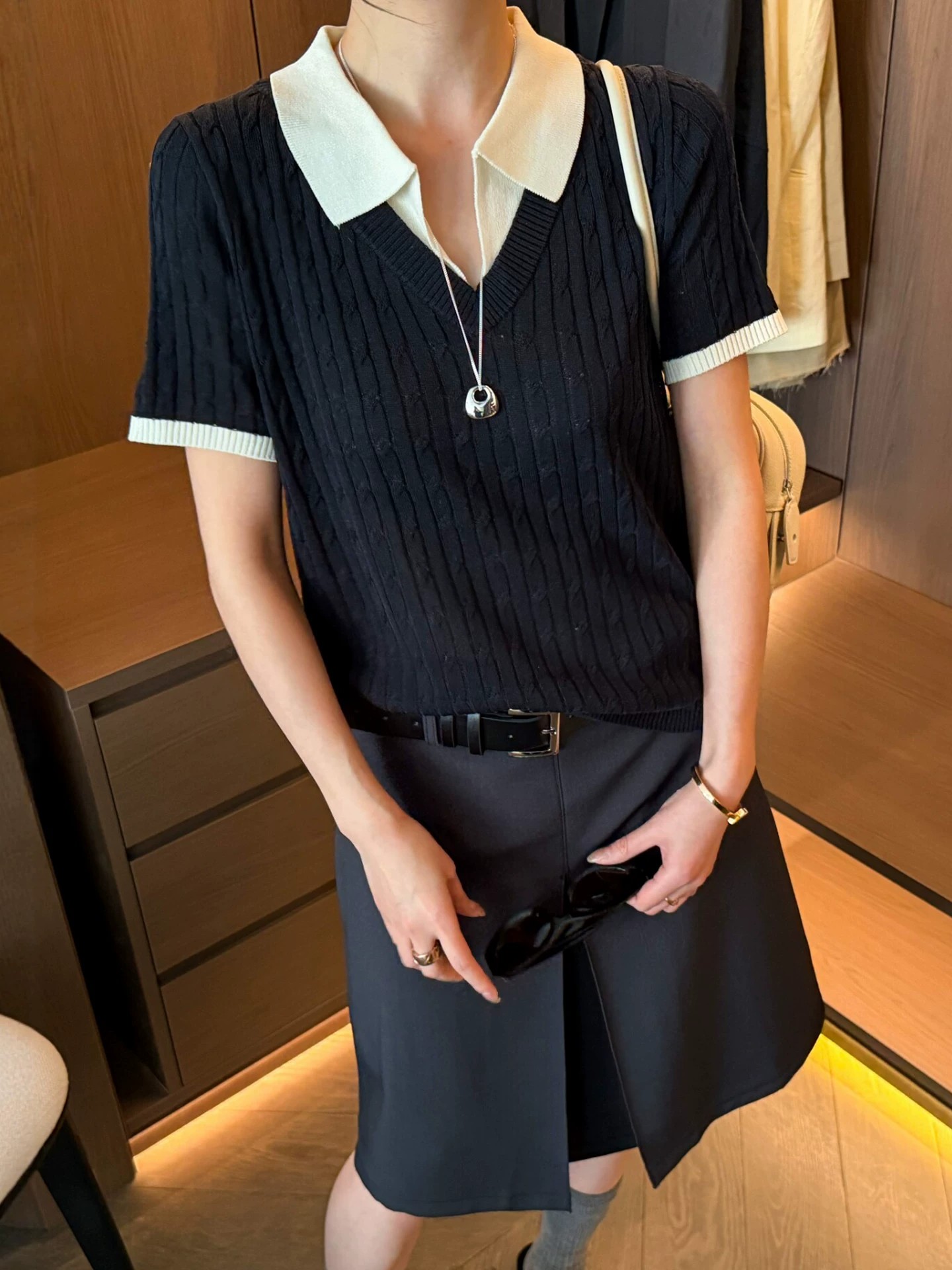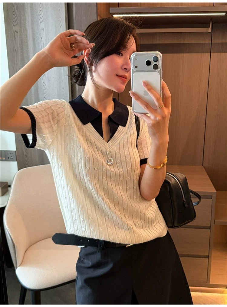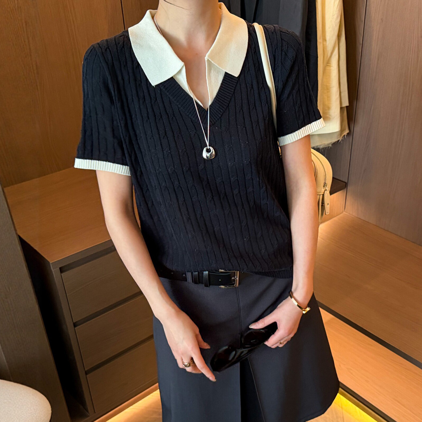 all in 여름 2026 새로운 한 부서 디자인 센스 행침 목 페이크 레이어드 니트 스웨터 여성 배색 몸매 가꾸기 반팔 맨위