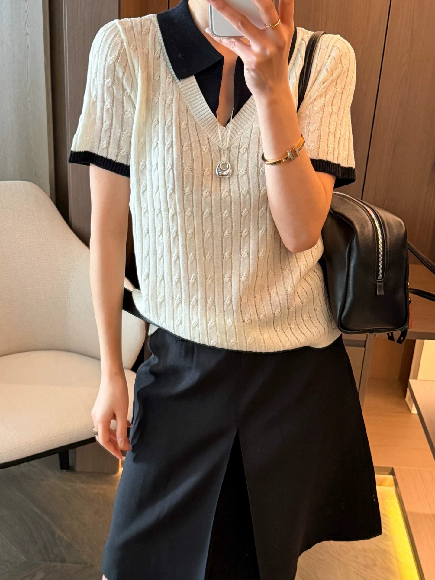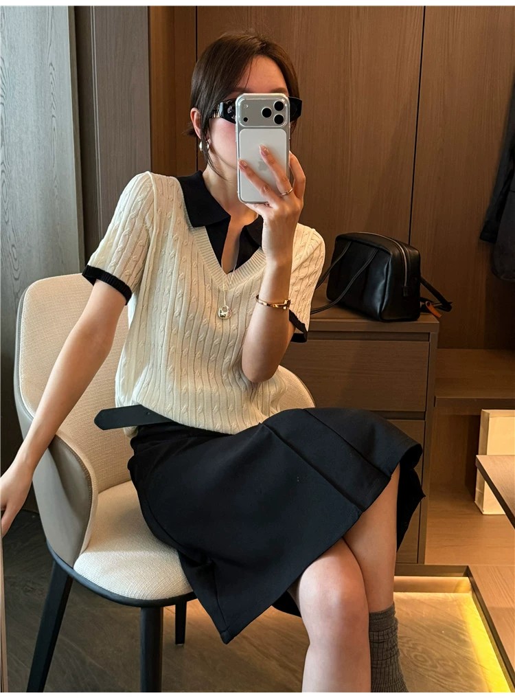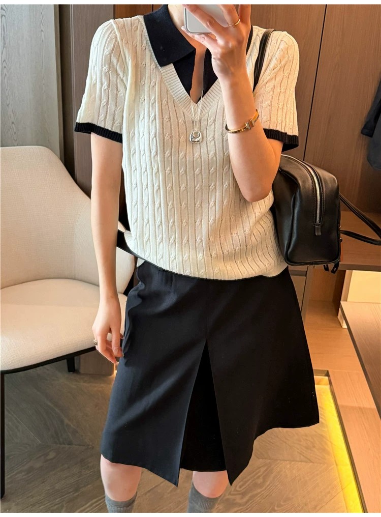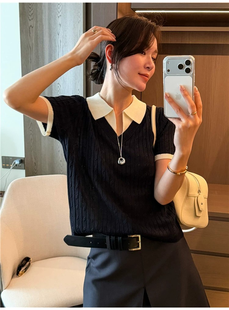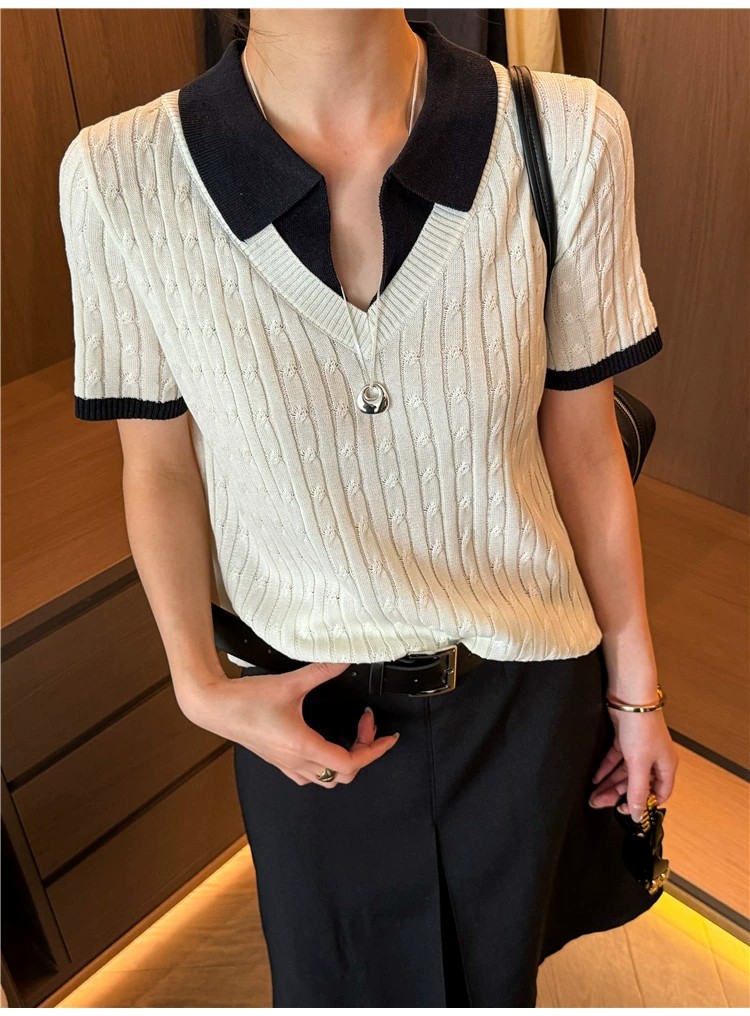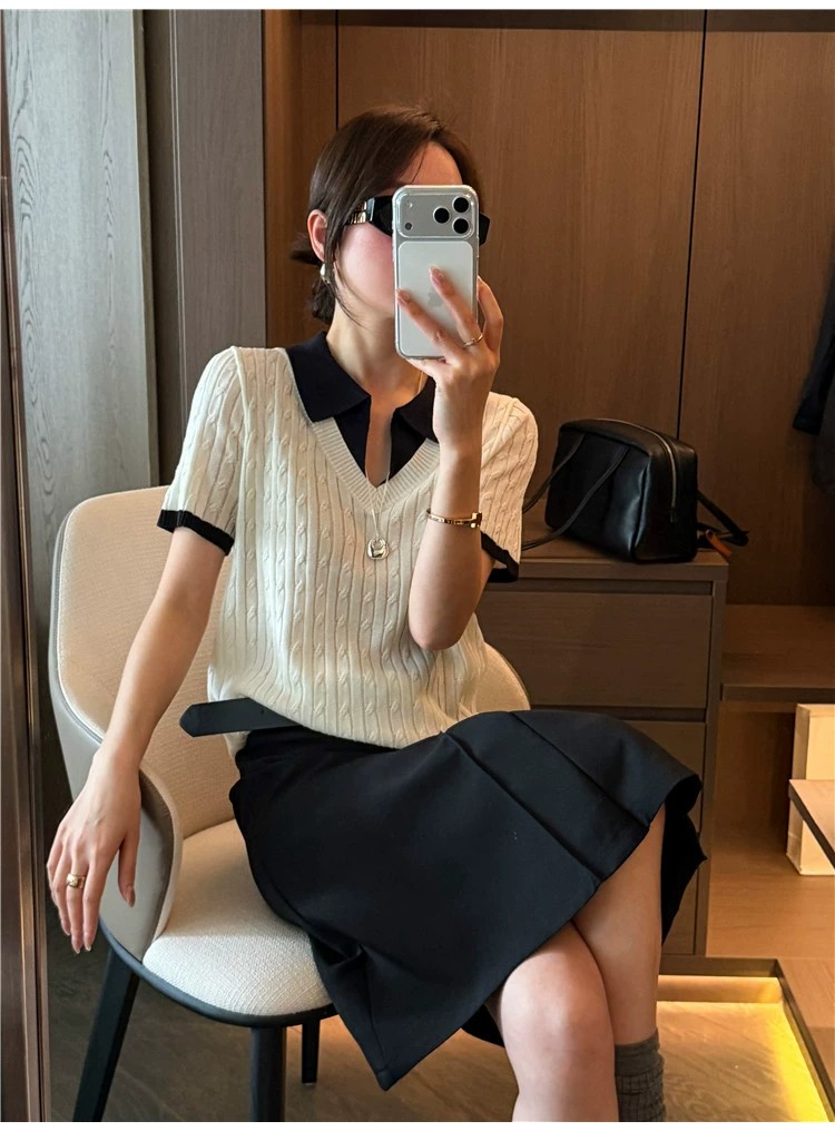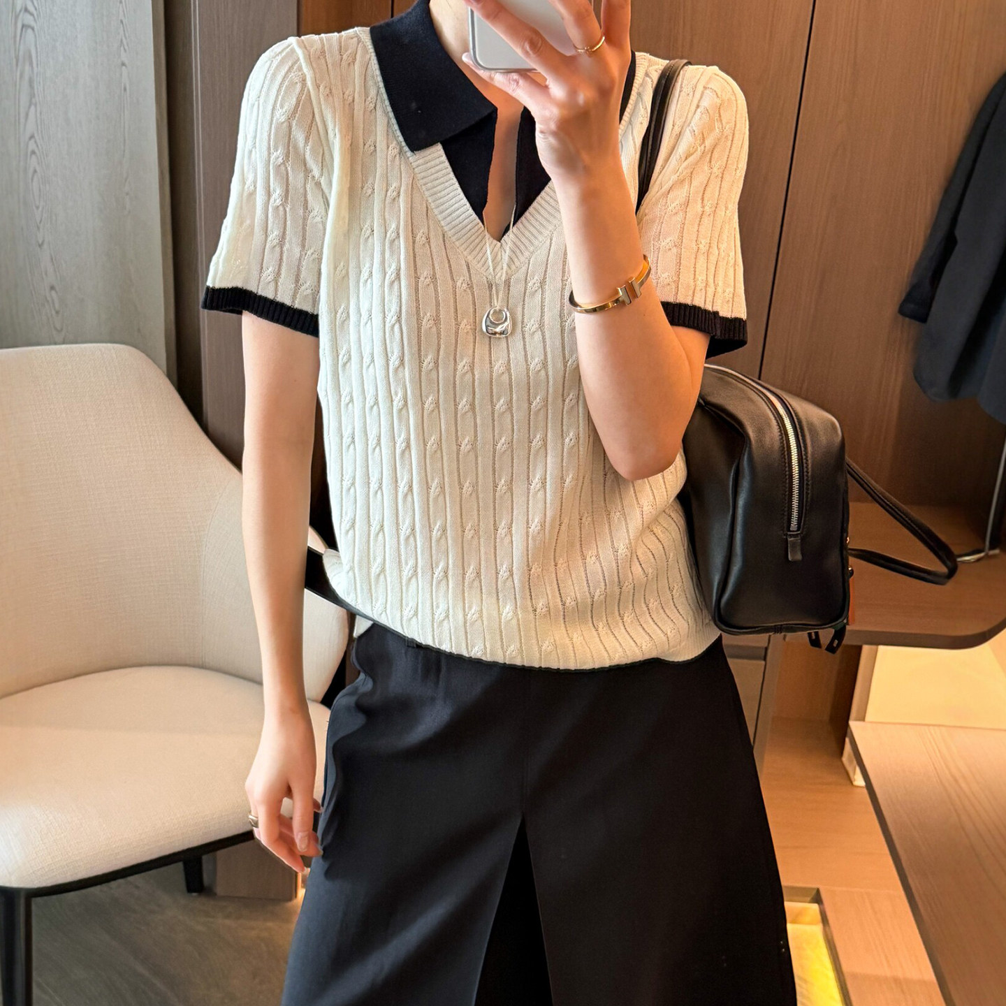 all in 여름 2026 새로운 한 부서 디자인 센스 행침 목 페이크 레이어드 니트 스웨터 여성 배색 몸매 가꾸기 반팔 맨위